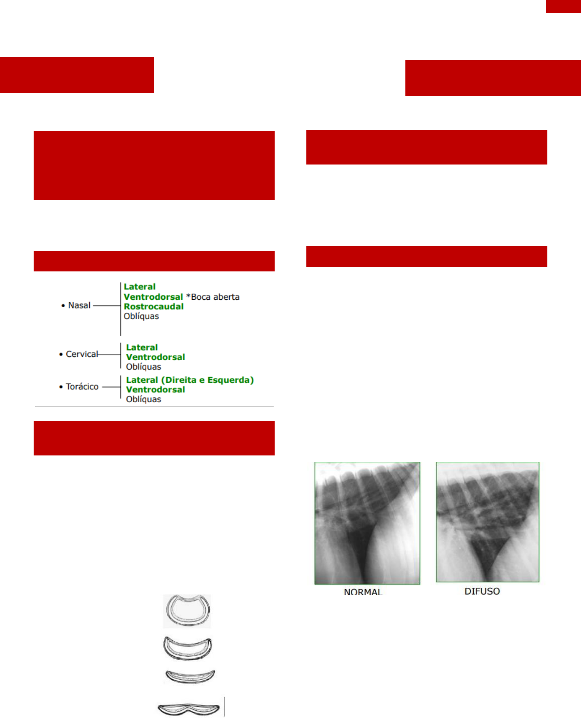 1 Diagnóstico por Imagem – Débora Medeiros Radiologia do trato respiratório Projeções radiológicas Segmentos Respiratórios Traqueia Corpo estranho Deslocamento Colapso Ruptura Cervical Colapso de traqueia Grau I.– 25% ↓diâmetro II.– 50% ↓ diâmetro III.– 75% ↓ diâmetro IV.– 100% ↓ diâmetro Pulmão Padrões radiológicos pulmonares Intersticial Linear Infiltração tecidual, celular ou fluídos no interstício pulmonar. Achados radiográficos ► Aumento da Radiopacidade ► Diminuição definição das margens vasculares pulmonares ► Marcações em linha não vasculares Nodular Multiplicação de células intersticiais Simples ou Múltiplos nódulos radiopacos ► Miliar 0,3 - 0,5 cm ► Nódulo 0,5 - 3 cm ► Massa > 3 cm Radiografia do Sistema Cardiorrespiratório 2 Diagnóstico por Imagem – Débora Medeiros Alveolar Causado pelo deslocamento do ar do interior do alvéolo. ► Acúmulo de fluidos ► Infiltração celular ► Atelectasia Sinais radiológicos: ► Opacidade em “penugem” ► Áreas de ↑ opacidade sem visualização de vasos ► Visualização de fissuras interlobares ► Broncograma aéreo Padrão Pulmonar Bronquial ► Espessamento (infiltração de fluidos ou células) ► Espaço peribrônquico com fluido ou células Sinais Radiológicos ► Opacidade tipo anel (“rosquinhas”) ► Opacidade em linhas paralelas (“linhas de trem”) Infiltrado Peribronquial Bronquiectasia Dilatação e saculação bronquial Decorrência de: Bronquite crônica Broncopneumonia de decúbito 3 Diagnóstico por Imagem – Débora Medeiros Padrão Pulmonar Vascular Hipervascularização (insuficiência cardíaca, obstrução atrial, doença tromboembólica, doença pulmonar, desvio direita-esquerda...) Hipovascularização (hipovolemia, choque, desidratação, estenose pulmonar, desvio direita-esquerda...) Padrões Pulmonares Pneumotórax Presença de ar livre no interior da cavidade pleural Sinais radiológicos ► Deslocamento do coração no sentido dorsal ► Maior radiolucência em periferia Mediastino Espaço entre os dois sacos separando fisicamente os dois hemitórax. Tumores Pneumomediastino Visualização de estruturas que são normalmente ocultas: ► Borda serosa da traqueia ► Tronco braquiocefálico ► Veia cava cranial ► Subclávia esquerda ► Borda exterior do esôfago 4 Diagnóstico por Imagem – Débora Medeiros ► Pneumomediastino ► Normal Diafragma Momento inspiratório favorece o contraste nas projeções lateral e VD/DV. Hérnia Diafragmática Peritônio Pericárdica (congênita) Hérnia Diafragmática Traumática (adquirida) Radiologia do Coração Método Buchanan & Bücheler VHS = Vertebral Heart System ► Felinos: 6,8 - 8,1 corpos vertebrais ► Caninos: 8,5 - 10,6 corpos vertebrais Exceções Variações raciais 5 Diagnóstico por Imagem – Débora Medeiros Aumento cardíaco ► DIREITO ► ESQUERDO ► GENERALIZADO Aumento câmaras direitas Lateral ► Maior volume da silhueta cardíaca em região cranial; ► Perda da convexidade do bordo cranial cardíaco; ► Maior área de contato do coração com o esterno. *Variação de contato do coração com o esterno =raças caninas; ► Menor ângulo formado entre a cava cranial e o bordo cranial cardíaco ► Elevação da traqueia na porção cranial da traqueia (anterior à carina) (ocasionalmente). Dorsoventral/ Ventrodorsal ► Maior volume da silhueta cardíaca, ocupando + de 2/3 da cavidade torácica; ► Arredondamento do bordo cardíaco direito = coração em D invertido; ► Ápice cardíaco poderá estar + à esquerda que o normal. D Invertido Aumento das câmaras esquerdas Lateral ► Elevação dorsal da porção caudal da traqueia; ► Bordo cardíaco caudal se apresenta mais reto e mais vertical do que o normal; ► Elevação da cava posterior; ► Protuberância em região dorsocaudal ► Protuberância em região caudoventral. 6 Diagnóstico por Imagem – Débora Medeiros Dorsoventral / Ventrodorsal ► Maior silhueta cardíaca em região esquerda; ► Arredondamento do bordo cardíaco esquerdo; ► Proeminência do átrio esquerdo/aurícula esquerda (posição 2-3h na analogia do relógio) ► Ápice cardíaco poderá estar deslocado para a direita. Cardiomegalia Generalizada 7 Diagnóstico por Imagem – Débora Medeiros RADIOGRAFIA DO SISTEMA DIGESTÓRIO Preparo do paciente ► Jejum sólido de 12-24 h ► Enema 1 – 2 h antes do exame (expulsão de gases e líquidos do cólon) ► Realizar o RX SIMPLES (obrigatório) mediatamente antes do contrastado ► Não realizar o exame sem preparo ► Não permitir a ingestão de água 2 h antes do exame contrastado (diluição do bário) ► Meios de contraste AR Bário Prejudicial a cavidade abdominal = NÃO USAR EM RUPTURAS / LACERAÇÕES Iodo Orgânico Iônico ► Hidrossolúvel = Inócuo à cavidade peritoneal ► Trânsito rápido ► Hipertonicidade = passagem de líquido dostecidos ao TGI = CUIDAR DESIDRATAÇÃO! ► Pode ocorrer diarreia e vômito Edema pulmonar se for aspirado Iodo Orgânico não Iônico ► Não é hipertônico ► Não reveste muito bem a mucosa 8 Diagnóstico por Imagem – Débora Medeiros Tempos radiográficos Esôfago Interpretação Radiográfica Avaliar: ► TRAJETO ► MUCOSA ► FALHAS DE PREENCHIMENTO ► LÚMEN Aumento de volume esofágico POSSÍVEL VISUALIZAÇÃO EMEXAMES RADIOLÓGICOS SIMPLES Localizado Divertículo Esofágico ► Lesões Camada Muscular ► Lesões SNP ► Generalizado Megaesôfago ► Lesões SNC ► Hipoadrenocorticismo ► Miastenia Grave ► Polimiosite ► Tétano... Anomalia Vascular Anelar Persistência Do Arco Aórtico Direito ► Anomalia Vascular Congênita ► Constrição pelo Ligamento Arterioso ► Base do Coração ► Regurgitação Persistente ► Pneumonia Persistente Corpo Estranho Esofágico 9 Diagnóstico por Imagem – Débora Medeiros Ruptura de esôfago Cavidade abdominal Estômago Tamanho: três espaços intercostais Dis
