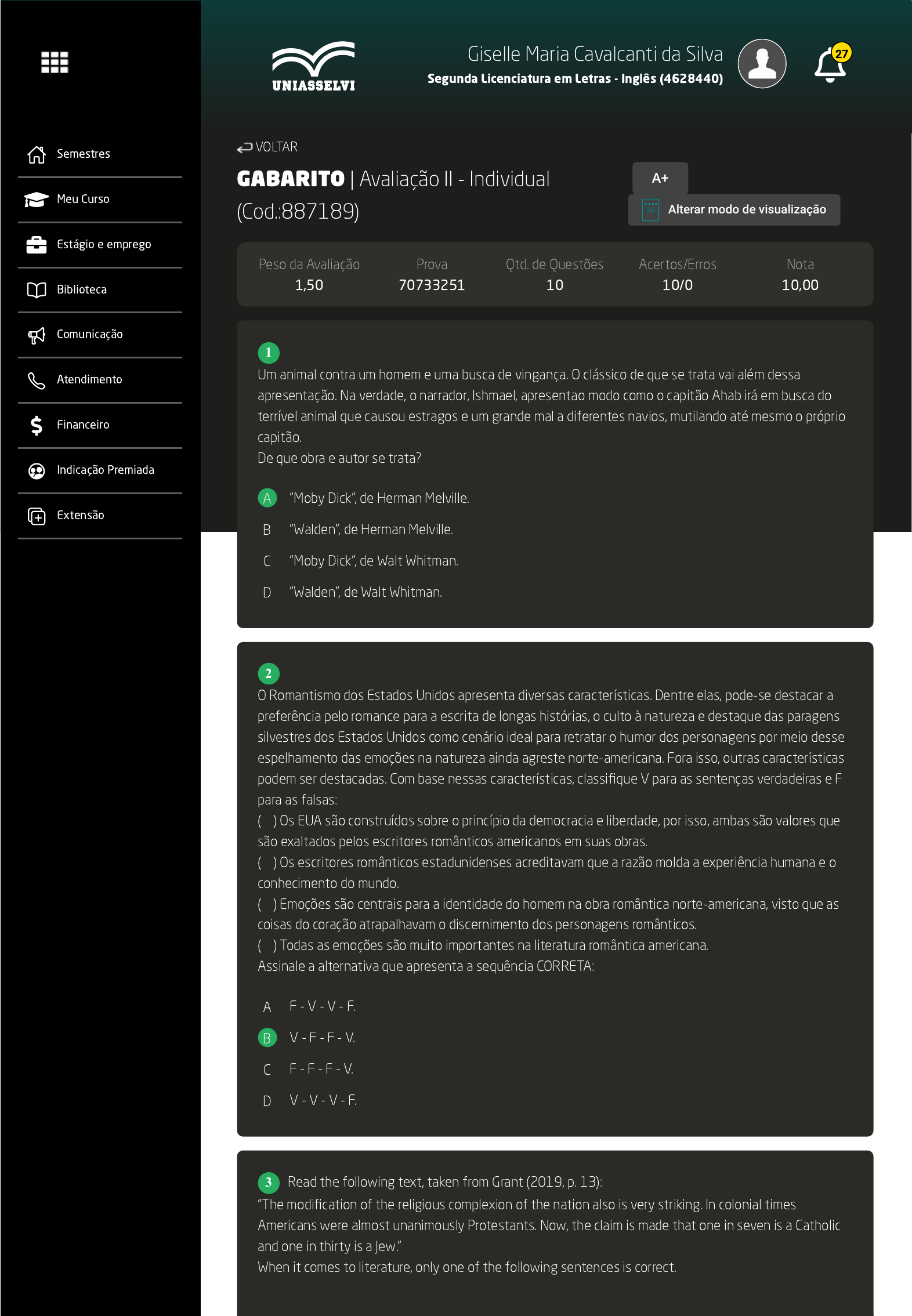 03/10/23, 15:27 AVA https://ava2.uniasselvi.com.br/subject/grades-and-tests/answer-book/eyJ0ZXN0Ijp7InRlc3RDb2RlIjoiODg3MTg5IiwiZGVzY3JpcHRpb24iOiJBdmFsaWHDp8OjbyBJSSAtIEluZGl2aWR1YWwiLCJwYXJhbWV0ZXIiOjU… 1/4 GABARITO | Avaliação II - Individual (Cod.:887189) Peso da Avaliação 1,50 Prova 70733251 Qtd. de Questões 10 Acertos/Erros 10/0 Nota 10,00 Um animal contra um homem e uma busca de vingança. O clássico de que se trata vai além dessa apresentação. Na verdade, o narrador, Ishmael, apresentao modo como o capitão Ahab irá em busca do terrível animal que causou estragos e um grande mal a diferentes navios, mutilando até mesmo o próprio capitão. De que obra e autor se trata? A "Moby Dick", de Herman Melville. B "Walden", de Herman Melville. C "Moby Dick", de Walt Whitman. D "Walden", de Walt Whitman. O Romantismo dos Estados Unidos apresenta diversas características. Dentre elas, pode-se destacar a preferência pelo romance para a escrita de longas histórias, o culto à natureza e destaque das paragens silvestres dos Estados Unidos como cenário ideal para retratar o humor dos personagens por meio desse espelhamento das emoções na natureza ainda agreste norte-americana. Fora isso, outras características podem ser destacadas. Com base nessas características, classifique V para as sentenças verdadeiras e F para as falsas: ( ) Os EUA são construídos sobre o princípio da democracia e liberdade, por isso, ambas são valores que são exaltados pelos escritores românticos americanos em suas obras. ( ) Os escritores românticos estadunidenses acreditavam que a razão molda a experiência humana e o conhecimento do mundo. ( ) Emoções são centrais para a identidade do homem na obra romântica norte-americana, visto que as coisas do coração atrapalhavam o discernimento dos personagens românticos. ( ) Todas as emoções são muito importantes na literatura romântica americana. Assinale a alternativa que apresenta a sequência CORRETA: A F - V - V - F. B V - F - F - V. C F - F - F - V. D V - V - V - F. Read the following text, taken from Grant (2019, p. 13): “The modification of the religious complexion of the nation also is very striking. In colonial times Americans were almost unanimously Protestants. Now, the claim is made that one in seven is a Catholic and one in thirty is a Jew.” When it comes to literature, only one of the following sentences is correct. VOLTAR A+ Alterar modo de visualização 1 2 3 Giselle Maria Cavalcanti da Silva Segunda Licenciatura em Letras - Inglês (4628440) 27 Semestres Meu Curso Estágio e emprego Biblioteca Comunicação Atendimento Financeiro Indicação Premiada Extensão https://ava2.uniasselvi.com.br/home https://ava2.uniasselvi.com.br/my-course https://ava2.uniasselvi.com.br/internships-and-jobs https://ava2.uniasselvi.com.br/communication https://ava2.uniasselvi.com.br/attendance https://ava2.uniasselvi.com.br/financial https://ava2.uniasselvi.com.br/award-indication https://ava2.uniasselvi.com.br/extension 03/10/23, 15:27 AVA https://ava2.uniasselvi.com.br/subject/grades-and-tests/answer-book/eyJ0ZXN0Ijp7InRlc3RDb2RlIjoiODg3MTg5IiwiZGVzY3JpcHRpb24iOiJBdmFsaWHDp8OjbyBJSSAtIEluZGl2aWR1YWwiLCJwYXJhbWV0ZXIiOjU… 2/4 FONTE: GRANT, M. The Conquest of a continent. August 21, 2019 E-book: #60145. Projeto Gutenberg. Disponível em: www.gutenberg.org/licence. Acesso em: 24 ago. 2022. Check the CORRECT answer: A Walt Whitman focused on religion and puritan values in his epic poem The Timberland (1730). B Nathaniel Hawthorne focused on religion and puritan values in his novel The Scarlet Letter (1850). C Ralph Waldo Emerson was a Jew that preached his faith in the newspapers in Pennsylvania (1800). D Ernest Hemingway greatly contributed to spreading Catholicism during the Civil War. "The Scarlet Letter", by Nathaniel Hawthorne has achieved huge success, not only in literature and North-America but also by migrating to other genders and places. Thus, the story has been adapted to the movies, to cartoons and also to the theater. In the story, the character of Hester Pryne is condemned to wear the letter "A" on her chest because of something she has done. According to the story, this punishment has a particular meaning. What, precisely, does it mean? A Adulteress, for betrayal. B Admirable example. C Awesome experience. D Adventurer and faultive. Ralph Valdo Emerson is an American writer who belongs to the Romanticism literary movement. The Rhodora is one of his poems. Read these lines of the poem and then the statements: "[...] Rhodora! if the sages ask thee why This charm is wasted on the earth and sky, Tell them, dear, that if eyes were made for seeing, Then Beauty is its own excuse for being; [...]" I- Some characteristics of Romanticism appear in this excerpt. II- Nature personifies as the poet addresses himself to the flower. III- According to the poet, eyes are only made for seeing. IV- The beauty of the flower is not important. Check the right answer: A III and IV are correct. B I and II are correct. C I and III are correct. D II and IV are correct. The Romanticism period in North American literature was a period of deep feelings, nature apology, emotions, and individualism. This, among other aspects, can be clearly seen in the poems of Ralph Waldo Emmerson and Walt Whitman. Associate the items, author and characteristics that appear in their works: I- Ralph Waldo Emmerson. II- Walt Whitman. ( ) The flower represents beauty in all its aspects. ( ) His poetry, which was very clear and written in an accessible language, was addressed to the common people. ( ) Nature, liberty, democracy ideal, individualism were some of the topics he treated in his poems. ( ) Actually, he mastered the essay's gender, but also produced some enchanting poetry. 4 5 6 Giselle Maria Cavalcanti da Silva Segunda Licenciatura em Letras - Inglês (4628440) 27 Semestres Meu Curso Estágio e emprego Biblioteca Comunicação Atendimento Financeiro Indicaçã