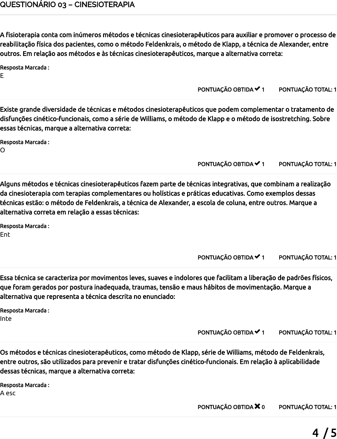 4 / 5 QUESTIONÁRIO 03 – CINESIOTERAPIA PONTUAÇÃO TOTAL: 1PONTUAÇÃO OBTIDA 1 A �sioterapia conta com inúmeros métodos e técnicas cinesioterapêuticos para auxiliar e promover o processo de reabilitação física dos pacientes, como o método Feldenkrais, o método de Klapp, a técnica de Alexander, entre outros. Em relação aos métodos e às técnicas cinesioterapêuticos, marque a alternativa correta: Resposta Marcada : Entre os objetivos desses métodos estão a redução da dor e a melhora da força e da �exibilidade muscular. PONTUAÇÃO TOTAL: 1PONTUAÇÃO OBTIDA 1 Existe grande diversidade de técnicas e métodos cinesioterapêuticos que podem complementar o tratamento de disfunções cinético-funcionais, como a série de Williams, o método de Klapp e o método de isostretching. Sobre essas técnicas, marque a alternativa correta: Resposta Marcada : O método de Klapp foi desenvolvido para tratar a escoliose, que é uma alteração postural. PONTUAÇÃO TOTAL: 1PONTUAÇÃO OBTIDA 1 Alguns métodos e técnicas cinesioterapêuticos fazem parte de técnicas integrativas, que combinam a realização da cinesioterapia com terapias complementares ou holísticas e práticas educativas. Como exemplos dessas técnicas estão: o método de Feldenkrais, a técnica de Alexander, a escola de coluna, entre outros. Marque a alternativa correta em relação a essas técnicas: Resposta Marcada : Entre os objetivos da técnica de Alexander está a redução das tensões excessivas por meio de técnicas respiratórias e posturais. PONTUAÇÃO TOTAL: 1PONTUAÇÃO OBTIDA 1 Essa técnica se caracteriza por movimentos leves, suaves e indolores que facilitam a liberação de padrões físicos, que foram gerados por postura inadequada, traumas, tensão e maus hábitos de movimentação. Marque a alternativa que representa a técnica descrita no enunciado: Resposta Marcada : Integração psicofísica de Trager. PONTUAÇÃO TOTAL: 1PONTUAÇÃO OBTIDA 0 Os métodos e técnicas cinesioterapêuticos, como método de Klapp, série de Williams, método de Feldenkrais, entre outros, são utilizados para prevenir e tratar disfunções cinético-funcionais. Em relação à aplicabilidade dessas técnicas, marque a alternativa correta: Resposta Marcada : A escola de coluna só deve ser aplicada em disfunções cinético-funcionais agudas da coluna lombar. Total de Pontos