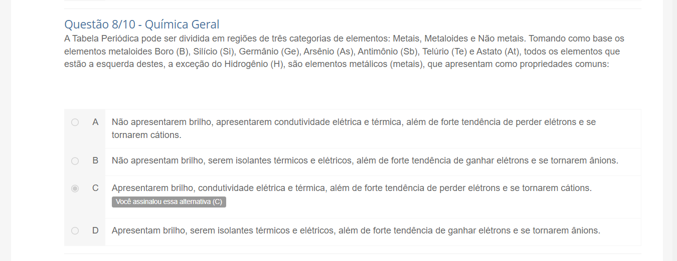 Assinale a alternativa incorreta a respeito da condutividade térmica nos metais: Questão 7Escolha uma opção: a. Metais são ótimos condutores de...