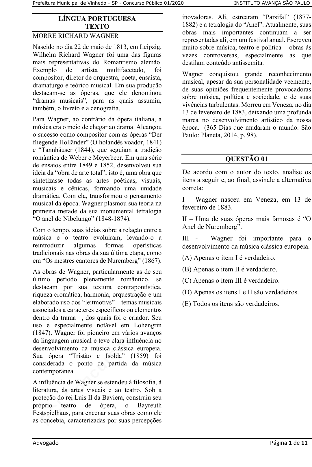 pcimarkpci MDAwMDowMDAwOjAwMDA6MDAwMDowMDAwOmZmZmY6YjExNjo3OGE2:VHVlLCAzMSBPY3QgMjAyMyAyMjo1MTo0NSAtMDMwMA== www.pciconcursos.com.br Prefeitura Municipal de Vinhedo - SP - Concurso Público 01/2020 INSTITUTO AVANÇA SÃO PAULO Advogado Página 1 de 11 LÍNGUA PORTUGUESA TEXTO MORRE RICHARD WAGNER Nascido no dia 22 de maio de 1813, em Leipzig, Wilhelm Richard Wagner foi uma das figuras mais representativas do Romantismo alemão. Exemplo de artista multifacetado, foi compositor, diretor de orquestra, poeta, ensaísta, dramaturgo e teórico musical. Em sua produção destacam-se as óperas, que ele denominou “dramas musicais”, para as quais assumiu, também, o livreto e a cenografia. Para Wagner, ao contrário da ópera italiana, a música era o meio de chegar ao drama. Alcançou o sucesso como compositor com as óperas “Der fliegende Holländer” (O holandês voador, 1841) e “Tannhäuser (1844), que seguiam a tradição romântica de Weber e Meyerbeer. Em uma série de ensaios entre 1849 e 1852, desenvolveu sua ideia da “obra de arte total”, isto é, uma obra que sintetizasse todas as artes poéticas, visuais, musicais e cênicas, formando uma unidade dramática. Com ela, transformou o pensamento musical da época. Wagner plasmou sua teoria na primeira metade da sua monumental tetralogia “O anel do Nibelungo” (1848-1874). Com o tempo, suas ideias sobre a relação entre a música e o teatro evoluíram, levando-o a reintroduzir algumas formas operísticas tradicionais nas obras da sua última etapa, como em “Os mestres cantores de Nuremberg” (1867). As obras de Wagner, particularmente as de seu último período plenamente romântico, se destacam por sua textura contrapontística, riqueza cromática, harmonia, orquestração e um elaborado uso dos “leitmotivs” – temas musicais associados a caracteres específicos ou elementos dentro da trama –, dos quais foi o criador. Seu uso é especialmente notável em Lohengrin (1847). Wagner foi pioneiro em vários avanços da linguagem musical e teve clara influência no desenvolvimento da música clássica europeia. Sua ópera “Tristão e Isolda” (1859) foi considerada o ponto de partida da música contemporânea. A influência de Wagner se estendeu à filosofia, à literatura, às artes visuais e ao teatro. Sob a proteção do rei Luis II da Baviera, construiu seu próprio teatro de ópera, o Bayreuth Festspielhaus, para encenar suas obras como ele as concebia, caracterizadas por suas percepções inovadoras. Ali, estrearam “Parsifal” (1877- 1882) e a tetralogia do “Anel”. Atualmente, suas obras mais importantes continuam a ser representadas ali, em um festival anual. Escreveu muito sobre música, teatro e política – obras às vezes controversas, especialmente as que destilam conteúdo antissemita. Wagner conquistou grande reconhecimento musical, apesar da sua personalidade veemente, de suas opiniões frequentemente provocadoras sobre música, política e sociedade, e de suas vivências turbulentas. Morreu em Veneza, no dia 13 de fevereiro de 1883, deixando uma profunda marca no desenvolvimento artístico da nossa época. (365 Dias que mudaram o mundo. São Paulo: Planeta, 2014, p. 98). QUESTÃO 01 De acordo com o autor do texto, analise os itens a seguir e, ao final, assinale a alternativa correta: I – Wagner nasceu em Veneza, em 13 de fevereiro de 1883. II – Uma de suas óperas mais famosas é “O Anel de Nuremberg”. III - Wagner foi importante para o desenvolvimento da música clássica europeia. (A) Apenas o item I é verdadeiro. (B) Apenas o item II é verdadeiro. (C) Apenas o item III é verdadeiro. (D) Apenas os itens I e II são verdadeiros. (E) Todos os itens são verdadeiros. pcimarkpci MDAwMDowMDAwOjAwMDA6MDAwMDowMDAwOmZmZmY6YjExNjo3OGE2:VHVlLCAzMSBPY3QgMjAyMyAyMjo1MTo0NSAtMDMwMA== www.pciconcursos.com.br Prefeitura Municipal de Vinhedo - SP - Concurso Público 01/2020 INSTITUTO AVANÇA SÃO PAULO Advogado Página 2 de 11 QUESTÃO 02 De acordo com o autor do texto, analise os itens a seguir e, ao final, assinale a alternativa correta: I – Além da música, Wagner também se tornou conhecido por suas ideias antissemitas. II – Wagner financiou o rei Luis II da Baviera na construção de um teatro. III - A ópera Lohengrin foi considerada o ponto de partida da música contemporânea. (A) Apenas o item I é verdadeiro. (B) Apenas o item II é verdadeiro. (C) Apenas o item III é verdadeiro. (D) Apenas os itens II e III são verdadeiros. (E) Todos os itens são verdadeiros. QUESTÃO 03 De acordo com o autor do texto, analise os itens a seguir e, ao final, assinale a alternativa correta: I – Wagner foi um expoente do Realismo alemão. II – No campo musical, pode-se afirmar que Wagner era uma pessoa multitalentosa. III – O conceito de musicalidade de Wagner era o mesmo dos italianos. (A) Apenas o item I é verdadeiro. (B) Apenas o item II é verdadeiro. (C) Apenas o item III é verdadeiro. (D) Apenas os itens I e III são verdadeiros. (E) Todos os itens são verdadeiros. QUESTÃO 04 Assinale a alternativa que NÃO apresenta um sinônimo para a palavra “multifacetado”, usada pelo autor no início do texto: (A) variado. (B) multiforme. (C) multímodo. (D) heterogêneo. (E) simples. QUESTÃO 05 Na oração “As obras de Wagner, particularmente (...)”, a palavra “particularmente” pode ser definida como: (A) adjetivo. (B) advérbio. (C) conjunção. (D) locução motora. (E) preposição. QUESTÃO 06 “Wagner plasmou sua teoria na primeira metade da sua monumental tetralogia (...)”. O verbo plasmar/plasmou pode ser substituído por EXCETO: (A) esculpiu. (B) moldou. (C) modelou. (D) incentivou. (E) formou. QUESTÃO 07 No que se refere ao correto uso da crase, analise os itens a seguir e, ao final, assinale a alternativa correta: I – As bailarinas devem viajar à Romênia. II – Eles preferem ir à Lisboa. III – Os empresários vão à Jamaica. (A) Apenas o item I é verdade