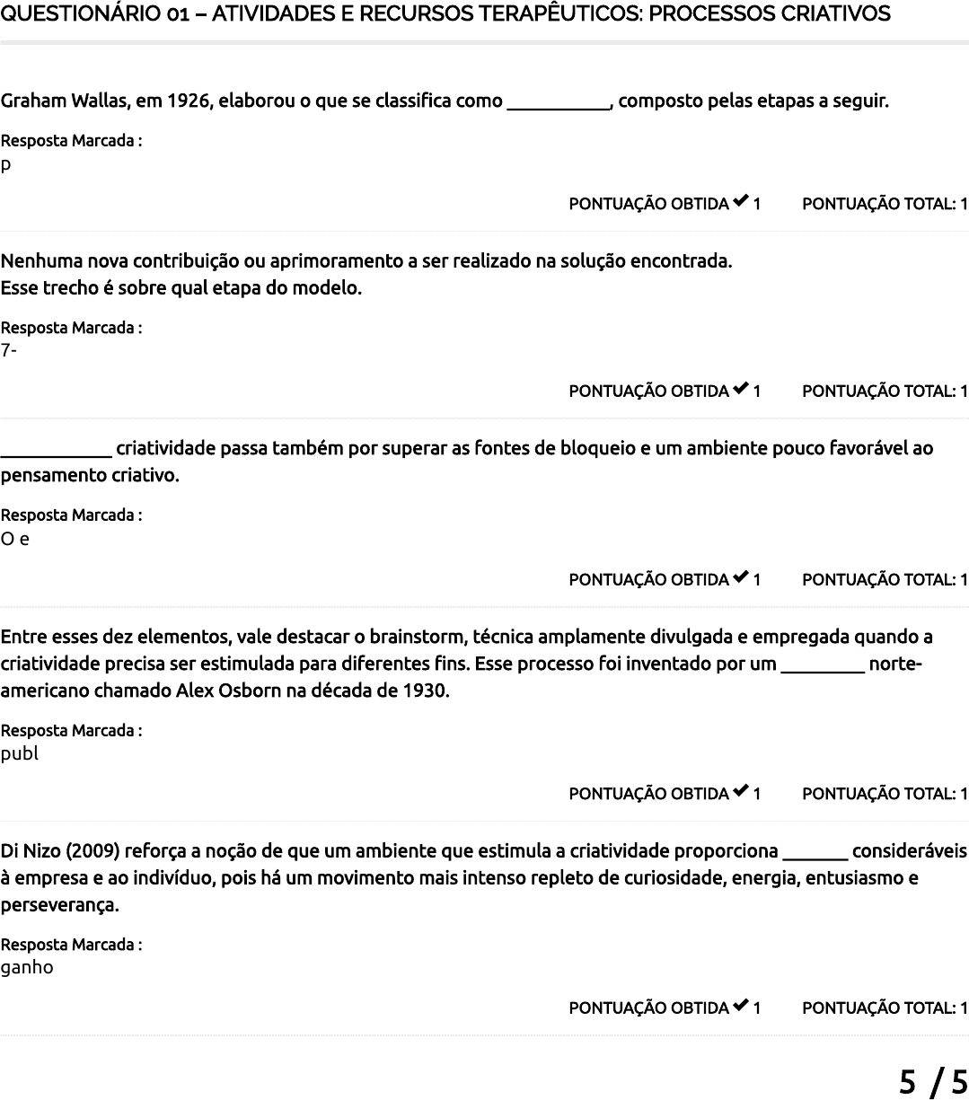 02/11/2023, 17:05 Course Status – AVA Saúde Unifaveni https://ava.saude.unifaveni.com.br/course-status/ 1/1 5 / 5 QUESTIONÁRIO 01 – ATIVIDADES E RECURSOS TERAPÊUTICOS: PROCESSOS CRIATIVOS PONTUAÇÃO TOTAL: 1PONTUAÇÃO OBTIDA 1 Graham Wallas, em 1926, elaborou o que se classi�ca como ___________, composto pelas etapas a seguir. Resposta Marcada : primeiro modelo do pensamento criativo. PONTUAÇÃO TOTAL: 1PONTUAÇÃO OBTIDA 1 Nenhuma nova contribuição ou aprimoramento a ser realizado na solução encontrada. Esse trecho é sobre qual etapa do modelo. Resposta Marcada : 7- �m da evolução do produto ou serviço. PONTUAÇÃO TOTAL: 1PONTUAÇÃO OBTIDA 1 ____________ criatividade passa também por superar as fontes de bloqueio e um ambiente pouco favorável ao pensamento criativo. Resposta Marcada : O estímulo à. PONTUAÇÃO TOTAL: 1PONTUAÇÃO OBTIDA 1 Entre esses dez elementos, vale destacar o brainstorm, técnica amplamente divulgada e empregada quando a criatividade precisa ser estimulada para diferentes �ns. Esse processo foi inventado por um _________ norte- americano chamado Alex Osborn na década de 1930. Resposta Marcada : publicitário. PONTUAÇÃO TOTAL: 1PONTUAÇÃO OBTIDA 1 Di Nizo (2009) reforça a noção de que um ambiente que estimula a criatividade proporciona _______ consideráveis à empresa e ao indivíduo, pois há um movimento mais intenso repleto de curiosidade, energia, entusiasmo e perseverança. Resposta Marcada : ganhos. Total de Pontos