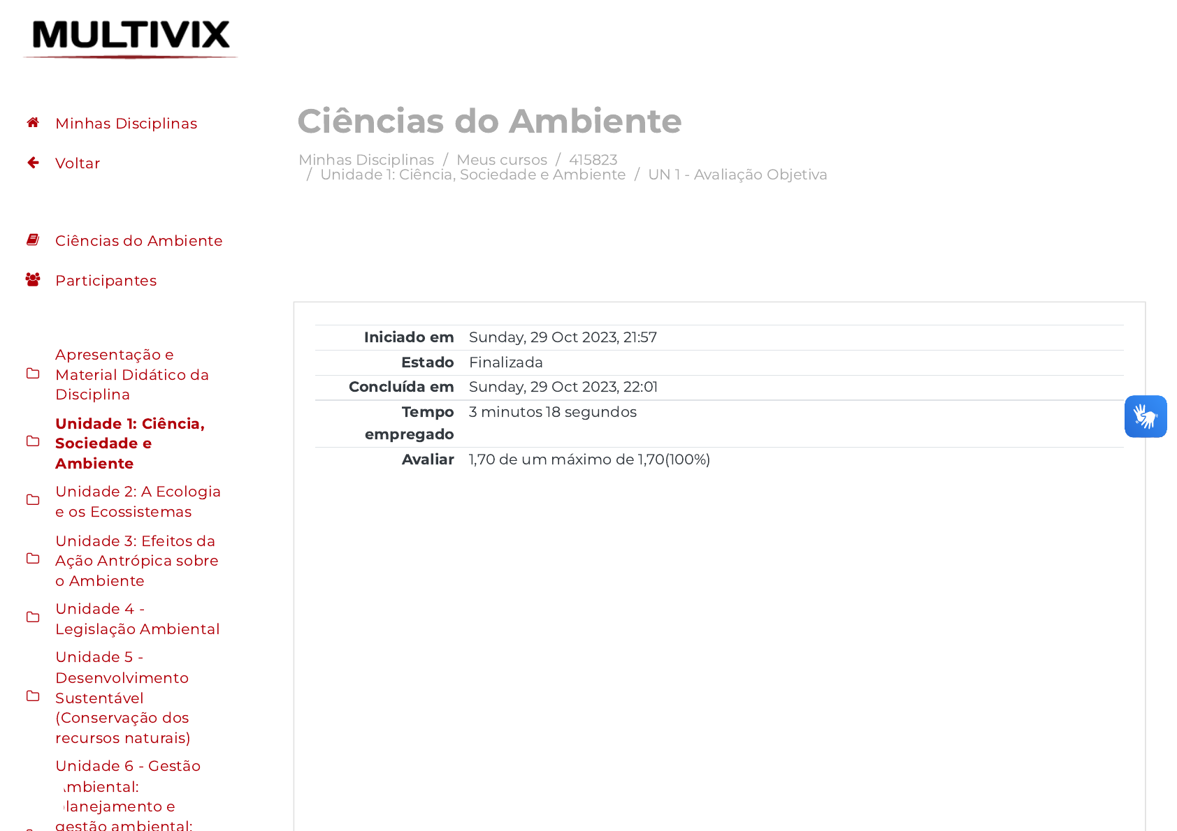 Minhas Disciplinas / Meus cursos / 415823 / Unidade 1: Ciência, Sociedade e Ambiente / UN 1 - Avaliação Objetiva Ciências do Ambiente Iniciado em Sunday, 29 Oct 2023, 21:57 Estado Finalizada Concluída em Sunday, 29 Oct 2023, 22:01 Tempo empregado 3 minutos 18 segundos Avaliar 1,70 de um máximo de 1,70(100%) Minhas Disciplinas Voltar Ciências do Ambiente Participantes Apresentação e Material Didático da Disciplina Unidade 1: Ciência, Sociedade e Ambiente Unidade 2: A Ecologia e os Ecossistemas Unidade 3: Efeitos da Ação Antrópica sobre o Ambiente Unidade 4 - Legislação Ambiental Unidade 5 - Desenvolvimento Sustentável (Conservação dos recursos naturais) Unidade 6 - Gestão Ambiental: planejamento e gestão ambiental; https://avap.multivix.edu.br/my/ https://avap.multivix.edu.br/course/view.php?id=23558 https://avap.multivix.edu.br/course/view.php?id=23558§ion=2 https://avap.multivix.edu.br/mod/quiz/view.php?id=1527229 https://avap.multivix.edu.br/my/ https://avap.multivix.edu.br/course/view.php?id=23558 https://avap.multivix.edu.br/user/index.php?id=23558 https://avap.multivix.edu.br/course/view.php?id=23558§ion=1 https://avap.multivix.edu.br/course/view.php?id=23558§ion=2 https://avap.multivix.edu.br/course/view.php?id=23558§ion=3 https://avap.multivix.edu.br/course/view.php?id=23558§ion=4 https://avap.multivix.edu.br/course/view.php?id=23558§ion=5 https://avap.multivix.edu.br/course/view.php?id=23558§ion=6 https://avap.multivix.edu.br/course/view.php?id=23558§ion=7 https://avap.multivix.edu.br/ https://avap.multivix.edu.br/ https://avap.multivix.edu.br/ https://avap.multivix.edu.br/ https://avap.multivix.edu.br/ https://avap.multivix.edu.br/ https://avap.multivix.edu.br/ https://avap.multivix.edu.br/ https://avap.multivix.edu.br/ https://avap.multivix.edu.br/ https://avap.multivix.edu.br/ https://avap.multivix.edu.br/ Questão 1 Correto Atingiu 0,34 de 0,34 Através da história da ciência diferentes visões foram utilizadas para descrever e explicar a natureza e conceber conhecimentos o qual se estabeleceu peculiarmente nos diferentes contextos históricos e comunidades cientí�cas de cada época. Com relação à visão contemporânea de ciência, avalie as asserções a seguir e a relação proposta entre elas. I. Na história da ciência ocidental, sempre houve uma grande pluralidade de tendências, paradigmas ou escolas, que surgiram como modelos de explicação da realidade e de tudo quanto existe. PORQUE II. É necessário ter um pensamento que possa conceber o sistema e a organização, pois tudo o que conhecemos é constituído da organização de elementos diferentes. A respeito dessas asserções, assinale a opção correta. Escolha uma opção: a. A asserção I é uma proposição falsa, e a II é uma proposição verdadeira. b. As asserções I e II são proposição falsas. c. A asserção I é uma proposição verdadeira, e a II é uma proposição falsa. Minhas Disciplinas Voltar Ciências do Ambiente Participantes Apresentação e Material Didático da Disciplina Unidade 1: Ciência, Sociedade e Ambiente Unidade 2: A Ecologia e os Ecossistemas Unidade 3: Efeitos da Ação Antrópica sobre o Ambiente Unidade 4 - Legislação Ambiental Unidade 5 - Desenvolvimento Sustentável (Conservação dos recursos naturais) Unidade 6 - Gestão Ambiental: planejamento e gestão ambiental; https://avap.multivix.edu.br/my/ https://avap.multivix.edu.br/course/view.php?id=23558 https://avap.multivix.edu.br/user/index.php?id=23558 https://avap.multivix.edu.br/course/view.php?id=23558§ion=1 https://avap.multivix.edu.br/course/view.php?id=23558§ion=2 https://avap.multivix.edu.br/course/view.php?id=23558§ion=3 https://avap.multivix.edu.br/course/view.php?id=23558§ion=4 https://avap.multivix.edu.br/course/view.php?id=23558§ion=5 https://avap.multivix.edu.br/course/view.php?id=23558§ion=6 https://avap.multivix.edu.br/course/view.php?id=23558§ion=7 https://avap.multivix.edu.br/ https://avap.multivix.edu.br/ https://avap.multivix.edu.br/ https://avap.multivix.edu.br/ https://avap.multivix.edu.br/ https://avap.multivix.edu.br/ https://avap.multivix.edu.br/ https://avap.multivix.edu.br/ https://avap.multivix.edu.br/ https://avap.multivix.edu.br/ https://avap.multivix.edu.br/ https://avap.multivix.edu.br/ d. As asserções I e II são proposições verdadeiras, mas a II não é uma justi�cativa da I. e. As asserções I e II são proposições verdadeiras, e a II é uma justi�cativa correta da I. Minhas Disciplinas Voltar Ciências do Ambiente Participantes Apresentação e Material Didático da Disciplina Unidade 1: Ciência, Sociedade e Ambiente Unidade 2: A Ecologia e os Ecossistemas Unidade 3: Efeitos da Ação Antrópica sobre o Ambiente Unidade 4 - Legislação Ambiental Unidade 5 - Desenvolvimento Sustentável (Conservação dos recursos naturais) Unidade 6 - Gestão Ambiental: planejamento e gestão ambiental; https://avap.multivix.edu.br/my/ https://avap.multivix.edu.br/course/view.php?id=23558 https://avap.multivix.edu.br/user/index.php?id=23558 https://avap.multivix.edu.br/course/view.php?id=23558§ion=1 https://avap.multivix.edu.br/course/view.php?id=23558§ion=2 https://avap.multivix.edu.br/course/view.php?id=23558§ion=3 https://avap.multivix.edu.br/course/view.php?id=23558§ion=4 https://avap.multivix.edu.br/course/view.php?id=23558§ion=5 https://avap.multivix.edu.br/course/view.php?id=23558§ion=6 https://avap.multivix.edu.br/course/view.php?id=23558§ion=7 https://avap.multivix.edu.br/ https://avap.multivix.edu.br/ https://avap.multivix.edu.br/ https://avap.multivix.edu.br/ https://avap.multivix.edu.br/ https://avap.multivix.edu.br/ https://avap.multivix.edu.br/ https://avap.multivix.edu.br/ https://avap.multivix.edu.br/ https://avap.multivix.edu.br/ https://avap.multivix.edu.br/ https://avap.multivix.edu.br/ Questão 2 Correto Atingiu 0,34 de 0,34 No modelo sistêmico a forma de perceber um organismo vivo ocorre de forma particular. Nesse
