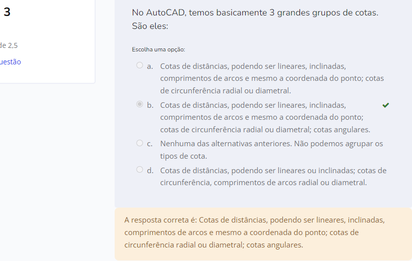 a. Cotas de distâncias, podendo ser lineares, inclinadas, comprimentos de arcos e mesmo a coordenada do ponto; cotas de circunferência radial ou diametral. b. Cotas de distâncias, podendo ser lineares, inclinadas, comprimentos de arcos e mesmo a coordenada do ponto; cotas de circunferência radial ou diametral; cotas angulares. c. Nenhuma das alternativas anteriores. Não podemos agrupar os tipos de cota. d. Cotas de distâncias, podendo ser lineares ou inclinadas; cotas de circunferência, comprimentos de arcos radial ou diametral.