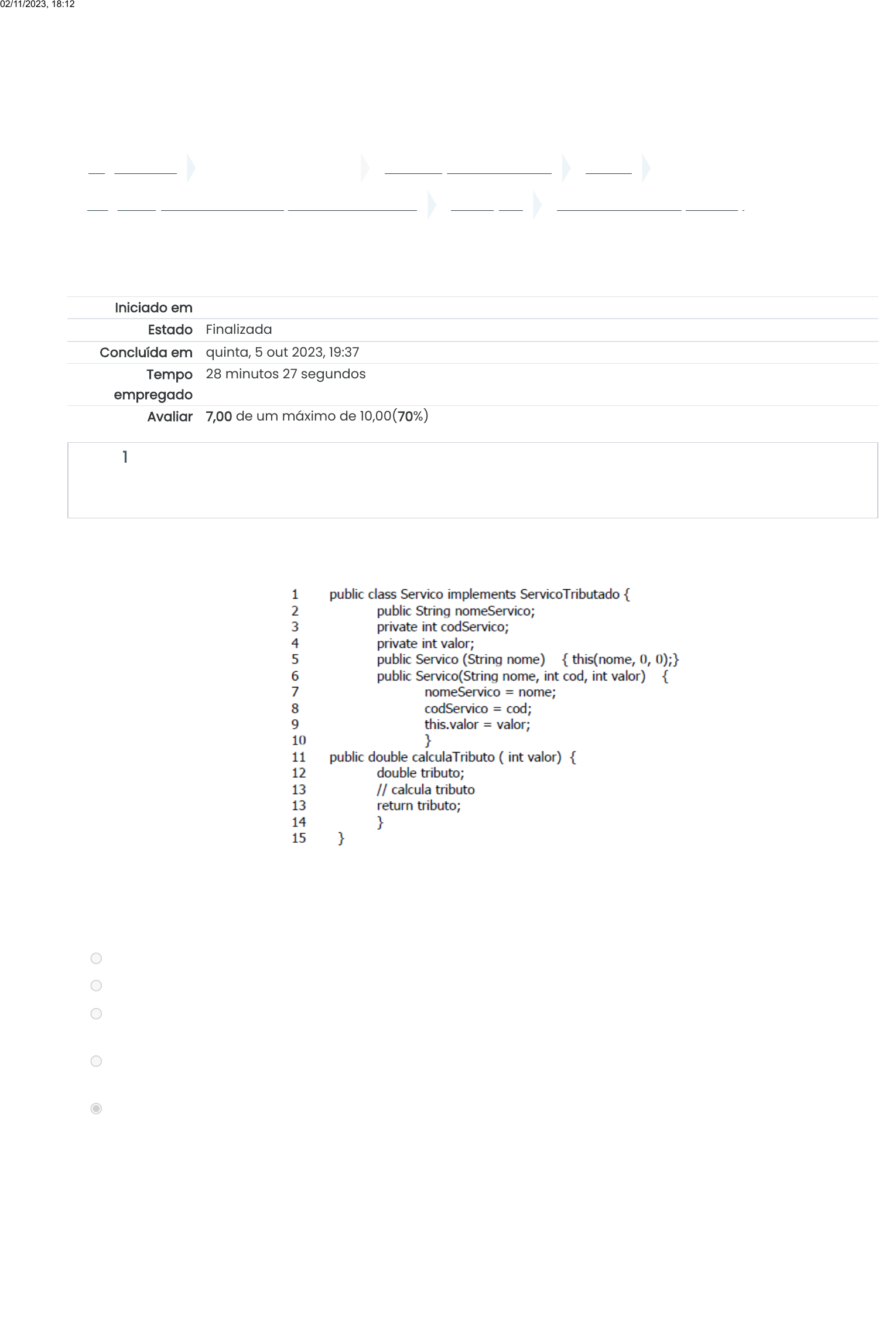 02/11/2023, 18:12 P2 - Prova On-line (Acessar) https://ava.candidomendes.edu.br/moodle/mod/quiz/review.php?attempt=411786&cmid=423452 1/6 ... Página inicial Disciplinas e Espaços GRADUAÇÃO A DISTÂNCIA 2023-3 Programação Orientada a Objetos - Módulo 03_A Avaliações P2 - Prova On-line (Acessar) Iniciado em quinta, 5 out 2023, 19:09 Estado Finalizada Concluída em quinta, 5 out 2023, 19:37 Tempo empregado 28 minutos 27 segundos Avaliar 7,00 de um máximo de 10,00(70%) Questão 1 Correto Atingiu 1,00 de 1,00 Considere o código Java abaixo para responder a, supondo que ServicoTributado está especificada em outro código, acessível por Servico. Na linha 1 do código Java, apresentado na instrução, a expressão “implements ServicoTributado” significa que: Escolha uma opção: a. a classe Servico não pode sobrescrever os métodos declarados em ServicoTributado. b. a classe ServicoTributado fornece métodos default que podem ser estendidos pela classe Servico. c. a classe Servico é uma subclasse de ServicoTribu-tado e pode sobrescrever os métodos declarados nesta última. d. a classe Servico pode chamar os métodos declarados em ServicoTributado, sem que seja necessário declará- los novamente. e. a classe Servico deve conter implementações de métodos da interface ServicoTributado. Sua resposta está correta. Quando se utiliza a palavra "implements", significa que você irá implementar uma interface, isso significa que terá que implementar todos os métodos assinados na interface. A resposta correta é: a classe Servico deve conter implementações de métodos da interface ServicoTributado. https://ava.candidomendes.edu.br/moodle/ https://ava.candidomendes.edu.br/moodle/course/index.php?categoryid=8 https://ava.candidomendes.edu.br/moodle/course/index.php?categoryid=166 https://ava.candidomendes.edu.br/moodle/course/view.php?id=12976 https://ava.candidomendes.edu.br/moodle/course/view.php?id=12976§ion=4 https://ava.candidomendes.edu.br/moodle/mod/quiz/view.php?id=423452 JR Retângulo JR Retângulo 02/11/2023, 18:12 P2 - Prova On-line (Acessar) https://ava.candidomendes.edu.br/moodle/mod/quiz/review.php?attempt=411786&cmid=423452 2/6 Questão 2 Correto Atingiu 1,00 de 1,00 Questão 3 Correto Atingiu 1,00 de 1,00 Acerca da programação orientada a objetos, usando Java, analise a seguinte assertiva: “O Java contém três tipos de instruções de seleção". Assinale-as. Escolha uma opção: a. if; if ... else; switch. b. while; switch; else. c. if; while; do while. d. For; while; do while. e. if; for; while. Sua resposta está correta. os comando de seleção: if{ } if{ }else{ } Switch{ } A resposta correta é: if; if ... else; switch. A herança é uma das características mais poderosas e importantes da orientação a objetos, pois permite o reaproveitamento de atributos e métodos. Em aplicações que utilizam herança, Escolha uma opção: a. somente as superclasses poderão ter métodos ou construtores sobrecarregados. b. não é possível sobrescrever em uma subclasse, um método de sua superclasse. c. é possível a implementação de herança múltipla, em todas as linguagens orientadas a objetos. d. é possível se obter polimorfismo. e. cada superclasse pode ter apenas uma subclasse. Sua resposta está correta. Em particular, o polimorfismo permite escrever programas que processam objetos que compartilham a mesma superclasse (direta ou indiretamente), como se todos fossem objetos da superclasse; isso pode simplificar a programação. A resposta correta é: é possível se obter polimorfismo. JR Retângulo 02/11/2023, 18:12 P2 - Prova On-line (Acessar) https://ava.candidomendes.edu.br/moodle/mod/quiz/review.php?attempt=411786&cmid=423452 3/6 Questão 4 Correto Atingiu 1,00 de 1,00 Questão 5 Correto Atingiu 1,00 de 1,00 Em aplicações orientadas a objetos, não é um recurso que permite a obtenção de polimorfismo: Escolha uma opção: a. Sobrescrita de métodos b. Modificador final. c. Classe abstrata d. Interface e. Herança Sua resposta está correta. Para impedir que um método seja sobreposto, especifique Final como modificador no início de sua declaração. Métodos declarados como final não podem ser sobrepostos. A resposta correta é: Modificador final. Considerando o trecho de código apresentado, assinale a opção correta a respeito da linguagem Java Escolha uma opção: a. Em Java, uma classe abstrata impede o uso de polimorfismo. b. Em Java, uma classe abstrata veda o uso de herança. c. Em Java, uma classe abstrata veda o uso de encapsulamento. d. Protected double salario significa que salario é visto por qualquer objeto ou superclasse. e. A palavra-chave abstract é utilizada para impedir que a classe Servidor seja instanciada. Sua resposta está correta. Você não pode criar um objeto de uma classe abstrata porque poderia não existir uma implementação válida para alguns métodos que bem poderiam ser invocados. A resposta correta é: A palavra-chave abstract é utilizada para impedir que a classe Servidor seja instanciada. JR Retângulo 02/11/2023, 18:12 P2 - Prova On-line (Acessar) https://ava.candidomendes.edu.br/moodle/mod/quiz/review.php?attempt=411786&cmid=423452 4/6 Questão 6 Incorreto Atingiu 0,00 de 1,00 Herança e interfaces são conceitos da orientação a objetos que possibilitam a obtenção de polimorfismo. Em Java, uma interface pode Escolha uma opção: a. herdar de mais de uma interface. b. conter declarações de constantes e de variáveis não inicializadas. c. possuir métodos abstratos, estáticos e final. d. possuir apenas assinaturas de métodos públicos. e. ser instanciada diretamente por meio da instrução new. Sua resposta está incorreta. Os métodos declarados em uma interface são implicitamente abstratos porque nenhuma implementação é, ou pode ser, dada a eles. Por esta razão, o corpo do método é simplesmente um ponto-e-vírgula após o cabeçalho do método. Por convenção, o modificador abstrac