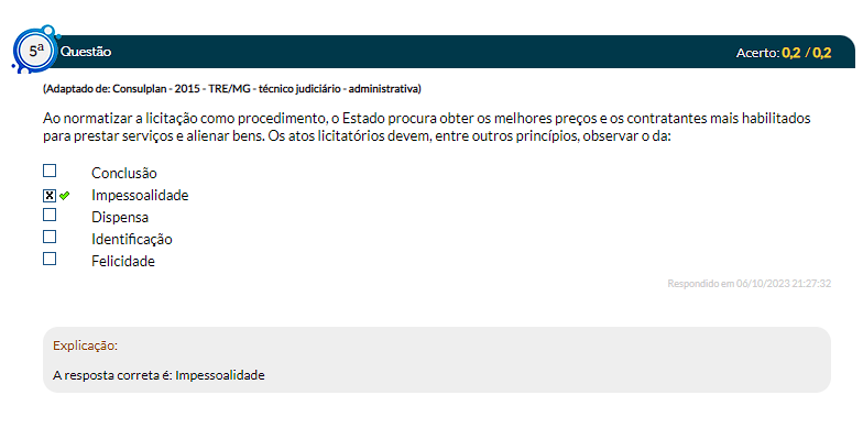 I - Conclusão II - Impessoalidade III - Dispensa IV - Identificação V - Felicidade a) I, II e III estão corretas. b) II, III e IV estão corretas. c) II e IV estão corretas. d) II e V estão corretas. e) II está correta.