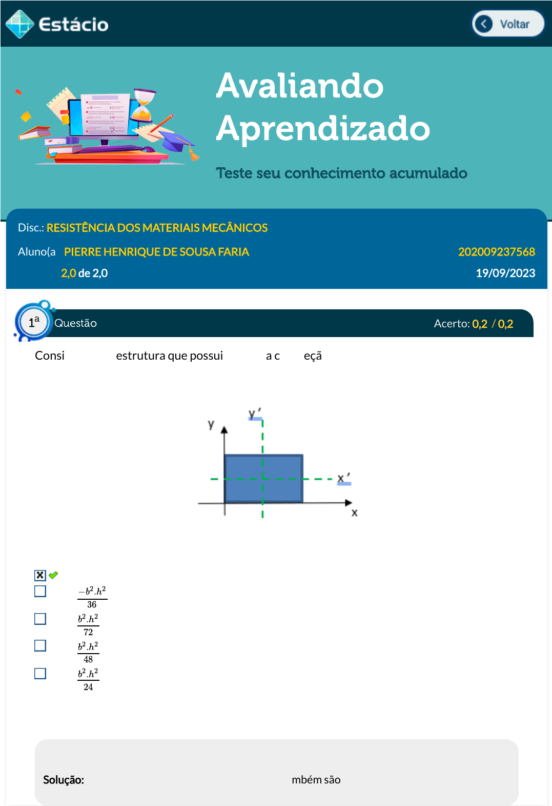 Avaliando Aprendizado Teste seu conhecimento acumulado Disc.: RESISTÊNCIA DOS MATERIAIS MECÂNICOS Aluno(a): PIERRE HENRIQUE DE SOUSA FARIA 202009237568 Acertos: 2,0 de 2,0 19/09/2023 Acerto: 0,2 / 0,2 Considere uma estrutura que possui uma viga com seção reta retangular tal que a base b tem o dobro do comprimento da altura h. Considerando os eixos x' e y' que passam pelo centroide da �gura, é correto a�rmar que o produto de inércia da área em relação aos eixos x'y' Imagem: Julio Cesar José Rodrigues Junior 0 Respondido em 19/09/2023 13:37:47 Explicação: Solução: Os eixos centroidais da seção retangular também são eixos de simetria. Assim, pelo teorema da simetria, o produto de inércia da seção em relação a esses eixos é nulo. −b2.h2 36 b2.h2 72 b2.h2 48 b2.h2 24 Questão1 a https://simulado.estacio.br/alunos/inicio.asp javascript:voltar(); Acerto: 0,2 / 0,2 (SABESP / 2014) Para responder à questão, considere os dados a seguir. Dados: Momento de inércia polar do tubo: Módulo de elasticidade do material do tubo: O maior momento de torção que pode ser aplicado ao tubo da �gura acima para que as tensões de cisalhamento sobre ele não excedam , em N.m, é de: 8.000 4.000 1.000 18.000 20.000 Respondido em 19/09/2023 13:45:42 Explicação: Gabarito: 4.000 Solução: Acerto: 0,2 / 0,2 J = 1, 0x10−6m4 80x109N/m2 tmax 120x10 6 N/m2 τ = → 120 ⋅ 106 = → T = 4.000N . m T ⋅ρ J0 T ⋅0,03 10−6 Questão2 a Questão3 a (CESPE / 2016) A �gura precedente ilustra a situação em que uma viga prismática (barra de eixo reto e seção transversal constante), feita de material elástico linear, é submetida a uma força de 20 kN. O momento de inércia (I) da seção transversal da viga é dado por I = (b × h³)/12, em que b = 10cm e h = 30cm. O módulo de elasticidade do material da viga é 21.000 kN/cm². Após a deformação, as seções transversais da viga permanecem planas e os deslocamentos da linha elástica são de pequena amplitude.Na situação apresentada, o deslocamento vertical máximo da viga, em cm, é superior a 1,7. superior a 0,2 e inferior a 0,6. superior a 0,02 e inferior a 0,2. inferior a 0,02. superior a 0,6 e inferior a 1,7. Respondido em 19/09/2023 13:58:41 Explicação: Gabarito: superior a 0,02 e inferior a 0,2. Justi�cativa: Maior deslocamento, em módulo: Acerto: 0,2 / 0,2 (Petrobras / 2010) Uma peça prismática de seção retangular está sujeita em uma de suas seções transversais à ação de dois momentos �etores, Mx e My atuantes, conforme indicado na �gura acima. Considerando Mx = My, a maior tensão normal de tração, por efeito de �exão, ocorre no ponto M, porque, nesse ponto, ocorre a superposição de tensões normais de tração. S, porque o momento de inércia Iy > Ix. N, porque, nesse ponto, ocorre a superposição de tensões normais de tração. y = P .L3 48.E.I y = = 0, 0019m = 0, 19cm 20000.(6)3 48.(210.109). (0,1).(0,3)3 12 Questão4 a R, porque o momento de inércia Ix > Iy. P, porque, nesse ponto, a tensão normal de tração é maior que a tensão normal de compressão. Respondido em 19/09/2023 13:46:07 Explicação: Gabarito: M, porque, nesse ponto, ocorre a superposição de tensões normais de tração. Justi�cativa: O momento My traciona o ponto M, assim como Mx. Pelo teorema da superposição, a �exão normal trativa é máxima em M. Acerto: 0,2 / 0,2 (EBSERH / 2016) Em um período de montagem de uma estrutura metálica, são realizadas diversas movimentações de cargas. Foi solicitado que o engenheiro mecânico elaborasse um plano de rigging para a elevação de uma estrutura com a geometria mostrada na �gura a seguir, com espessura uniforme. Qual ponto (x, y) deverá ser o ponto de içamento da peça para que a sua carga esteja igualmente distribuída? Considere que o material possui densidade uniforme. (5,00; 4,00) (5,00; 5,00) (4,24; 5,25) (5,25; 4,24) (4,00; 5,00) Respondido em 19/09/2023 13:48:13 Explicação: Solução: Questão5 a Acerto: 0,2 / 0,2 (IF-PE / 2017) Calcule a tensão máxima de cisalhamento para eixo maciço de comprimento e seção transversal constante de raio , submetido a um torque . Considere que o momento de inércia polar da seção transversal do eixo é igual a , e assinale a alternativa correta. Respondido em 19/09/2023 13:39:43 Explicação: Gabarito: Solução: Acerto: 0,2 / 0,2 (FGV / 2008) O valor da carga P que, aplicada no ponto central de uma viga biapoiada, provoca nesse ponto um deslocamento igual ao provocado por uma carga q uniformemente distribuída em todo o vão da viga é: ¯̄x̄ = e ¯̄̄y = ∑ ¯̄̄xi.Ai ∑Ai ∑ ȳi.Ai ∑Ai ¯̄x̄ = = 5, 25m (2,5).50+(7,5).(25)+(7,12).(19,625)−(1,6667).(12,5) 50+25+19,625−12,5 ¯̄̄y = = 4, 24m (5).50+(2,5).(25)+(7,12).(19,625)−(8,333).(12,5) 50+25+19,625−12,5 L R T π.R4 2 2.T p.R3 4.T p.R 2.T p.R2 4.T p.R2 T p.R3 2.T p.R3 τ = → → τmax = T .ρ J0 T .R π.R4 2 2.T π.R3 5.q.L 4 5.q. L Questão6 a Questão7 a Respondido em 19/09/2023 13:53:12 Explicação: Gabarito: Maior deslocamento, em módulo: (força na extremidade) (carregamento distribuído) Acerto: 0,2 / 0,2 (CESGRANRIO / 2010 - adaptada). Uma placa de sinalização de peso P é �xada a uma coluna de seção transversal retangular através de dois parafusos, A e B, conforme ilustrado na �gura. Considere a placa como um corpo rígido e a coluna como uma viga plana. O trecho BC da coluna está sujeito à solicitação por �exão pura combinada com carga axial. �exão simples combinada com carga axial. �exão simples, apenas. carga axial, apenas. 5.q.L 2 5.q.L 8 5.q.L 16 5.q.L 8 y = P .L3 48.E.I y = 5.q.L4 384.E.I = P .L3 48.E.I 5.q.L4 384.E.I P = 5q.L 8 Questão8 a �exão pura, apenas. Respondido em 19/09/2023 13:38:30 Explicação: Gabarito: �exão pura combinada com carga axial. Justi�cativa: Deslocando-se a carga P para a seção a b, deve-se considerar o efeito do momento provocado por P. Logo, é uma �