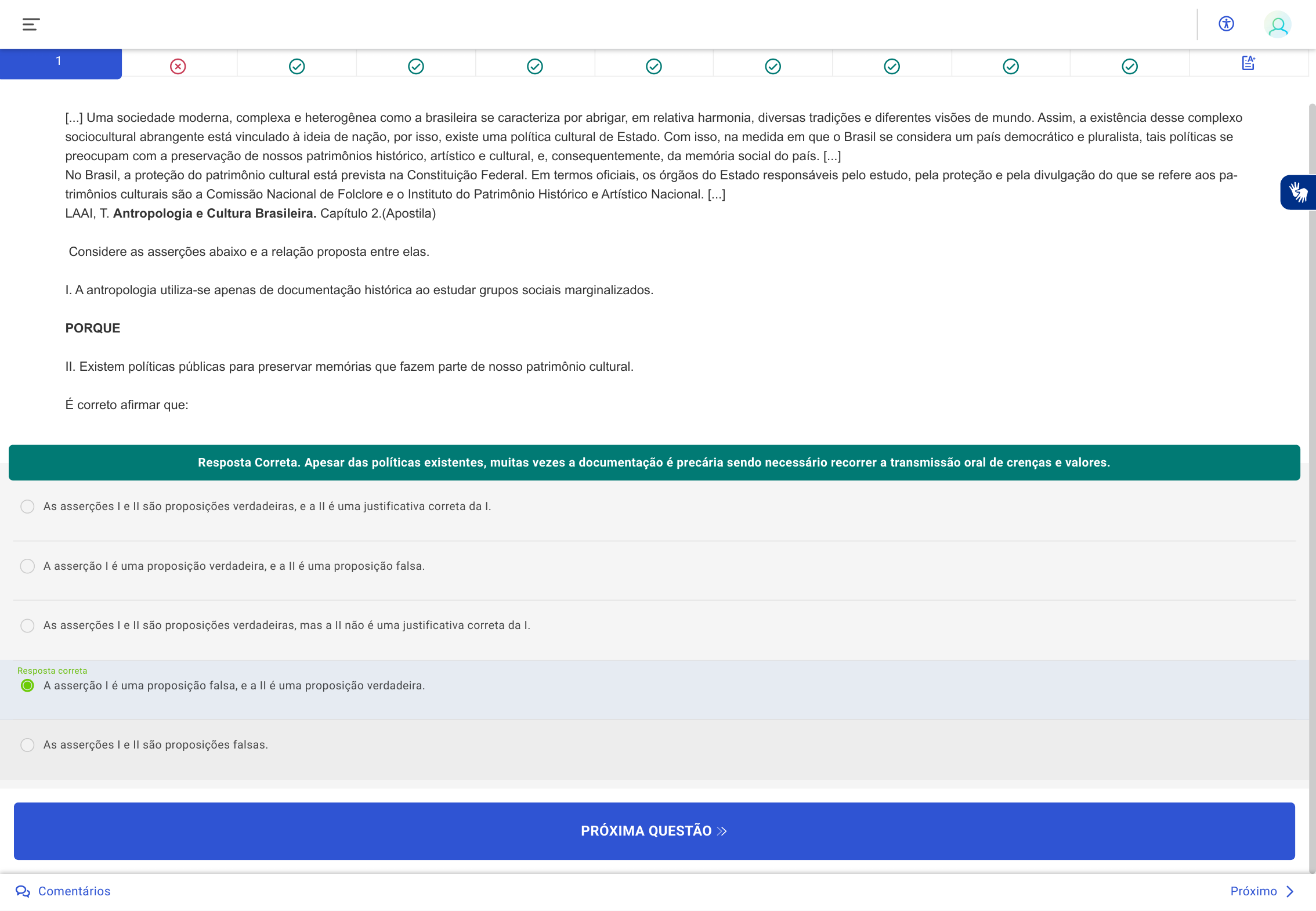 [...] Uma sociedade moderna, complexa e heterogênea como a brasileira se caracteriza por abrigar, em relativa harmonia, diversas tradições e diferentes visões de mundo. Assim, a existência desse complexo sociocultural abrangente está vinculado à ideia de nação, por isso, existe uma política cultural de Estado. Com isso, na medida em que o Brasil se considera um país democrático e pluralista, tais políticas se preocupam com a preservação de nossos patrimônios histórico, artístico e cultural, e, consequentemente, da memória social do país. [...] No Brasil, a proteção do patrimônio cultural está prevista na Constituição Federal. Em termos oficiais, os órgãos do Estado responsáveis pelo estudo, pela proteção e pela divulgação do que se refere aos pa- trimônios culturais são a Comissão Nacional de Folclore e o Instituto do Patrimônio Histórico e Artístico Nacional. [...] LAAI, T. Antropologia e Cultura Brasileira. Capítulo 2.(Apostila) Considere as asserções abaixo e a relação proposta entre elas. I. A antropologia utiliza-se apenas de documentação histórica ao estudar grupos sociais marginalizados. PORQUE II. Existem políticas públicas para preservar memórias que fazem parte de nosso patrimônio cultural. É correto afirmar que: Resposta Correta. Apesar das políticas existentes, muitas vezes a documentação é precária sendo necessário recorrer a transmissão oral de crenças e valores. As asserções I e II são proposições verdadeiras, e a II é uma justificativa correta da I. A asserção I é uma proposição verdadeira, e a II é uma proposição falsa. As asserções I e II são proposições verdadeiras, mas a II não é uma justificativa correta da I. A asserção I é uma proposição falsa, e a II é uma proposição verdadeira. Resposta correta As asserções I e II são proposições falsas. PRÓXIMA QUESTÃO Próximo 1 Comentários Depois de instalar os engenhos de açúcar na colônia, por uma questão econômica e a necessidade de mão de obra qualificada para trabalhar nos engenhos, Portugal começa a investir no tráfico de escravos. O primeiro navio de escravos chega a Salvador a partir de 1560. Para a historiadora Marli Geralda “A característica da economia decidiu o tipo de escravidão, o africano era considerado como uma coisa que falava”. “Duas forças permitiram que a escravidão permanecesse no Brasil: pressão externa (dos traficantes de escravos, comércio que gerava muito dinheiro) e condição interna (a produção agrícola de cana-de-açúcar que precisava de mão de obra especializada)”, diz. A escravidão no Brasil colônia. Universia Brasil, 2012. Disponível em: < http://noticias.universia.com.br/destaque/noticia/2012/02/28/914494/escravido-no-brasil- colonia.html>. Acesso em: 20 de jun. 2019. Considerando o texto acima e seus estudos anteriores, assinale a alternativa correta: Resposta Incorreta. O continente africano era organizado e seu povo, trazido como escravo, resistiu ao processo de aculturação. A contribuição do negro a cultura brasileira é grande. O trabalho escravo nas plantações tinha como objetivo atender o crescente consumo europeu. A cultura africana rapidamente aderiu aos costumes da nova cultura que vinha implantando hábitos europeus no Brasil. Mão de obra especializada, os escravos eram facilmente subjugados por seus colonizadores por serem dóceis. O país escolhido para buscar os escravos era a África, pois o continente africano não era organizado. O tráfico de escravos e seu trabalho visavam abastecer a nobreza do Brasil colônia. Sua resposta (incorreta) Os escravos eram necessários para a produção de cana de açúcar e também para produção de café, algodão e tabaco. Resposta correta PRÓXIMA QUESTÃO Próximo 2 Comentários http://noticias.universia.com.br/destaque/noticia/2012/02/28/914494/escravido-no-brasil-colonia.html Atividade 2 O tombamento é o instrumento de reconhecimento e proteção do patrimônio cultural mais conhecido, e pode ser feito pela administração federal, estadual e municipal. Em âmbito federal, o tombamento foi instituído pelo http://portal.iphan.gov.br/uploads/ckfinder/arquivos/Decreto-Lei%20n%C2%B0%2025%20de%2030%20de%20novembro%20de%201937.pdf, o primeiro instrumento legal de proteção do Pa- trimônio Cultural Brasileiro e o primeiro das Américas, e cujos preceitos fundamentais se mantêm atuais e em uso até os nossos dias. Bens Tombados. IPHAN, 2014. Disponível em: < http://portal.iphan.gov.br/pagina/detalhes/126>. Acesso em: 20 de jun. de 2019. Sobre o tombamento, você diria que: I. O patrimônio tombado está registrado em Livros de Tombo II. Preserva de forma regulamentar itens de nossa cultura como, por exemplo, a Festa do Boi III. É um mecanismo de informação que dá lógica e inteligibilidade ao patrimônio IV. Está relacionado a memória social e identidade cultural brasileira Estão corretas as afirmações: Resposta Correta. Preservar e tornar patrimônio os bens culturais para que estejam sempre presentes e disponíveis na cultura, cria e conserva a memória social e, consequentemente, sustenta a nossa identidade cultural. Os Livros de Tombo onde está registrado o patrimônio cultural brasileiro pode ser acessado na internet, no Portal do Iphan. I e IV. Resposta correta I e III. II e IV. I, II e III. II, III e IV. PRÓXIMA QUESTÃO Próximo 3 4 Comentários http://portal.iphan.gov.br/uploads/ckfinder/arquivos/Decreto-Lei%20n%C2%B0%2025%20de%2030%20de%20novembro%20de%201937.pdf http://portal.iphan.gov.br/pagina/detalhes/126 Atividade 2 A história da escravidão é uma narrativa de tragédias, conflitos, descaso, preconceitos e injustiças. Ou seja, uma ferida que o Brasil carrega aberta até os dias de hoje. Antes das campanhas abolicionistas na virada do século XIX, os negros já reagiam à escravidão [...] São consideradas formas de reação dos negros à escravidão: I. Suicídios e abortos. II