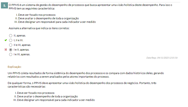 PPMS deve apresentar uma visão do desempenho dos processos de negócios. Portanto, três características são I. Deve ser focado nos processos II. Deve avaliar desempenho de toda a organização III. Deve designar um responsável para cada indicador a ser medido