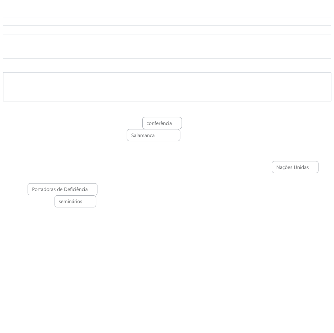 19/04/2023, 18:39 Questão Discursiva: Revisão da tentativa https://avaead.unisanta.br/mod/quiz/review.php?attempt=167397&cmid=231208 1/2 Iniciado em quarta, 19 abr 2023, 18:36 Estado Finalizada Concluída em quarta, 19 abr 2023, 18:39 Tempo empregado 2 minutos 59 segundos Notas 1,00/1,00 Avaliar 10,00 de um máximo de 10,00(100%) Questão 1 Correto Atingiu 1,00 de 1,00 Esta Estrutura de Ação em Educação Especial foi adotada pela Mundial em Educação Especial organizada pelo governo da Espanha em cooperação com a UNESCO, realizada em entre 7 e 10 de junho de 1994. Seu objetivo é informar sobre políticas e guias ações governamentais, de organizações internacionais ou agências nacionais de auxílio, organizações não-governamentais e outras instituições na implementação da Declaração de Salamanca sobre princípios, Política e prática em Educação Especial. A Estrutura de Ação baseia-se fortemente na experiência dos países participantes e também nas resoluções, recomendações e publicações do sistema das e outras organizações intergovernamentais, especialmente o documento "Procedimentos-Padrões na Equalização de Oportunidades para pessoas . Tal Estrutura de Ação também leva em consideração as propostas, direções e recomendações originadas dos cinco regionais preparatórios da Conferência Mundial. conferência Salamanca Nações Unidas Portadoras de Deficiência seminários Sua resposta está correta. A resposta correta é: Esta Estrutura de Ação em Educação Especial foi adotada pela [conferência] Mundial em Educação Especial organizada pelo governo da Espanha em cooperação com a UNESCO, realizada em [Salamanca] entre 7 e 10 de junho de 1994. Seu objetivo é informar sobre políticas e guias ações governamentais, de organizações internacionais ou agências nacionais de auxílio, organizações não-governamentais e outras instituições na implementação da Declaração de Salamanca sobre princípios, Política e prática em Educação Especial. A Estrutura de Ação baseia-se fortemente na experiência dos países participantes e também nas resoluções, recomendações e publicações do sistema das [Nações Unidas] e outras organizações intergovernamentais, especialmente o documento "Procedimentos-Padrões na Equalização de Oportunidades para pessoas [Portadoras de Deficiência]. Tal Estrutura de Ação também leva em consideração as propostas, direções e recomendações originadas dos cinco [seminários] regionais preparatórios da Conferência Mundial. 19/04/2023, 18:39 Questão Discursiva: Revisão da tentativa https://avaead.unisanta.br/mod/quiz/review.php?attempt=167397&cmid=231208 2/2
