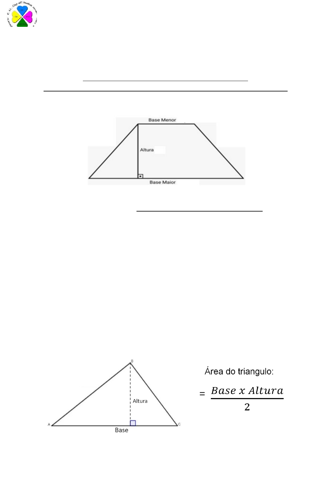 PREFEITURA MUNICIPAL DE ITAPERUNA ESCOLA MUNICIPAL CIEP 467 HENRIETT AMADO “Educação pela paz, educação para a vida” Professor (a):Evelyn Fonseca Aluno (a):_______________________________________ Turma: ____ Componente curricular: Matemática Data: __/__/____ ATIVIDADE PARA SER FEITA EM SALA VALENDO NOTA. A ATIVIDADE DEVE CONTER TODOS OS CALCULOS DAS QUESTÕES NO CADERNO. 1) Calcule a área dos trapézios abaixo: Área do trapézio = ( ) a) Um trapézio possui base maior medindo 10 cm, base menor medindo 6 cm, e altura igual a 3 cm b) Um trapézio possui base maior medindo 9 cm, base menor medindo 7 cm, e altura igual a 4 cm c) Um trapézio possui base maior medindo 8 cm, base menor medindo 6 cm, e altura igual a 2 cm d) Um trapézio possui base maior medindo 7 cm, base menor medindo 4 cm, e altura igual a 8 cm e) Um trapézio possui base maior medindo 6 cm, base menor medindo 5 cm, e altura igual a 10 cm f) Um trapézio possui base maior medindo 5 cm, base menor medindo 2 cm, e altura igual a 6 cm 2) Calcule a área dos Triângulos abaixo: a) Um triângulo possui base medindo 10 cm e altura igual a 3 cm b) Um triângulo possui base medindo 11 cm e altura igual a 4 cm c) Um triângulo possui base medindo 8 cm e altura igual a 3 cm d) Um triângulo possui base medindo 12 cm e altura igual a 2 cm e) Um triângulo possui base medindo 6 cm e altura igual a 5 cm f) Um triângulo possui base medindo 7 cm e altura igual a 8 cm 3) Calcule a área dos quadriláteros abaixo: Área do quadrilátero = Base x Altura a) Um quadrado possui base medindo 7 cm e altura igual a 18 cm b) Um quadrado possui base medindo 17 cm e altura igual a 5 cm c) Um quadrado possui base medindo 13 cm e altura igual a 8 cm d) Um quadrado possui base medindo 15 cm e altura igual a 4 cm e) Um quadrado possui base medindo 12 cm e altura igual a 7 cm f) Um quadrado possui base medindo 9 cm e altura igual a 6 cm 4) Resolva as situações problema abaixo: a) Se uma empresa possui 1200 funcionários e 23% são mulheres, quantas mulheres tem nessa fábrica? Quantos homens trabalham nessa fábrica? R: b) Catarina recebe R$ 1700 por mês, este mês ela receberá um aumento de 14%. Quanto ela receberá de aumento? E qual será o novo salário de Catarina? R: c) Maria quer comprar um celular, fez uma pesquisa e encontrou em uma loja por R$ 900, ela conseguiu um desconto de 13%. Qual o valor do desconto e Quanto Maria pagará pelo celular? R: d) Marcos tem um álbum, já comprou 430 figurinhas, mas 70% delas são repetidas. Quantas figurinhas não estão repetidas? R: e) Em uma festa haverá 1300 docinhos, sendo brigadeiros e beijinhos. Sabendo que 16% são brigadeiros, responda quantos brigadeiros terão na festa e quantos beijinhos terão na festa. R: f) Meu amigo me pediu 19% do meu salário emprestado. Se eu recebo 3500 reais, quanto irei emprestar a esse amigo? R: ___________________________________________________________________________________________________________________ Rua Tomé de Souza, s/nº - Bairro Marechal Castelo Branco - Itaperuna - RJ - CEP 28300000 E-mail: ciep467@hotmail.com / henriettamado4@gmail.com Missão: Formar o cidadão para exercer sua missão consciente na sociedade, buscando a formação plena do indivíduo. Visão: Ser uma escola de referência no ensino público de qualidade, integrada com a comunidade. Valores: comprometimento, afetividade, competência, ética, honestidade e interação.