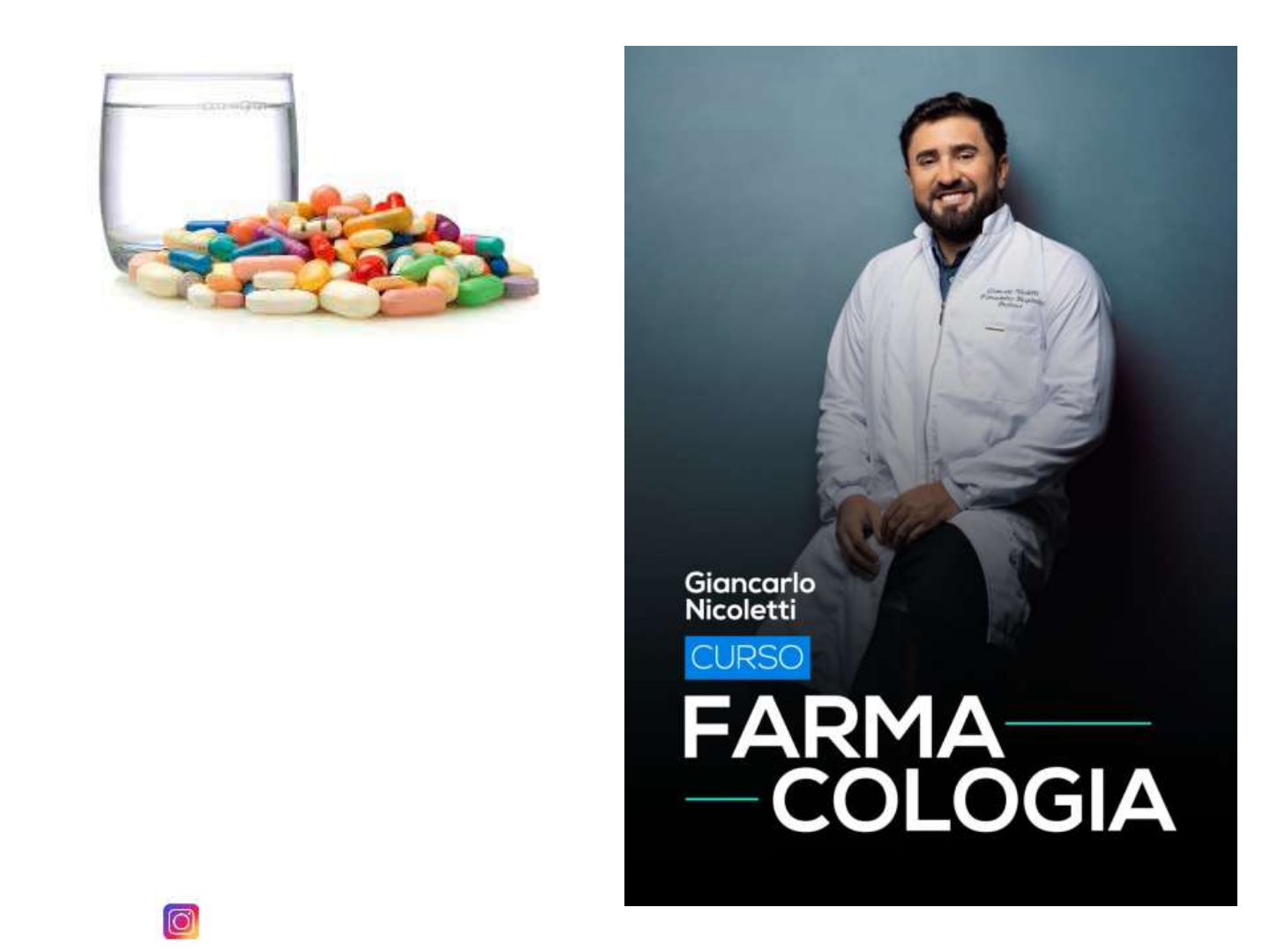 Me. Giancarlo Nicoletti Farmacêutico/bioquímico -UFRN Especialista em Farmacologia Aplicada - CRF/RN Especialista em Análise Clínica e Toxicológicas Mestrado em Biologia Parasitária – UFRN 7º Turma de Farmacologia @prof.giancarlonicoletti -Farmacêutico/Bioquímico – UFRN; -Especialista em Farmacologia Aplicada - CRF/RN; -Especialista em analises clinicas e toxicológicas – FATERN; -Mestrado em Biologia Parasitária – UFRN; - Atua 12 anos na área de Farmácia Comercial; - Atua 8 anos com Professor Universitário; - Atua 3 anos como Bioquímico; - Atuou 4 anos na indústria farmacêutica (CNN); - Professor da Estácio, Uniceuna e Nassau - Coordenador de Farmácia na Uniceuna; - Bioquímico Walfredo Gurgel; - Concursado no HDMM. Bibliografia Giancarlo Nicoletti • Introdução a farmacologia; • Farmacocinética/Farmacodinâmica; • Anti-inflamatórios e glicocorticoides; • Anti-hipertensivos e diuréticos; • Fármacos utilizados no Sistema Nervoso Autônomo; • Fármacos utilizados na asma; Broncodilatadores; • Noções de antibióticos; • Antidepressivo e ansiolíticos; CONTEÚDOS ABORDADOS PORT. 344/98 e RDC 347/21 Aula Bônus OBRIGADO PELA PRESENÇA 1. INTRODUÇÃO Substância que se utiliza para o diagnóstico, alivio, tratamento e/ou cura de uma doença, como também para sua prevenção. Substância capaz de modificar a estrutura e/ou as funcões de um organismo vivo CONCEITOS BÁSICOS DE FARMACOLOGIA Remédio – Todo e qualquer procedimento que promova saúde, podendo haver ou não o uso de substâncias químicas. Tudo aquilo que cura, alivia ou evita uma enfermidade. Ex: atividade física; viagens; lazer; alimentação regrada; massagens; repouso, etc. Conceitos básicos FARMACOLOGIA Medicamento- Produto que contem 1 ou mais princípios ativos para tratar ou prevenir um determinado problema de saúde, visando obter efeitos benéficos, destinadas a curar, diminuir prevenir e/ou diagnosticar as enfermidades. Ex: Tylenol= Paracetamol + excipientes (tratar) Ex: Tantin = Gestodeno + Etilinoestradiol (prevenir) Conceitos FARMACOLOGIA Fármaco- ou princípio ativo. Substância química de estrutura química definida utilizados no diagnóstico, tratamento e profilaxia de doenças, que produzem um efeito no organismo vivo. Ex: Ampicilina – antibiótico impede a síntese da parede bacteriana (peptídeoglicano) Ex: Fenitoína – anticonvulsivante – impede potenciais de ação desordenados. ConceitosFARMACOLOGIA Dose: Quantidade do medicamento necessária para promover alterações no organismo. Dosagem: Inclui a dose, a frequência de administração e a duração do tratamento. Posologia: É o estudo das dosagens do medicamento com fins terapêuticos. Conceitos FARMACOLOGIA Dose: quantidade de fármaco capaz de provocar alterações no organismo, pode ser eficaz (DE), letal (DL), ataque ou de manutenção. • DE é dose capaz de produzir o efeito terapêutico desejado, podendo ser classificada em mínima eficaz (DME) e máxima tolerada (DMT). Conceitos FARMACOLOGIA Janela terapêutica: faixa entre a dose mínima eficaz e máxima eficaz. É a extensão de tempo em que a concentração do fármaco exerce o efeito desejado desde o pico até não exercer mais o efeito. @Larifarma Janela terapêutica FARMACOLOGIA O fármaco NÃO está causando efeito farmacológico pois não ultrapassou CME Janela terapêutica FARMACOLOGIA O fármaco está causando efeito farmacológico pois atingiu CME Janela terapêutica FARMACOLOGIA O fármaco está causando efeito farmacológico pois ultrapassou CME mas está causando EFEITO TÓXICO Janela terapêutica FARMACOLOGIA O fármaco está causando efeito farmacológico pois ultrapassou CME e NÃO TÓXICO pois não ultrapassou CMT. 1.2 Drogas: 1.2.1 Dose: 1.2 Drogas: 1.2.2 Posologia: 1.2 Drogas: Representação de Administração de Dose Única e de Dose Múltipla DOSE ÚNICA DOSE MÚLTIPLA 1 2 • Meia Vida Biológica (t 1/2): É o tempo que o fármaco precisa para sua concentração diminuir 50% na corrente sanguínea. exemplo: • Da substância A é administrado 100 mg: t 1/2 = 10 h, então em 10 horas terá 50 mg na corrente sanguínea. Em mais 10 horas terá na corrente sanguínea 25 mg e assim por diante. Conceitos Conceitos • Steady state • Woshout Conceitos • Steady state • Woshout 38 Relação Risco-Beneficio • Demonstra a racionalidade de utilizar ou não determinada droga em um paciente. custo,• Risco (efeitos adversos, inconveniência da administração) X • Benefício (Redução da morbidade, melhora da qualidade de vida, eficácia, facilidade da administração) FARMACOLOGIA Relação Risco-Beneficio 1.3.1 Reações adversas aos medicamentos (RAM): Segundo a Organização Mundial da Saúde, a reação adversa é uma reação prejudicial ao indivíduo que usa o medicamento, mesmo em sua dose recomendada, e ocorre de forma não intencional. 1.3 Tipos de reações aos medicamentos Leve Não necessita tratamento. Moderada Exige tratamento específico Grave Risco de morte ou anomalia congênita Letal Óbito do paciente. @Larifarma TALIDOMIDA - FARMACOVIGILÂNCIA Histórico Farmacologia ciência jovem que passou a ser reconhecida no final do século XIX Aspirina® (1899) As diferentes áreas da farmacologia Farmacocinética Farmacodinâmica Farmacotécnica Farmacognosia Farmacoterapêutica Imunofarmacologia As diferentes áreas da farmacologia Farmacocinética Farmacodinâmica Farmacotécnica Farmacognosia Farmacoterapêutica Imunofarmacologia É o caminho que o medicamento faz no organismo. Não estuda o mecanismo de ação, mas sim as etapas que a droga sofre desde a administração até a excreção: absorção, distribuição, biotransformação ou metabolismo e excreção. etapas simultâneas, divisão apenas didática. As diferentes áreas da farmacologia Farmacocinética Farmacodinâmica Farmacotécnica Farmacognosia Farmacoterapêutica Imunofarmacologia Estuda os efeitos fisiológicos dos fármacos no