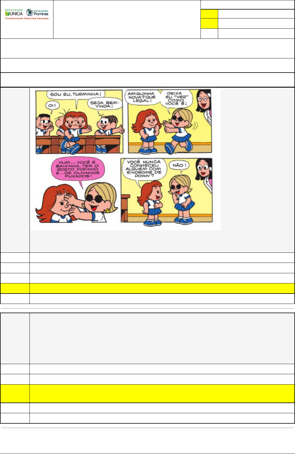 Pincel Atômico - 13/06/2023 18:15:47 1/3 SANDRA MÁRCIA DE ARAÚJO OLIVEIRA Exercício Caminho do Conhecimento - Etapa 8 (18428) Atividade finalizada em 13/06/2023 18:14:19 (980778 / 2) LEGENDA Resposta correta na questão # Resposta correta - Questão Anulada X Resposta selecionada pelo Aluno Disciplina: PRÁTICA PEDAGÓGICA INTERDISCIPLINAR: ATENDIMENTO EDUCACIONAL ESPECIALIZADO NA SALA DE RECURSOS MULTIFUNCIONAIS [863742] - Avaliação com 8 questões, com o peso total de 1,11 pontos [capítulos - 4] Turma: Segunda Graduação: Segunda Graduação 6 Meses - Licenciatura em Educação Especial - Grupo: FPD-MAIO2023 - SGegu0A220523 [92211] Aluno(a): 91471656 - SANDRA MÁRCIA DE ARAÚJO OLIVEIRA - Respondeu 7 questões corretas, obtendo um total de 0,97 pontos como nota [357824_1016 56] Questão 001 Fonte: (SOUSA, 2012) A história em quadrinhos representa O extermínio da pessoa com deficiência. A inclusão da pessoa com deficiência. Nenhuma das alternativas estão corretas. X A integração da pessoa com deficiência. A segregação da pessoa com deficiência. [357826_1016 61] Questão 002 A Igreja se posicionou de formas diferentes em determinados períodos da deficiência o que possibilitou o surgimento de ações de proteção e auxílio à pessoa com deficiência, PORQUE o foco deveria ser a deficiência, e não as capacidades e habilidades dessas pessoas que poderiam ser potencializadas por meio de atendimentos individualizados, estímulos e recursos adequados. As asserções I e II são proposições verdadeiras, e II é uma justificativa correta da I. As asserções I e II são proposições falsas. X As asserções I e II são proposições verdadeiras, mas a II não é uma justificativa correta da I. A asserção I é uma proposição falsa, e a II é uma proposição verdadeira. A asserção I é uma proposição verdadeira, e a II é uma proposição falsa. Pincel Atômico - 13/06/2023 18:15:47 2/3 [357824_1232 66] Questão 003 O século XIX marcou a vida das pessoas com deficiência visual em todo o mundo. Nascia, na França, Louis Braille. Acometido pela cegueira por conta de um acidente doméstico, ele revolucionou a educação, com a criação do sistema braile. Atualmente, de acordo com Montilla (2006) uma série de equipamentos específicos favorecem a acessibilidade comunicacional a estudantes com deficiência visual. No ambiente escolar, pessoas com baixa visão utilizam-se de equipamentos também utilizados por estudantes cegos. Assinale a única opção de equipamento utilizado apenas pelas pessoas com baixa visão. Máquina braile para leitura e escrita. X Lupa. Gravadores para registrar aulas. Livros falados. Impressora 3D. [357825_1016 57] Questão 004 I. A integração assume socialmente o aluno com deficiência, sem, entretanto, buscar possibilidades e adaptações necessárias para que ele seja incluído. II. A inclusão não assume apenas a pessoa com deficiência, mas responsabiliza a sociedade, a família e o Estado a criarem condições de inclusão por meio de legislações, documentos internacionais, formações continuadas para professores de apoio, contratação de intérpretes/professores de Libras, acessibilidade estrutural, remoção de barreiras atitudinais e desenvolvimento de recursos e tecnologia assistiva. III. Na escola inclusiva o processo educativo deve ser entendido como um processo social, onde todas as crianças com de necessidades educacionais especiais e distúrbios de aprendizagem têm o direito à escolarização. É CORRETO apenas o que se afirma em I. I, II. III. X I, II, III. II, III. [357824_1232 67] Questão 005 O sistema Braile é o meio de leitura e escrita mais eficiente e útil para o uso das pessoas cegas. O criador desse sistema foi Assinale a alternativa CORRETA um recurso de tecnologia assistiva que auxilia as pessoas com deficiência visual no desempenho de suas tarefas segundo os dicionários, aquele que lê ou que tem o hábito de ler. Por isso, a palavra “ledor” é sinônima de “leitor” o profissional que lê e traduz os códigos de braile para as pessoas cegas X um importante elemento no ambiente educacional inclusivo, o qual assegura a acessibilidade comunicacional a pessoas cegas ou com baixa visão, por meio da leitura dos conteúdos escolares, literários etc. uma ferramenta eletrônica que desempenha a atividade de leitura, gravação e impressão de pesquisas para as pessoas com deficiência visual Pincel Atômico - 13/06/2023 18:15:47 3/3 [357825_1016 58] Questão 006 I. No final do século XIX e início do século XX, o termo integração é substituído pelo termo segregação. II. Integração e inclusão são sinônimas. III. a inclusão, questiona não somente as políticas e a organização da educação especial e regular, mas também o conceito de integração. É CORRETO apenas o que se afirma em X III. I. II, III. I, II, III. I, II. [357824_1232 73] Questão 007 Atualmente, há três correntes educacionais com propostas para a educação de pessoas surdas. Analise as assertivas e, ao final, assinale a alternativa correta. I – Bilinguismo: a língua de sinais é considerada língua materna para o surdo, ao passo que a língua portuguesa é a segunda língua. II – Oralismo: a finalidade terapêutica é tratar e reduzir os déficits, levando em conta que a criança precisa de treinamento auditivo, e desenvolver a leitura orofacial. III – Comunicação Total: os sinais são utilizados na estrutura gramatical do português e, enquanto filosofia, o bilinguismo pode ser incorporado. Apenas os itens I e II estão corretos. Apenas os itens I e III estão corretos. Todos os itens estão incorretos. X Todos os itens estão corretos. Apenas os itens II e III estão corretos. [357824_1016 55] Questão 008 Assinale a alternativa correta: X A criança com deficiência visual aprende por meio da visão. Teorias psicanalíticas evidenciam que o respeito ao repertório da criança é algo pouco impor