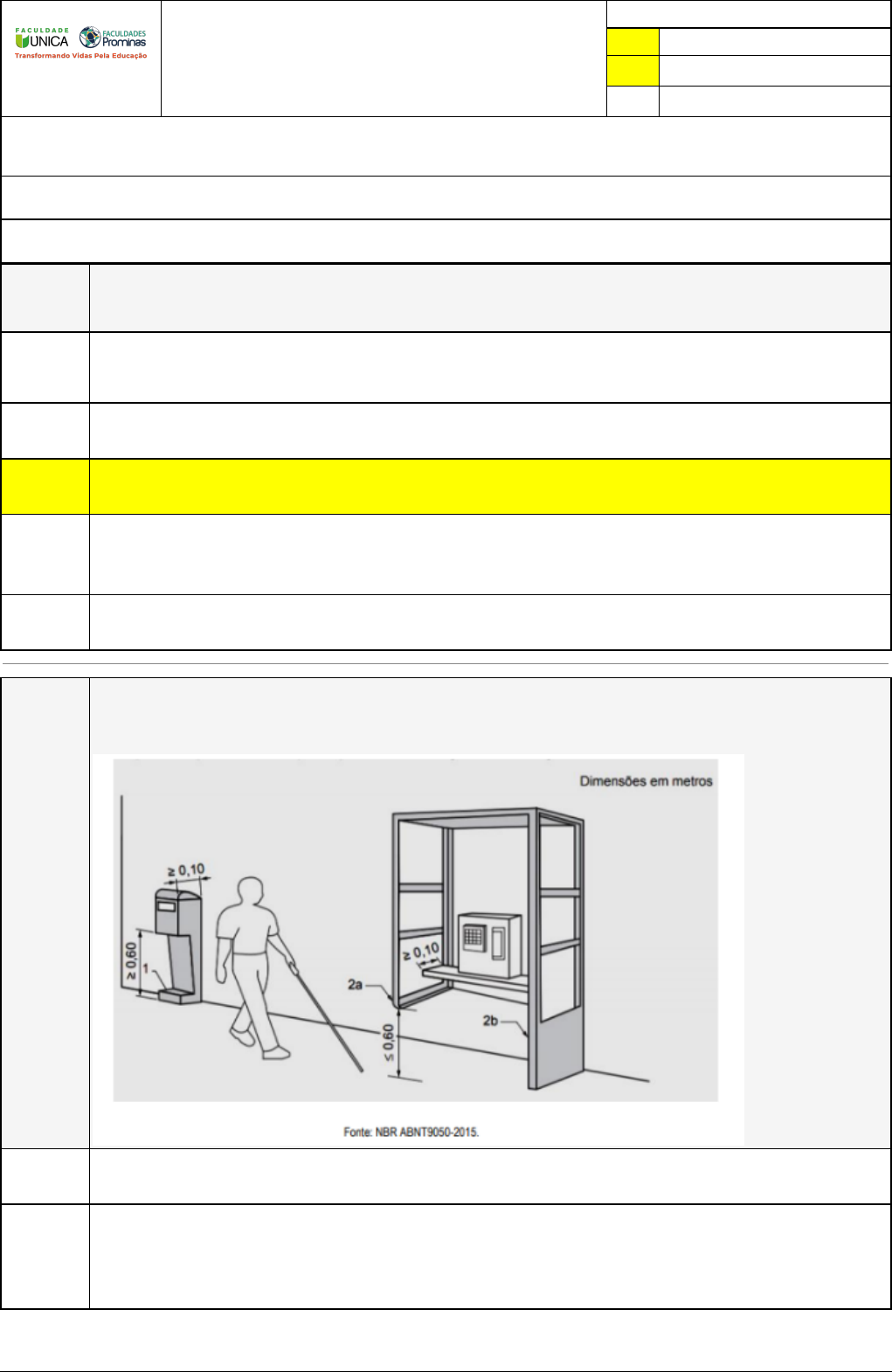 Pincel Atômico - 16/07/2023 20:44:29 1/3 ANA CAROLINA DE ARAÚJO COUTO Exercício Caminho do Conhecimento - Etapa 20 (18469) Atividade finalizada em 11/07/2023 09:00:05 (1062704 / 2) LEGENDA Resposta correta na questão # Resposta correta - Questão Anulada X Resposta selecionada pelo Aluno Disciplina: PRÁTICA PEDAGÓGICA INTERDISCIPLINAR: ATENDIMENTO EDUCACIONAL ESPECIALIZADO NA SALA DE RECURSOS MULTIFUNCIONAIS [863743] - Avaliação com 8 questões, com o peso total de 1,11 pontos [capítulos - 4] Turma: Segunda Graduação: Segunda Graduação 6 Meses - Licenciatura em Educação Especial - Grupo: FPD-MAIO2023 - SGegu0A220523 [92212] Aluno(a): 91471654 - ANA CAROLINA DE ARAÚJO COUTO - Respondeu 7 questões corretas, obtendo um total de 0,97 pontos como nota [357878_1232 19] Questão 001 De acordo com os conceitos previstos no Estatuto da Pessoa com Deficiência − Lei no 13.146/15, é correto afirmar: Acompanhante é aquele que acompanha a pessoa com deficiência, podendo ou não desempenhar as funções de atendente pessoal. Tecnologia assistiva ou ajuda técnica são aquelas que dificultam ou impedem o acesso da pessoa com deficiência às tecnologias. X Considera-se pessoa com deficiência aquela que tem impedimento de longo prazo de natureza física, mental ou sensorial, excluídos os impedimentos de ordem intelectual. Residências inclusivas são moradias com estruturas adequadas capazes de proporcionar serviços de apoio coletivos e individualizados que respeitem e ampliem o grau de autonomia de jovens e adultos com deficiência. Barreiras arquitetônicas são aquelas existentes nas vias e nos espaços públicos e privados abertos ao público ou de uso coletivo. [357878_1232 24] Questão 002 De acordo com a ABNT NBR 9050:2015 - Acessibilidade a edificações, mobiliário, espaços e equipamentos urbanos - e considerando a representação da imagem abaixo, é correto afirmar que: A figura acima demostra como deve ser feita a instalação de mobiliários fora da rota acessível. O numeral 1(um) na figura acima está sendo usado para indicar como deve ser uma borda ou saliência detectável com bengala longa, instalada na projeção de um mobiliário suspenso, desde que não seja necessária a aproximação de pessoas em cadeiras de rodas. Pincel Atômico - 16/07/2023 20:44:29 2/3 A figura acima apresenta possibilidades que dispensam apenas instalação de sinalização tátil. X Na figura acima (2a) indica como deve ser uma proteção lateral instalada desde o piso. A figura acima apresenta possibilidades que não dispensam a sinalização visual de alerta, desde de que não seja necessária a aproximação de pessoas em cadeiras de rodas. [357879_1027 46] Questão 003 Sobre a Declaração de Salamanca é Correto afirmar que: I. Esse documento é oriundo da Conferência Mundial sobre Necessidades Educativas Especiais, ocorrida na Espanha. II. Seu objeto era a inclusão dos alunos com necessidades educacionais no ensino regular. III. As escolas regulares deveriam aceitar as matrículas dos alunos om deficiência física, os demais seriam educados em salas separadas. I. III. X I, II. II, III. I, II, III. [357878_1027 42] Questão 004 O pior é que era coxa. Uns olhos tão lúcidos, uma boca tão fresca, uma postura tão senhoril: e coxa! Esse contraste faria suspeitar que a natureza é às vezes um imenso escárnio. Por que bonita, se coxa? Por que coxa, se bonita? (...) e eu sem acudir a coisa nenhuma, elevado ao pé da minha Vênus Manca (ASSIS, 2014, p. 210). O trecho acima representa X O preconceito banalizado e naturalizado na sociedade. Nenhuma das alternativas. Uma forma afetuosa de se referir a beleza da moça. O ganho de atributos positivos e relação à deficiência. A ideia de que é possível ser belo e deficiente na sociedade, sem nenhuma forma de discriminação. [357878_1232 23] Questão 005 A concepção e a implantação de projetos de uso público ou coletivo, bem como de políticas públicas, devem atender aos princípios do desenho universal, a fim de garantir o direito à acessibilidade. De acordo com a Lei n.º 13.146/2015 (Lei Brasileira de Inclusão da Pessoa com Deficiência), pode-se considerar desenho universal a concepção de produtos, equipamentos, dispositivos, recursos e serviços que promovam a inclusão de pessoas com deficiência ou mobilidade reduzida, incluindo adaptações e projetos específicos. produtos, ambientes, programas e serviços a serem usados por todas as pessoas, sem necessidade de adaptação ou projeto específico. produtos, ambientes e programas a serem usados somente por pessoas com deficiência ou com mobilidade reduzida, incluindo-se adaptações e projetos específicos. produtos, equipamentos, dispositivos, recursos e serviços que promovam a funcionalidade, relacionada à atividade e à participação de todas as pessoas, sem adaptações ou projetos específicos. Pincel Atômico - 16/07/2023 20:44:29 3/3 X produtos, equipamentos, dispositivos, recursos e serviços que promovam a funcio¬nalidade, relacionada exclusivamente à atividade e à participação da pessoa com deficiência ou com mobilidade reduzida, sem adaptações ou projetos específicos. [357880_1027 48] Questão 006 A Educação Especial é marcada segundo (MAZZOTA, 2011) no século XIX, momento em que parte da sociedade brasileira é inspirada pelos modelos de atendimento e serviços desenvolvidos nos Estados Unidos e Europa para cegos, surdos, deficientes físicos e mentais. Mesmo estando em tempos de maior desenvolvimento que o Brasil o modelo de atendimento desses países preconizava o paradigma da institucionalização. PORQUE as pessoas com deficiência eram retiradas de suas casas, contextos sociais e segregadas em instituições especializadas ou escolas especiais. A asserção I é uma proposição falsa, e a II é uma proposição verdadeira. As asserções I e II são proposições falsas. A asserção I é uma proposição verdadeira, e a II 
