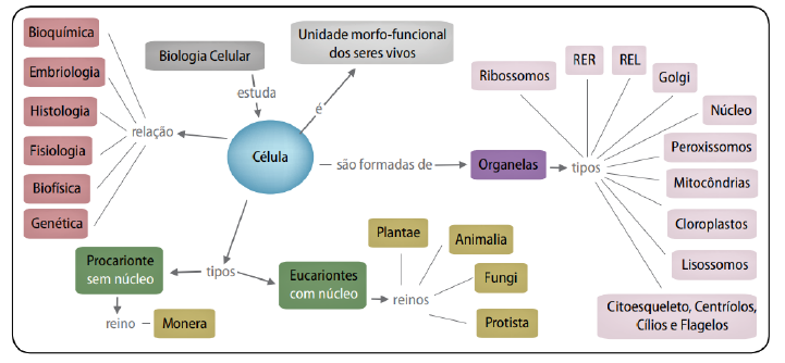 Biologia Celular 1.1 Introdução O estudo do universo biológico mostra que a evolução produziu uma imensa diversidade de formas vivas. Existem quatro milhões de espécies de animais, vegetais, fungos, protozoários e bactérias, cujos comportamentos, morfologia e funções diferem uns dos outros. Todos os organismos vivos são constituídos de células – pequenas unidades envolvidas por membrana e preenchidas por uma solução aquosa de agentes químicos, dotadas com uma extraordinária capacidade de criar cópias de si mesmas pelo crescimento e posterior divisão. Portanto, célula é a unidade estrutural da vida, extremamente complexa, dinâmica e econômica. Antes de iniciar o estudo da Biologia Celular, procure fazer uma análise do Mapa Conceitual apresentado na figura 1.1. Este mapa deve ser utilizado como uma ferramenta de ação pedagógica, bastante útil no ensino e na aprendizagem da Biologia Celular A célula é a menor unidade estrutural básica do ser vivo. Foi descoberta em 1667 pelo inglês Robert Hooke, que observou uma célula de cortiça (tecido vegetal morto) usando o microscópio. A partir daí, as técnicas de observação microscópicas avançaram em função de novas técnicas e aparelhos mais possantes. Pouco depois, comprovou-se que todas as células de um mesmo organismo têm o mesmo número de cromossomos. Este número é característico de cada espécie animal ou vegetal e responsável pela transmissão dos caracteres hereditários. O corpo humano tem cerca de 100 trilhões de células. Enquanto as células podem ser componentes de seres vivos maiores, nada, a não ser uma célula, poderá ser chamado de vivo. Os vírus, por exemplo, contêm alguns ou até o mesmo tipo de moléculas celulares, mas são incapazes de se reproduzirem por si mesmos; eles são reproduzidos pelo parasitismo da maquinaria celular que eles invadem e da qual se apropriam. Portanto, a célula é a unidade estrutural e funcional fundamental dos seres vivos, da mesma forma como o átomo é a unidade fundamental das estruturas químicas. Se por alguma razão a organização celular é destruída, a função da célula também é alterada. A maioria dos organismos vivos são células unicelulares; outros organismos, como nós próprios, são constituídos por vastas cidades multicelulares, nas quais grupos de células realizam funções especializadas e estão ligados por intrigados sistemas de comunicação. Teoria Celular • As células são as unidades morfológicas e fisiológicas de todos os organismos vivos; • As propriedades de um dado organismo dependem das propriedades de cada uma de suas células; • As células originam-se somente de outras células preexistentes e a continuidade é mantida através do material genético; • A menor unidade da vida é a célula 1.2 Origem e evolução das células Provavelmente, as primeiras células surgiram na Terra há cerca de 4 bilhões de anos. Antes dessa evolução biológica, houve uma evolução química que teve como cenário a Terra primitiva, com características bem diferentes da atual Terra. Compostos como metano, amônia, hidrogênio e vapor d’água combinaram-se para formar as primeiras moléculas orgânicas, que seriam mais tarde os componentes das grandes moléculas celulares. Posteriormente, com o processo de seleção natural da Terra primitiva, houve uma combinação vitoriosa dessas grandes moléculas, favorecendo a evolução das células. Os ácidos nucléicos, por exemplo: conferindo estabilidade, alta capacidade de guardar informações e replicação e as proteínas com eficiente ação catalítica. Praticamente toda síntese de qualquer composto pelas células passa pelo comando do DNA e pela atuação catalisadora das proteínas. Após o surgimento e aglomeração das primeiras moléculas informacionais, os coacervados ganharam poder de síntese de compostos orgânicos e de formarem novos coacervados com preservação das características originais. Nascia, assim, o mecanismo da reprodução e, conseqüentemente, as primeiras células. A partir de então, com o ganho de uma estabilidade e fidelidade físico-químicas, as primeiras células estavam prontas para perpetuarem-se e, por vezes, sofrerem mutações e pressões seletivas do meio, que desenharam o padrão celular atual. Coacervados → ainda não são considerados seres vivos, mas sim aglomerados de proteinoides, que se manteriam juntos, mergulhados no líquido circundante em forma de pequenas esferas (microesferas). Proteinoides → é uma molécula com as proteínas, formada inorganicamente a partir de aminoácidos A manutenção da vida na Terra dependeu, então, do aparecimento das primeiras células autotróficas, capazes de sintetizar moléculas complexas a partir de substâncias muito simples e da energia solar. Esse novo tipo celular seria provavelmente muito semelhante às “algas azuis” ou cianobactérias, que são bactérias ainda hoje existentes. Iniciou-se, assim, a fotossíntese, que ocorreu graças ao aparecimento, nas células, de certos pigmentos, como a clorofila. Graças à fotossíntese, surgiu o oxigênio na Terra, e isso permitiu o aparecimento de células aeróbias, ao mesmo tempo em que criou uma cobertura protetora de ozônio nas camadas superiores da atmosfera. As bactérias anaeróbicas ficaram restritas a nichos especiais, onde não existe oxigênio. A identidade celular foi conseguida a partir do momento em que a primeira célula ganha uma Membrana Plasmática, protetora e reguladora da entrada e saída de substâncias da célula. Isso torna o meio intracelular diferente, do ponto de vista físico-químico, do meio externo. Porém, o grande avanço adaptativo sofrido pelas células foi a formação de dobras, cisternas, vesículas, compartimentos e retículos originados da membrana primordial - era o nascimento da Célula Eucarionte, com seu Sistema de Endomembranas. Esse sistema possibilitou maior crescimento ce