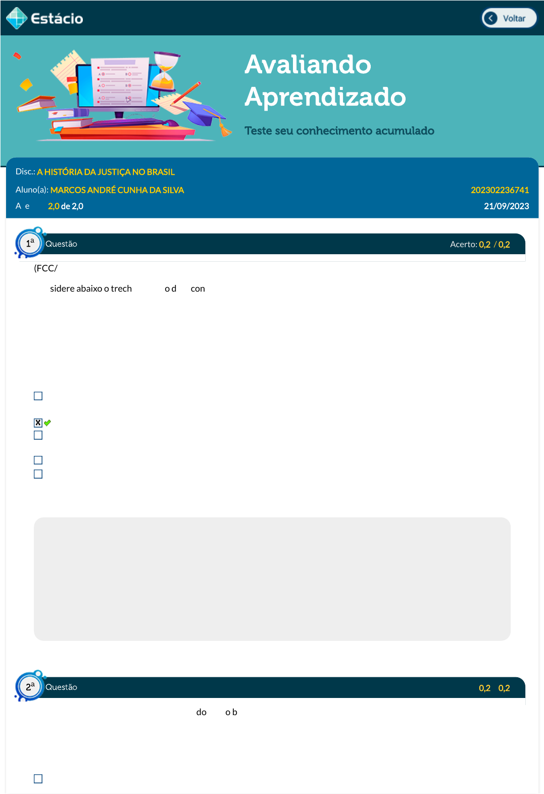 Avaliando Aprendizado Teste seu conhecimento acumulado Disc.: A HISTÓRIA DA JUSTIÇA NO BRASIL Aluno(a): MARCOS ANDRÉ CUNHA DA SILVA 202302236741 Acertos: 2,0 de 2,0 21/09/2023 Acerto: 0,2 / 0,2 (FCC/2018) Considere abaixo o trecho do Hino da Incon�dência Baiana. Igualdade e liberdade / No sacrário da Razão / ao lado da Sã Justiça / Preenchem meu coração / (...) Se este dogma for seguido (...) e assim que �orescido / tem na América a Nação / Assim �utue o pendão dos franceses / que a imitaram / depois que afoitos, entraram / no sacrário da Razão. (Apud MOURA, Clóvis. Dicionário da Escravidão Negra no Brasil. Edusp, 2004, p. 205) O trecho revela as seguintes in�uências da chamada Incon�dência Baiana (1798), também conhecida como Conjuração Baiana e Revolta dos Búzios: a Revolução Pernambucana e o nacionalismo como exemplos de libertação racional dos povos contra a escravidão e o colonialismo. a Revolução Francesa e o iluminismo, corrente que cultuava a Razão como valor universal. a Declaração dos Direitos do Homem e do Cidadão , e a Justiça praticada pela Maçonaria, como exemplos da defesa da igualdade em nome da Razão. o Império Napoleônico e o positivismo, escola que cultuava a ciência como Razão universal. o liberalismo e a religião calvinista, crença que considerava Deus como símbolo da Justiça e da Razão. Respondido em 21/09/2023 14:36:53 Explicação: Na manhã de 12 de agosto de 1798, a população de Salvador foi surpreendida pelo teor dos boletins manuscritos a�xados em prédios públicos, alguns dos quais com uma mensagem que convocava o povo baiano, favorável à República; era uma ordem, uma conclamação para uma necessária revolução. A informação foi acrescida pela convocação da população a participar do levante projetado pelo Partido da Liberdade: um grupo que se intitulava Anônimos Republicanos (MATTOSO, 1969). As autoridades dos dois lados do Atlântico não desconsideraram o peso dos termos veiculados nos boletins, liberdade, república e revolução, que naquela conjuntura compunham a cadência da Revolução Americana (1776), da Revolução Francesa (1789) e da revolução escrava em São Domingo (1791). MATTOSO, K. M. de Q. Presença francesa no movimento democrático baiano de 1798. Salvador: Itapuã, 1969. p. 150-159. Acerto: 0,2 / 0,2 Em 7 de abril de 1831, D. Pedro I abdicou do trono brasileiro em favor de seu �lho, Pedro. Ao período que sucedeu a esse ato chamou-se Regência, durante o qual o país foi governado por políticos em nome do imperador, à época com apenas cinco anos de idade. Algumas reformas institucionais marcaram esse período, que estendeu-se de 1831 a 1840. Entre elas está a criação das Assembleias Provinciais, que substituíram, com mais poderes, os antigos Conselhos Gerais. Essa mudança foi implantada por meio da: Criação da Guarda Nacional. Questão1 a Questão2 a https://simulado.estacio.br/alunos/inicio.asp javascript:voltar(); null Criação do Código de Processo Criminal. Promulgação do Ato Adicional. Dissolução dos Conselhos Gerais. Dissolução das Assembleias Provinciais. Respondido em 21/09/2023 14:37:08 Explicação: A resposta correta é: Promulgação do Ato Adicional. Acerto: 0,2 / 0,2 (VUNESP/2019) Leia o texto. "A comoção gerada pela notícia do Plano Cohen e o consequente medo do "perigo vermelho" serviram de pretexto para Vargas decretar a dissolução do Congresso Nacional, em 10 de novembro de 1937. O presidente outorgou uma nova Constituição [...]" (Patrícia Ramos Braick, Estudar história: das origens do homem à era digital) É correto a�rmar que a Constituição de 1937: ampliou os direitos de cidadania, como a liberdade de expressão, e estabeleceu a autonomia estadual. limitou a presença do Estado como agente econômico e criou algumas estatais, como a Petrobras. suspendeu as liberdades individuais dos cidadãos e impôs censura aos meios de comunicação. garantiu o direito de greve para os trabalhadores e instituiu o voto direto para a escolha dos governadores de estado. permitiu a criação de partidos políticos regionais e reforçou as atribuições do Poder Legislativo. Respondido em 21/09/2023 14:37:34 Explicação: A Constituição de 1937 �cou conhecida como ¿Polaka¿ pelo fato de ser inspirada pela Constituição polonesa, que era de matriz fascista. As principais características da ¿Polaka¿ foram: Regulamentação de uma estrutura corporativa em que empregadores e empregados estão submetidos ao controle ou à proteção do Estado; Estabelecimento da censura prévia a imprensa, cinema e rádio por meio do Departamento de Imprensa e Propaganda (DIP); Pena de morte para os crimes contra a ordem pública e organização do Estado; Proibição da greve e do lock-out (paralisação do trabalho por iniciativa do empregador); Organização de uma justiça do trabalho para mediar os con�itos entre patrões e empregados. Acerto: 0,2 / 0,2 Nas últimas décadas e em especial após a promulgação da Constituição Federal de 1988, o Supremo Tribunal Federal tem ocupado um papel de destaque no cenário político atual expandindo seus poderes. Na análise desses novos rumos destaca-se: I. O entendimento que denomina esse marco de ¿Supremocracia¿, num primeiro sentido referindo-se à autoridade do Supremo em relação às demais instâncias do judiciário (súmula vinculante) e num segundo sentido em relação à expansão de sua autoridade em relação aos demais poderes. II. O processo não recente de deslocamento da autoridade do sistema representativo para o judiciário e Questão3 a Questão4 a antes de tudo, um avanço das constituições rígidas, dotadas de sistema de controle de constitucionalidade e extremamente ambiciosas optando sobre tudo decidir. III. A maximização de competências do Supremo que atua como corte constitucional, tribunal de última instância e foro especializado. II e III, apenas. I e II