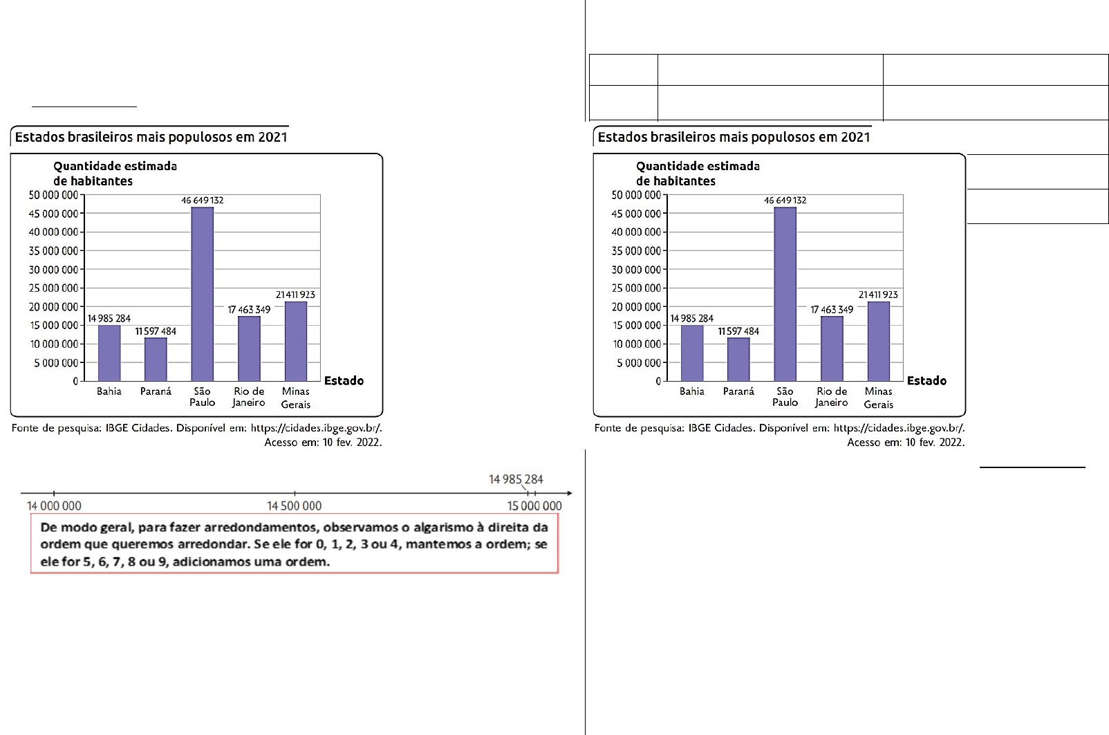 Arredondamento No gráfico está representada a população estimada dos cinco estados mais populosos do Brasil em 2021. Para facilitar a leitura e a interpretação desses números com muitos algarismos, fazemos um arredondamento de cada número para a unidade de milhão mais próxima. Assim, podemos dizer que a população do estado da Bahia era de aproximadamente 15000000 de habitantes em 2021. Já o Rio de Janeiro tinha uma população de aproximadamente 17000000 de habitantes nesse mesmo ano. A quantidade de habitantes na Bahia foi arredondada para 15000000, pois 14985284 está mais próximo desse número do que de 14000000. Atividade - Complete a segunda e a terceira coluna fazendo arredondamentos para a centena e para a unidade de milhar mais próximas. Número Número arredondado para a centena mais próxima Número arredondado para a unidade de milhar mais próxima 891 1617 2198 3444 Arredondamento No gráfico está representada a população estimada dos cinco estados mais populosos do Brasil em 2021. Para facilitar a leitura e a interpretação desses números com muitos algarismos, fazemos um arredondamento de cada número para a unidade de milhão mais próxima. Assim, podemos dizer que a população do estado da Bahia era de aproximadamente 15000000 de habitantes em 2021. Já o Rio de Janeiro tinha uma população de aproximadamente 17000000 de habitantes nesse mesmo ano. A quantidade de habitantes na Bahia foi arredondada para 15000000, pois 14985284 está mais próximo desse número do que de 14000000. Atividade - Complete a segunda e a terceira coluna fazendo arredondamentos para a centena e para a unidade de milhar mais próximas. Número Número arredondado para a centena mais próxima Número arredondado para a unidade de milhar mais próxima 891 1617 2198 3444