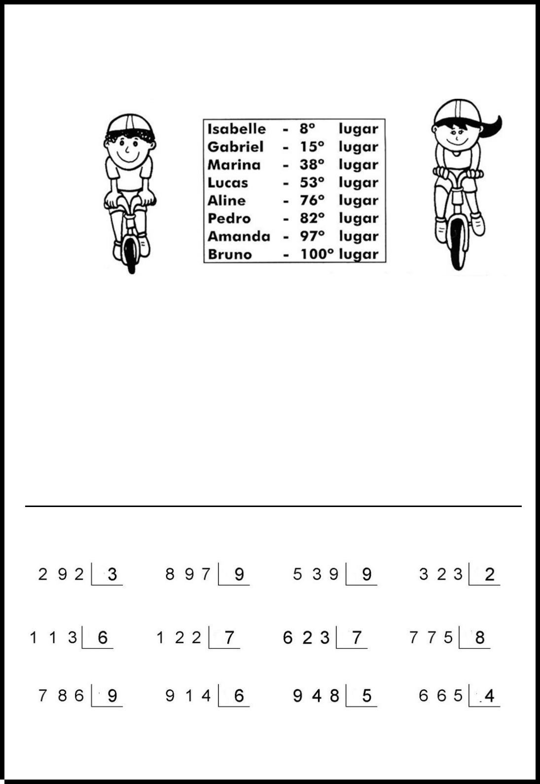 Escola Municipal Arlindo de Mello Atividade de matemática 1) Veja a classificação dos alunos do 5º ano no passeio ciclístico da escola: Agora responda: a) Quem chegou na frente dentre os nomes listados na tabela? ____________ b) Qual foi o ultimo a chegar? _______________ c) Coloque os números da tabela na ordem crescente: ___________________ _______________________. d) Escreva por extenso todos os números da tabela em seu caderno de matemática. 2) Resolva no caderno de matemática: Faça as operações e represente com números os resultados de cada operação no Q. P. Observe esta maquete e responda as questões:ESCOLA BIBLIOTECA SUPERMERCADO HOTEL SHOPPING BANCO RESTAURANTE ZOOLOGICO CINEMAHOTEL TEATROO A) Quantas ruas as alunas precisam atravessar para ir da escola á biblioteca a pé e pelo caminho mais curto? B) O ônibus que esta perto da biblioteca virou a esquerda e depois a direita. Qual é o ponto de referencia que ele passará perto? C) O ônibus que esta em frente a escola passou pelo supermercado, virou a esquerda e parou. Qual destino ele chegou? D) Rafaela saiu do teatro e entrou no restaurante. Qual foi o trajeto dela? ( ) atravessou a rua à sua direita ( ) atravessou a rua a sua esquerda E) O que é um ponto de referencia? Explique com suas palavras. F) Quais os pontos de referência existentes nesta maquete? G) Cite 2 pontos de referência perto da nossa escola. H) Cite 2 pontos de referência perto de onde você mora. Problemas de matemática 1) Uma loja começou a semana com 102 caixas de bombom. Até agora foram vendidas 45 caixas. Quantas caixas ainda faltam serem vendidas? 2) Em uma árvore havia 34 passarinhos, deu um vento e 29 desses voaram. Quantos pássaros ainda ficaram pousados na árvore? 3) Um pedreiro tinha que instalar 50 janelas. Ele já instalou 23. Quantas janelas ele ainda tem que instalar? 4) Uma galeria está fazendo uma exposição com 56 quadros. A exposição realizada por esta mesma galeria tinha 85 quadros. Quantos quadros a menos a galeria esta expondo? 5) Um fotógrafo tirou 561 fotos de bichos e 348 de pessoas. Foram fotografados mais bichos ou pessoas? E quantas fotos forma tiradas a mais? 6) Um comerciante tinha 1.000 quilos de arroz para vender em sua loja. Ele conseguiu vender apenas 699 quilos. Quantos quilos de arroz ele ainda tem na loja? Torneio Nome: _______________________________ Data: _______________ Turma: _______________ Valor: _______ Nota: _________ 1) Ditado de numerais: A)____________________________ B) ____________________________ C) ____________________________ D) ____________________________ E)____________________________ F) ____________________________ G) ___________________________ H) ___________________________ I) ____________________________ J) ____________________________ 2) Qual é o resultado dos fatos ditados: A)___________________ B) __________________ C) __________________ D) __________________ E)___________________ F) __________________ G) __________________ H) __________________ I) ___________________ J) __________________ H) __________________ L) __________________ M__________________