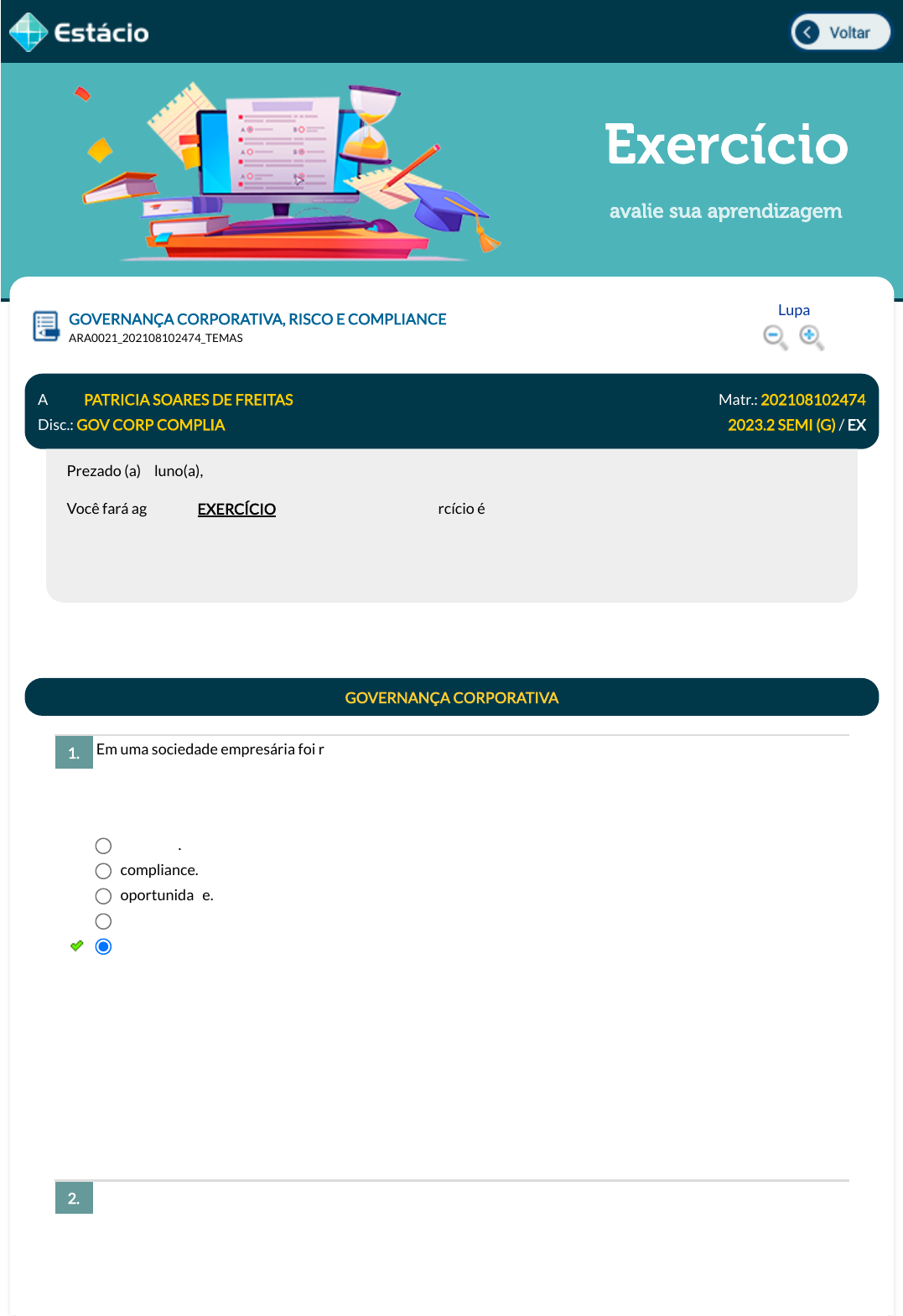 Exercício avalie sua aprendizagem Em uma sociedade empresária foi realizada a análise SWOT, com isso, foi constatada uma crise sanitária (pandemia) capaz de provocar prejuízos �nanceiros em virtude da legislação que obrigou o fechamento das empresas por um longo período. Com base nesse diagnóstico da análise SWOT, pode-se a�rmar que se trata de um caso de Uma notícia publicada no portal FGV pelo professor da Escola Brasileira de Educação Pública e de Empresas, professor Joaquim Rubens Fontes Filho, sobre economia no tempo de COVID-19, destaca: "Governança corporativa tem papel fundamental em tempos de crise". "É importante que controladores, conselheiros e administradores tenham um bom canal de relacionamento explicando claramente a sociedade e seus pequenos acionistas o que está ocorrendo e o que está sendo feito para GOVERNANÇA CORPORATIVA, RISCO E COMPLIANCE Lupa ARA0021_202108102474_TEMAS Aluno: PATRICIA SOARES DE FREITAS Matr.: 202108102474 Disc.: GOV CORP COMPLIA 2023.2 SEMI (G) / EX Prezado (a) Aluno(a), Você fará agora seu EXERCÍCIO! Lembre-se que este exercício é opcional, mas não valerá ponto para sua avaliação. O mesmo será composto de questões de múltipla escolha. Após responde cada questão, você terá acesso ao gabarito comentado e/ou à explicação da mesma. Aproveite para se familiarizar com este modelo de questões que será usado na sua AV e AVS. GOVERNANÇA CORPORATIVA 1. fraqueza. compliance. oportunidade. força. ameaça. Data Resp.: 28/08/2023 15:38:43 Explicação: As ameaças representam os cenários alheios à organização que podem trazer-lhe algum tipo de risco ou danos. São aqueles produtos ou serviços ofertados por concorrentes que se assemelham às atividades da empresa. Elas também podem indicar as possibilidades de novos entrantes no mercado ou de novas regulações e leis. 2. javascript:voltar(); javascript:voltar(); javascript:diminui(); javascript:aumenta(); melhorar a situação da empresa pelo menos no médio prazo", Joaquim Rubens destaca que, nesse momento a governança corporativa assume um papel fundamental, pois trata da relação entre os sócios e com a própria sociedade. Ele lembra de dois grupos importantes nessa estrutura. O primeiro deles são os pequenos investidores, que, com menos possibilidade de diversi�carem suas aplicações, serão severamente impactados pela crise. Ele destaca que a saída desses agentes pode trazer problemas de liquidez para as empresas, que terão muito mais di�culdades de captar recursos. Outro grupo importante são os empregados, que fazem parte do conjunto fundamental de stakeholders de uma empresa. "Governança corporativa signi�ca equidade de tratamento dos sócios e transparência nas relações. É importante então que controladores, conselheiros e administradores tenham um bom canal de relacionamento explicando claramente a sociedade e seus pequenos acionistas o que está ocorrendo e o que está sendo feito para melhorar a situação da empresa pelo menos no médio prazo", destaca. Disponível em https://portal.fgv.br/noticias/governanca-corporativa-tem-papel-fundamental-tempos-crise-destaca-especialista. acesso em 13/09/20 (adaptado) Sobre Governança Corporativa, analise os itens abaixo e assinale a única alternativa correta. I - Sistema que, usando principalmente o conselho de administração, a auditoria externa e o conselho �scal, estabelece regras e poderes para conselhos, comitês, diretoria e outros gestores, procurando prevenir abusos de poder e criando instrumentos de �scalização, princípios e regras que possibilitem uma gestão e�ciente e e�caz. II - As boas práticas de Governança Corporativa têm a �nalidade de aumentar o valor da sociedade, facilitar seu acesso ao capital e contribuir para sua perenidade. III - Sistema para recuperar e garantir a con�abilidade em uma determinada empresa para os seus acionistas, criando um conjunto e�ciente de mecanismos, tanto de incentivos como de monitoramento, a �m de assegurar que o comportamento dos executivos esteja sempre alinhado com o interesse dos acionistas, cujas ações serão executadas pelo Conselho de Administração. IV - Contribui para um desenvolvimento econômico sustentável, proporcionando melhorias no desempenho das empresas. Por estes motivos, torna-se tão importante ter conselheiros indicados pelo fundador, por questão de con�ança, independente da quali�cação, e sistemas de Governança Corporativa de qualidade, evitando-se assim diversos fracassos empresariais como abusos de poder, erros e fraudes. Ética empresarial e governança corporativa são conceitos distintos, mas relacionados. Sobre eles podemos a�rmar que: Apenas o item I está correto. Os itens I, II e IV estão corretos. Apenas o item II está correto. Os itens III e IV estão corretos. Os itens I e II estão corretos. Data Resp.: 28/08/2023 15:38:54 Explicação: Sobre o conselho de administração, é um órgão deliberativo, não de execução; sobre a indicação dos componentes do conselho, estes devem ser pessoas quali�cadas, não por ser indicado pelo fundador, se for o caso. 3. Visam o planejamento de longo prazo e abordam a responsabilidade dos níveis mais altos da administração em formular e reformular suas estratégias empresariais. Têm como objetivos demarcar os princípios que guiarão as ações a serem realizadas e em quanto tempo o resultado será alcançado. Embora a ética empresarial não seja um princípio da governança corporativa, representa a base que sustenta sua prática nas organizações. Determinam os padrões de desempenho operacional, gestão centralizadora e consideram as prioridades organizacionais acima das demandas da sociedade. É uma ferramenta de gestão fundamental para a realização da análise ambiental, constituindo a base do planejamento estratégico das organizações. Data Resp.: 28/08/2023 15:39:24 As variáveis do ambiente externo a organ