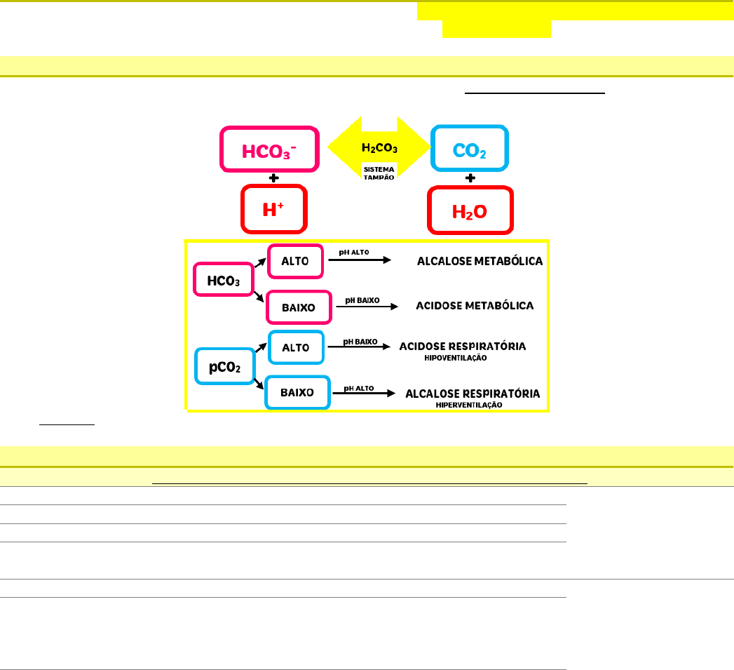 DISTÚRBIO ÁCIDO-BÁSICO DANIELA JUNQUEIRA GOMES TEIXEIRA 1. Síndromes glomerulares 2. Síndromes tubulares 3. Síndromes vasculares 4. Distúrbios hidroeletrolítico e ácido-básico 5. Síndrome urêmica DEFINIÇÃO O controle das pequenas oscilações do pH é feito pelos sistemas tampões, que evitam grandes oscilações; o principal deles é o sistema HCO3-/CO2 GASOMETRIA ARTERIAL VALORES NORMAIS PARA GASOMETRIA ARTERIAL pH = 7,35 - 7,45 PCO2 = 35 – 45 (mmHg) HCO3ACT = 22 – 26 (mEq/L) HCO3STD = 22 – 26 (mEq/L) → se der os dois bicarbonatos, escolher este BBECF = 48 (mEq/L) → total de base no plasma Ambos determinam se o distúrbio é agudo ou crônico. BEECF = -3,0 a +3,0 (mEq/L) → excesso de base do fluído extracelular, se vê a partir da variação do BB. · O número médio do bicarbonato é 24, que é a metade do BB, ou seja, metade das bases do corpo é bicarbonato. · O base excess é a variação do BB; se o BB aumenta para 50, o BE é +2. Um distúrbio agudo é aquele que ocorre até 3 dias, o distúrbio crônico é mais de 3 dias. Exemplos: DANIELA JUNQUEIRA GOMES TEIXEIRA EX1: pH = 7,2 pCO2 = 26 HCO3ACT = 15 HCO3STD = 12 BBECF = 40; BEECF = -8,0 É uma acidose metabólica EX2: pH = 7,50 pCO2 = 26 HCO3= 19 É uma alcalose respiratória EX3: pH = 7,25 pCO2 = 60 HCO3 = 26 É uma acidose respiratória EX4: pH = 7,48 pCO2 = 46 HCO3 = 32 É uma alcalose metabólica EX5: pH = 7,10 pCO2 = 50 HCO3 = 15 É uma acidose mista (respiratória + metabólica) EX6: pH = 7,70 pCO2 = 26 HCO3 = 32 É uma alcalose mista (respiratória + metabólica) EX5: pH = 7,40 pCO2 = 55 HCO3 = 32 É uma acidose respiratória + alcalose metabólica → um distúrbio compensa o outro RESPOSTA COMPENSATÓRIA · ACIDOSE METABÓLICA = HIPERVENTILAÇÃO pCO2 esperado = (1,5 x HCO3) + 8 (variação 2) · ALCALOSE METABÓLICA = HIPOVENTILAÇÃO pCO2 esperado = HCO3 + 15 (variação 2) Se ao calcular, o número bater, o distúrbio é simples; se não bater o distúrbio é misto. Exemplos: DANIELA JUNQUEIRA GOMES TEIXEIRA EX1: pH = 7,2 pCO2 = 26 HCO3 = 12 É uma acidose metabólica pCO2ESPERADO = (1,5 x 12) + 8 = 26 (2) compesada/pura/simples EX2: pH = 7,20 pCO2 = 34 HCO3= 12 É uma acidose metabólica pCO2ESPERADO = (1,5 x 12) + 8 = 26 (2) retendo CO2 (hipoventilação) → acidose respiratória + acidose respiratória = mista EX3: pH = 7,20 pCO2 = 22 HCO3 = 12 É uma acidose metabólica pCO2ESPERADO = (1,5 x 12) + 8 = 26 (2) expulsando CO2 (hiperventilação) → alcalose respiratória + alcalose respiratória = mista ACIDOSE METABÓLICA CAUSAS: · · Acidose lática (principal) · Cetoacidose · Uremia (IR) · Intoxicações · Perdas digestivas baixas (diarreia prolongada) · Acidoses tubulares renais ÂNION GAP – NORMAL ENTRE 8 A 12 São os ânions não-medidos. O total de cargas positivas é igual ao total de cargas negativas. Na+ = 140 mEq/L→ principal câtion Cl- + HCO3- = 106 + 24 mEq/L = 130) → principais ânions Logo, Na+ = (Cl + HCO3 + ânion gap), ou seja: 140 = 106 + 24 + 10 · Na acidose metabólica → como o bicarbonato cai: · · ou aumenta o cloro · ou aumenta o ânion gap! ACIDOSE METABÓLICA COM AG ALTO → SURGEM NOVOS ÁCIDOS · Acidose lática: ↑ ác. Lático (lactato- + H+) → entra muito ânion na circulação · Cetoacidose · Uremia · Intoxicações [salicilatos, metanol (ác. Fórmico), etilenoglicol (ác. Glicólico)] ACIDOSE METABÓLICA HIPERCLORÊMICA →QUEDA DO BICARBONATO (AG NORMAL) · · Perdas digestivas · Acidoses tubulares renais TRATAMENTO Tratar a condição de base! Lembrar que nas duas principais causas não é rotineiro administrar bicarbonato de sódio. · Acidose lática e cetoacidose: NÃO fazer NaHCO3. · Uremia e intoxicações: fazer NaHCO3. · Hiperclorêmicas: reposição de bases → citrato de potássio ALCALOSE METABÓLICA · Diuréticos tiazídicos/furosemida · Hiperaldosteronismo primário · HAS reno-vascular · Perdas digestivas altas: vômitos ou SNG · Pelo vômito ocorre perda de H+ e Cl- · Hipovolemia: queda do H+ e Cl-, K+ também diminui. · Ativa o SRAA, retendo sódio e excretando potássio (pela ação da aldosterona). · Hipocalemia! K+ sérico baixo Logo, as alcaloses metabólicas são hipoclorêmicas e hipocalêmicas! No caso de hipovolemia, no TCP, o sódio é reabsorvido, pois traz água consigo, mas não consegue eliminar o bicarbonato. Assim, a urina fica ácida! · HCO3 urinário: baixo (acidúria paradoxal) · Cl urinário: baixo (< 20 mEq/L) TRATAMENTO · Vômitos/Diuréticos · ↓volume ↓ K ↓ Cl → SF 0,9% + KCl · Hiperaldosteronismo primário (Síndrome De Conn) · Faz hipervolemia, diminuindo H+, Cl e K+; HCO3 urinário alto (urina alcalina); Cl urinário alto (> 20 mEq/L) · Espironolactona (resistente ao cloreto), cirurgia; · Estenose artéria renal · iECA (quebra cascata de evento do excesso da renina) e renovascular