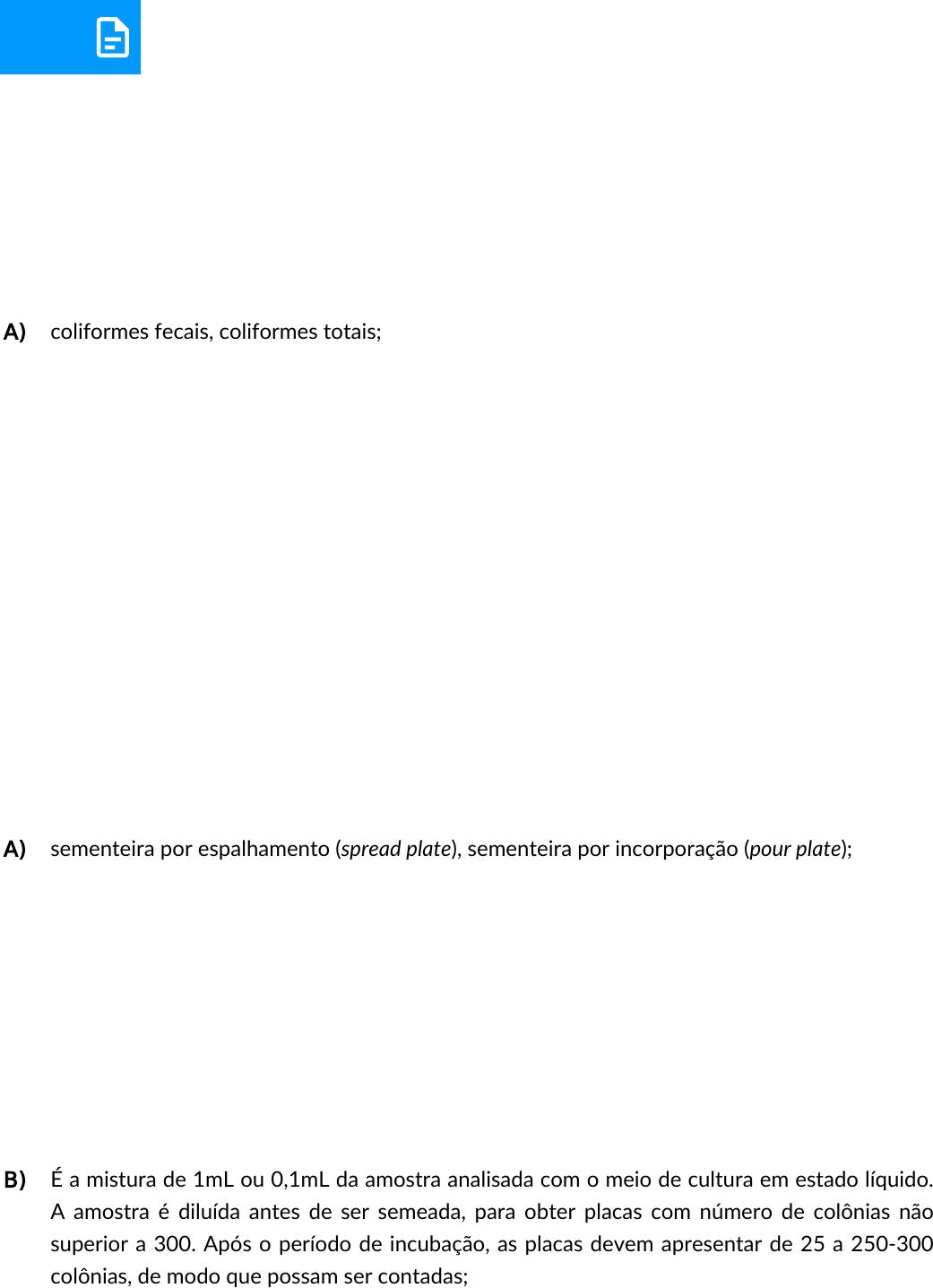 Pré Teste 1) A microbiologia de alimentos é o estudo dos microrganismos que habitam, crescem e contaminam os alimentos, sendo os de maior importância aqueles que causam a deterioração dos alimentos. Contudo, microrganismos benéficos, tais como os probióticos, estão se tornando importantes na ciência dos alimentos. A quantificação bacteriana é importante na microbiologia de alimentos para detectar possíveis contaminações com: A) coliformes fecais, coliformes totais; B) probióticos; C) leveduras. 2) Na natureza, os microrganismos encontram-se formando populações mistas (vários tipos de microrganismos que pertencem a um mesmo habitat). Por sua vez, o desenvolvimento da microbiologia, assim como todos os procedimentos laboratoriais para o diagnóstico, depende da obtenção de biomassa microbiana na forma de populações puras, que, quando desenvolvidas/crescidas em meios de cultura, são denominadas culturas puras ou axênicas (populações homogêneas quanto ao tipo de microrganismo, cultivadas em meios de cultura sem a presença de outras formas de vida contaminantes). A obtenção de uma cultura pura a partir de uma cultura mista denomina-se isolamento, que é conseguido por meio da semeadura dos microrganismos na superfície de meios de cultura sólidos em placas de Petri, o que permitirá a formação de colônias (que são populações isoladas que crescem na superfície desses meios). São exemplos de semeaduras para quantificação de bactérias em meios sólidos: A) sementeira por espalhamento (spread plate), sementeira por incorporação (pour plate); B) sementeira por espalhamento (spread plat) e difusão; C) sementeira por incorporação (pour plate) e difusão. 3) Como todos os seres vivos, os microrganismos necessitam de nutrientes apropriados ao seu desenvolvimento, assim como de condições físicas ou ambientais favoráveis. Quando eles são cultivados em laboratório, essas necessidades devem ser respeitadas. Indique a alternativa que aponta para semeadura por incorporação: A) O volume de 1mL ou 0,1mL da amostra analisada é pipetado em cima de meio de cultura e, após, espalhado com uma vareta de vidro por toda a superfície do ágar; B) É a mistura de 1mL ou 0,1mL da amostra analisada com o meio de cultura em estado líquido. A amostra é diluída antes de ser semeada, para obter placas com número de colônias não superior a 300. Após o período de incubação, as placas devem apresentar de 25 a 250-300 colônias, de modo que possam ser contadas; Uma alçada da colônia (ágar em placa) ou da cultura (de outro meio ou líquido) é introduzida no meio líquido, com agitação da alça, para maior difusão dos microrganismos (da alça para o C) Emily Realce Emily Realce Emily Realce meio e homogeneização no meio). Pode-se inclinar o tubo a 30° e esfregar o inóculo na parede deste; quando o tubo retornar à posição original, o inóculo se difundirá no meio. 4) A obtenção de uma cultura pura a partir de uma cultura mista denomina-se isolamento, conseguido por meio da semeadura dos microrganismos na superfície de meios de cultura sólidos em placas de Petri, o que permitirá a formação de colônias (populações isoladas que crescem na superfície desses meios). Indique a alternativa que aponta para semeadura por espalhamento: A) O volume de 1mL ou 0,1mL da amostra analisada é pipetado em cima de meio de cultura e, após, espalhado com uma vareta de vidro por toda a superfície do ágar; B) É a mistura de 1mL ou 0,1mL da amostra analisada com o meio de cultura em estado líquido. A amostra é diluída antes de ser semeada, para obter placas com número de colônias não superior a 300. Após o período de incubação, as placas devem apresentar de 25 a 250-300 colônias, de modo que possam ser contadas; C) Transferir uma alçada da cultura para meio sólido em placa e estriar com a alça bacteriológica sobre o meio. A estria pode ser realizada em movimento de zigue-zague (estria sinuosa) ou como uma linha reta sobre o meio (estria reta). 5) No momento do experimento, inicialmente acenda a chama do bico de Bunsen para criar a zona de segurança para poder trabalhar na sua experiência. Essa zona de segurança que é feita quando se acende a chama do bico de Bunsen é necessária para: A) esterilizar a área de outros microrganismos que possam existir ao redor e não prejudicar o experimento; B) inserir a chama na alça para retirarmos as impurezas, podendo ser desligada depois; C) A zona de segurança não é necessária para o laboratório virtual. Emily Realce Emily Realce Pós Teste 1) As soluções formadas por líquidos com sólidos dissolvidos são as mais comuns no cotidiano das pessoas. Água com sal ou água com açúcar são exemplos clássicos desse tipo de solução. Mas existem soluções, como os sucos concentrados adquiridos em supermercados, que necessitam receber certa quantidade de solvente no seu preparo. Trata-se das chamadas soluções concentradas. Elas apresentam grande quantidade de soluto em pouco solvente e, ao receberem quantidade extra de água (solventes), têm seu volume final aumentado. Ao adicionarmos solvente a determinada solução, estamos realizando uma diluição. Nesse procedimento, a quantidade de solvente é aumentada, e a quantidade de soluto permanece a mesma, o que leva a diminuição da concentração da solução. Tendo em vista o conceito de diluição, qual o objetivo da técnica de diluição para o diagnóstico laboratorial? A) A maioria dos laboratórios tem as soluções armazenadas em concentração mais alta, seja por conveniência, seja para evitar a contaminação. Por isso, faz as diluições de acordo com a demanda e a necessidade para determinado exame; B) A maioria dos laboratórios tem as soluções armazenadas em concentração mais baixa, seja por conveniência, seja para evitar a contaminação. Por isso, faz as diluições de acordo com a demanda e a necessidade para determi