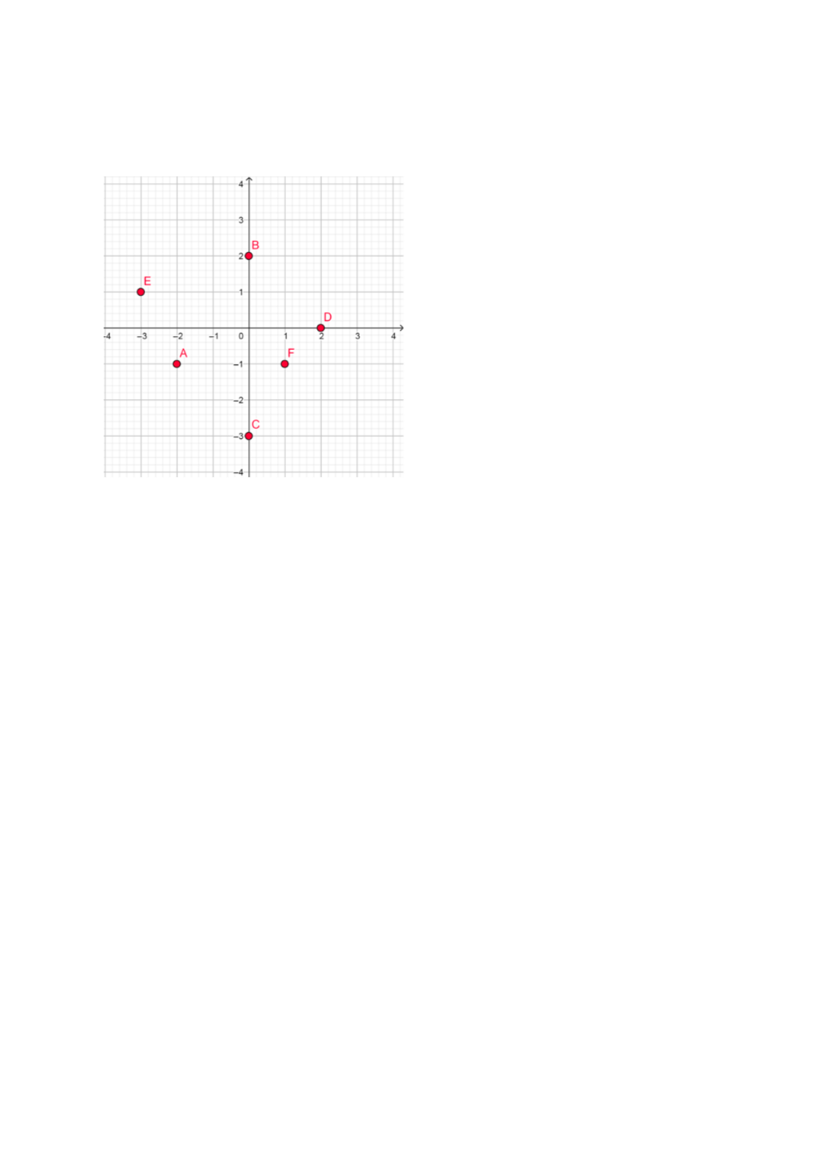 Resposta correta I e III. Observe os pontos A, B, C, D e F plotados no plano cartesiano. Identifique suas coordenadas e considere as afirmativas a seguir: I . O ponto F pertence ao conjunto de pontos da reta y=-x, segunda bissetriz. II. O ponto A (-2, -1) está localizado no segundo quadrante e possui mesma abscissa de F. III. Os pontos B e C possuem abscissas nulas e o ponto D possui ordenada nula. IV. O ponto E (-3, 1) pertence ao terceiro quadrante e possui ordenada negativa. É correto o que se afirma apenas nas alternativas: Resposta correta II e III. Cada esquema de flechas abaixo definem ou não uma função de Observe as relações representadas nos diagramas 1 e 2 e julgue as afirmativas a seguir: I . O diagrama 1 não representa uma função, pois sobram elementos no conjunto B (sem relação com nenhum elemento em A). II. O diagrama 2 representa uma função, pois cada elemento do conjunto A se relaciona com apenas um, e somente um, elemento do conjunto B. III. O diagrama 1 não representa uma função por conta do elemento 2 (em A) não se relacionar com um elemento em B. IV. O diagrama 2 não representa uma função, devido ao fato de sobrar elementos no conjunto B (sem relação com elementos em A). É correto o que se afirma apenas nas alternativas: Resposta correta I, III e IV. Observe os pontos A, B, C, D e F plotados no plano cartesiano. Identifique suas coordenadas e considere as afirmativas a seguir: I . O ponto A pertence ao conjunto de pontos da reta y=x, primeira bissetriz. II. O ponto F (-2, 2) está localizado no quarto quadrante. III. O ponto D possui ordenada nula e o ponto C possui abscissa nula. IV. Os pontos E e B possuem abscissas iguais e ordenadas iguais em valores absolutos. É correto o que se afirma em: Resposta correta III. Observe os pontos A, B, C, D, E e F plotados no plano cartesiano. Identifique suas coordenadas e considere as afirmativas a seguir: I . O ponto A possui ordenada negativa e abscissa positiva. II. O ponto F (-3, 2) está localizado no quarto quadrante. III. O ponto D possui abscissa nula e o ponto C possui ordenada nula. IV. O ponto E (- 4, -2) pertence ao terceiro quadrante. É correto o que se afirma apenas nas alternativas: Resposta correta II e III. Cada esquema de flechas abaixo definem ou não uma função de em . Observe as relações representadas nos diagramas 1 e 2 e julgue as afirmativas a seguir: I . O diagrama 1 não representa uma função, pois sobram elementos no conjunto B (sem relação com nenhum elemento em A). II. O diagrama 2 representa uma função, pois cada elemento do conjunto A se relaciona com apenas um, e somente um, elemento do conjunto B. III. O diagrama 1 não representa uma função por conta do elemento 1 (em A) se relacionar com os elementos 2 e 3 (em B). IV. O diagrama 2 não representa uma função, devido ao fato de todos os elementos de A se relacionar apenas com o elemento 1, pertencente ao conjunto B. É correto o que se afirma apenas nas alternativas: Resposta correta II e III. Cada esquema de flechas abaixo definem ou não uma função de em Observe as relações representadas nos diagramas 1 e 2 e julgue as afirmativas a seguir: Em relação às relações apresentada nos diagramas considere as afirmativas a seguir: I . O diagrama 1 não representa uma função, pois sobram elementos no conjunto B (sem relação com nenhum elemento em A). II. O diagrama 2 representa uma função, pois cada elemento do conjunto A se relaciona com apenas um, e somente um, elemento do conjunto B. III. O diagrama 1 não representa uma função por conta do elemento 1 (em A) se relacionar com dois elementos em B. IV. O diagrama 2 não representa uma função, devido ao fato de sobrar elementos no conjunto B (sem relação com elementos em A). É correto o que se afirma apenas nas alternativas: