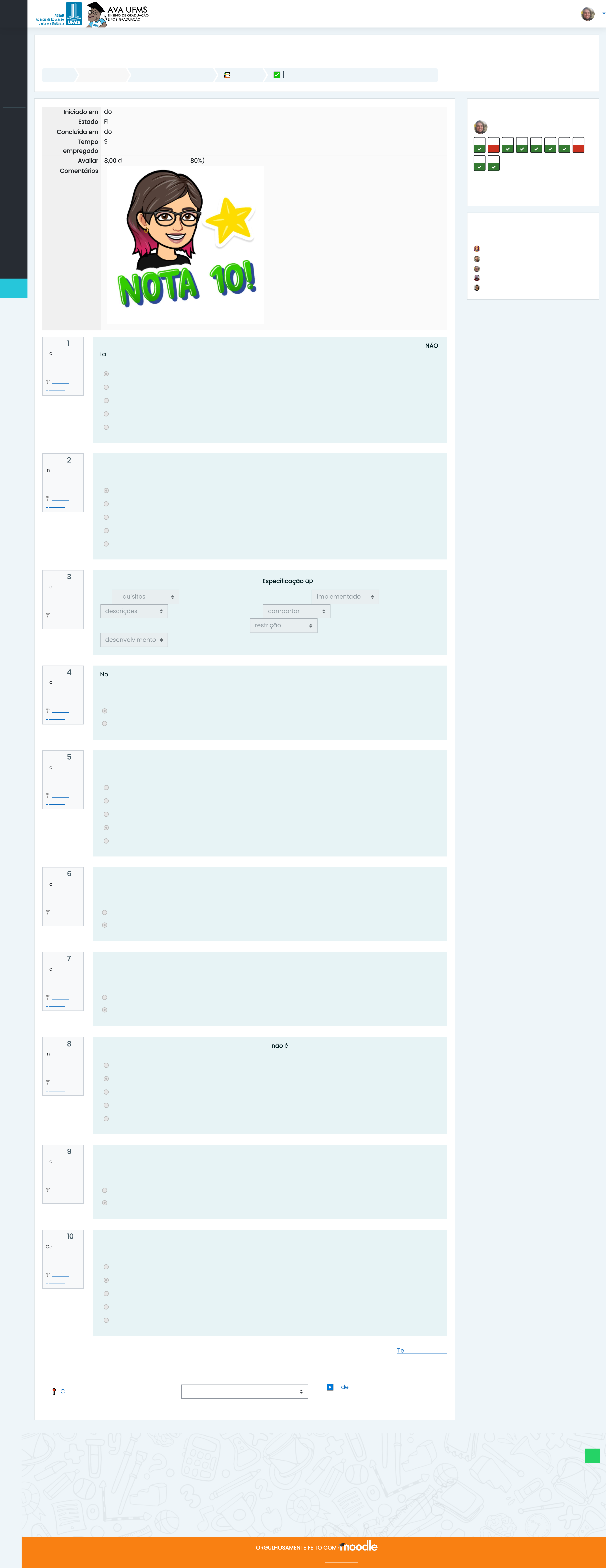 ORGULHOSAMENTE FEITO COM Feito com por conecti.me FORMAÇÃO PROFISSIONAL EM COMPUTAÇÃO-T01-2023-2 Painel Meus cursos 32010001862-T01-2023-2 📚 Módulo 1 ✅ [A1] Avaliação do Módulo 1 - Proposta de projetos Questão 1 Correto Atingiu 1,00 de 1,00 Marcar questão Questão 2 Incorreto Atingiu 0,00 de 1,00 Marcar questão Questão 3 Correto Atingiu 1,00 de 1,00 Marcar questão Questão 4 Correto Atingiu 1,00 de 1,00 Marcar questão Questão 5 Correto Atingiu 1,00 de 1,00 Marcar questão Questão 6 Correto Atingiu 1,00 de 1,00 Marcar questão Questão 7 Correto Atingiu 1,00 de 1,00 Marcar questão Questão 8 Incorreto Atingiu 0,00 de 1,00 Marcar questão Questão 9 Correto Atingiu 1,00 de 1,00 Marcar questão Questão 10 Correto Atingiu 1,00 de 1,00 Marcar questão Iniciado em domingo, 20 ago 2023, 16:33 Estado Finalizada Concluída em domingo, 20 ago 2023, 16:43 Tempo empregado 9 minutos 51 segundos Avaliar 8,00 de um máximo de 10,00(80%) Comentários Terminar revisão De acordo com as atividades típicas de Engenharia de Requisitos definidas por Reinehr (2020), qual atividade NÃO faz parte dessa etapa? a. Implantação. b. Elicitação. c. Análise. d. Especificação. e. Validação. De acordo com Reinehr (2020), qual etapa do projeto de software é composta, dentre outras, pelas atividades de transição e migração de dados? a. Desenvolvimento. b. Descontinuação. c. Manutenção. d. Concepção. e. Análise. Selecione as palavras que faltam sobre a definição de Especificação apresentada na videoaula da disciplina: “Os são uma especificação do que deve ser . São de como o sistema deve se ou de uma propriedade ou atributo do sistema. Eles também podem ser uma no processo de do sistema.” requisitos implementado descrições comportar restrição desenvolvimento No documento de Especificação de Requisitos de Software é onde encontramos o resultado final da etapa de desenvolvimento de requisitos e a descrição do comportamento, características e restrições do sistema. Escolha uma opção: Verdadeiro Falso De acordo com Reinehr (2020), qual etapa do projeto de software é composta, dentre outras, pelas atividades de homologação e implantação do software? a. Manutenção. b. Análise. c. Descontinuação. d. Desenvolvimento. e. Concepção. De acordo com Reinehr (2020), não é na validação dos requisitos que se busca garantir a compreensão correta dos requisitos. Escolha uma opção: Verdadeiro Falso De acordo com Reinehr (2020), problemas com requisitos representam a minoria dos problemas em projetos de software. Escolha uma opção: Verdadeiro Falso De acordo com Reinehr (2020), assinale a alternativa que não é um problema relacionado aos Requisitos: a. Ser tecnicamente inviável. b. Ser difícil de testar. c. Ser complexo. d. Ser ambíguo. e. Ser incompleto. Um Requisito funcional é uma política, diretriz, norma ou regulamento que define ou restringe algum aspecto do negócio. Escolha uma opção: Verdadeiro Falso De acordo com Reinehr (2020), qual etapa do projeto de software é composta, dentre outras, pelas atividades de correção e melhoria das funcionalidades? a. Análise. b. Manutenção. c. Descontinuação. d. Concepção. e. Desenvolvimento. Atividade anterior ◄ 📍 [Checkout de Presença] Módulo 1 - Proposta de projetos Seguir para... Próxima atividade ▶ Videoaula Obrigatória - Módulo 2 - Unidade 1 - Iniciando o Desenvolvimento de Projeto ► Navegação do questionário VITOR HUGO MOSCARDE Mostrar uma página por vez Terminar revisão 1 2 3 4 5 6 7 8 9 10 Usuários Online 5 usuários online (últimos 5 minutos) ANA PAULA SOUZA THIAGO ZANAO CAMPAGNARO VITOR HUGO MOSCARDE DIEGO JUNIOR TAMIOZZO KELLEN CRISTINA PEREIRA Manter contato Suporte Técnico ao Usuário https://suporteagetic.ufms.br (67) 3345-7613 suporte.agead@ufms.br https://moodle.org/ http://conecti.me/ https://ava.ufms.br/my/ https://ava.ufms.br/course/view.php?id=51430 https://ava.ufms.br/course/view.php?id=51430#section-2 https://ava.ufms.br/mod/quiz/view.php?id=666926 https://ava.ufms.br/mod/quiz/view.php?id=666926 https://ava.ufms.br/mod/assign/view.php?id=666924&forceview=1 https://ava.ufms.br/mod/url/view.php?id=666928&forceview=1 https://ava.ufms.br/user/view.php?id=47058&course=51430 https://ava.ufms.br/mod/quiz/review.php?attempt=736753&cmid=666926&showall=0 https://ava.ufms.br/mod/quiz/view.php?id=666926 https://ava.ufms.br/message/index.php?id=46556 https://ava.ufms.br/message/index.php?id=46610 https://ava.ufms.br/message/index.php?id=46591 https://ava.ufms.br/message/index.php?id=46735 https://ava.ufms.br/user/view.php?id=46556&course=51430 https://ava.ufms.br/user/view.php?id=46610&course=51430 https://ava.ufms.br/user/view.php?id=47058&course=51430 https://ava.ufms.br/user/view.php?id=46591&course=51430 https://ava.ufms.br/user/view.php?id=46735&course=51430 https://suporteagetic.ufms.br/ tel:(67) 3345-7613 mailto:suporte.agead@ufms.br https://api.whatsapp.com/send?phone=556733457613 javascript:void(0); https://ava.ufms.br/user/index.php?id=51430 https://ava.ufms.br/admin/tool/lp/coursecompetencies.php?courseid=51430 https://ava.ufms.br/grade/report/index.php?id=51430 https://ava.ufms.br/my/ https://ava.ufms.br/?redirect=0 https://ava.ufms.br/calendar/view.php?view=month&course=51430 javascript:void(0); https://ava.ufms.br/user/files.php https://ava.ufms.br/
