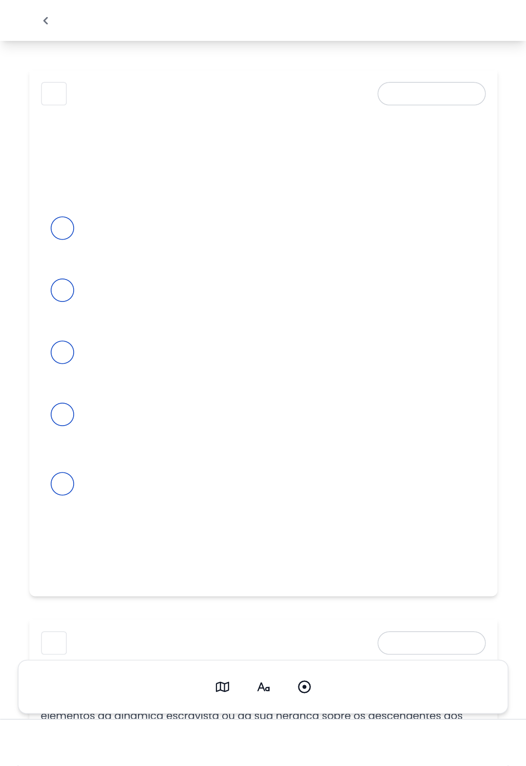 07/11/2023, 00:12 Exercício https://aluno.qlabs.com.br/exercicio/7308688 1/8 1 Entre as formas de resistência do povo negro escravizado, é preciso falar dos levantes e tentativas de reorganização política. A Revolta dos Malês é um bom exemplo, uma vez que: A defende o retorno dos africanos ao continente. B se associa aos indígenas e funda a umbanda. C recria o imaginário de uma África bucólica. D foi um levante em que brancos e negros se uniram contra a coroa. E foi orquestrado em um centro urbano vital e teve grandes impactos em todo território. Responder 2 A questão da migração rural para os centros urbanos foi algo a ser discutido. Por um tempo, ouviu-se sobre processos econômicos, mas a migração guarda relação com elementos da dinâmica escravista ou da sua herança sobre os descendentes dos escravizados. Assinale a alternativa cuja afirmativa demonstra tal ideia. Marcar para revisão Marcar para revisão undefined Questão 1 de 10 Finalizar exercício Sair e finalizar depois Exercício - Quilombos e e Cultura Africana no Brasil 07/11/2023, 00:12 Exercício https://aluno.qlabs.com.br/exercicio/7308688 2/8 A A oportunidade de empregos sem preconceitos levou os descendentes à cidade. B A vingança dos donos de fazenda transformaram a cidade como única possibilidade. C As fábricas, como precisavam de mão de obra, pagaram para os homens abandonarem as fazendas. D Os escravos de ganho já eram a maioria, então não teve uma mudança demográfica em termos de descendentes de escravizados. E Os processos de migração de fazenda em fazenda, decorrente da tentativa de se livrar do peso da escravização, acabou por ser um estímulo às cidades pós-abolição. Responder 3 Não sou descendente de escravos, mas de homens e mulheres que foram escravizados. Essa afirmação recente busca reestabelecer a visão mais: A econômica da escravidão. B social da escravidão. Marcar para revisão undefined Questão 1 de 10 Exercício - Quilombos e e Cultura Africana no Brasil 07/11/2023, 00:12 Exercício https://aluno.qlabs.com.br/exercicio/7308688 3/8 C política da escravidão. D cultural de escravidão. E humanizada da escravidão. Responder 4 A escravidão é marcada por diferentes tipos de violência. Entre tais práticas de violência, a dinâmica atlântica foi particularmente impactante pela: A quebra absoluta da demografia. B retirada exclusiva de mulheres da África. C retirada exclusiva de homens da África. D retirada principal de crianças da África. E retirada de grupos diversos e o aculturamento estruturado. Marcar para revisão undefined Questão 1 de 10 Exercício - Quilombos e e Cultura Africana no Brasil 07/11/2023, 00:12 Exercício https://aluno.qlabs.com.br/exercicio/7308688 4/8 Responder 5 Uma grande querela historiográfica está na concepção de Isabel como a redentora dos escravos em 1888. A visão que uma historiografia decolonial defende é: A não falar da exclusão. B queimar documentos da escravidão. C fragilizar o papel de Isabel, que só seguiu ordens do pai. D chamar atenção para o papel dos ingleses. E sinalizar a luta histórica, efetiva, e com sucessos de homens e mulheres negros. Responder 6 O escravismo não nasce como uma proposta de genocídio, mas sim, enquanto uma lucrativa empresa que favorece o colonialismo. Sobre a economia escravista podemos afirmar que: Marcar para revisão Marcar para revisão undefined Questão 1 de 10 Exercício - Quilombos e e Cultura Africana no Brasil 07/11/2023, 00:12 Exercício https://aluno.qlabs.com.br/exercicio/7308688 5/8 A foi um processo distante, se valendo da escravidão africana. B os governos não participavam do comércio de forma direta. C os governos eram os responsáveis por capturar e vender escravos. D a escravidão é um direito decorrente da superioridade branca. E a escravidão funciona como concessões a empresas e grupos por parte das coroas. Responder 7 A definição de Africano Livre ganha força durante os anos de 1850. A quem se referiam? A Aos escravos alforriados. B Às pessoas de descendência africana. C Aos ex-escravos que lutavam os quilombos. Marcar para revisão undefined Questão 1 de 10 Exercício - Quilombos e e Cultura Africana no Brasil 07/11/2023, 00:12 Exercício https://aluno.qlabs.com.br/exercicio/7308688 6/8 D Àqueles oriundos do tráfico interno no Brasil. E Àqueles oriundos do tráfico atlântico quando já estava proibido. Responder 8 Com a abolição, podemos afirmar que a situação das populações descendentes de africanos no Brasil ganhou um novo status jurídico, mas não social. Sobre os primeiros anos do início do século XX para os descendentes de homens e mulheres escravizados notamos que: A vivem a indigência e abandono. B vivem a igualdade de direitos e possibilidades como cidadãos. C enfrentam a indiferença, pois a abolição não mudou nada. D há uma cultura dominante que marca o Brasil e defende separação de raças. E se organizaram em comunidades urbanas ou campesinas como forma de defesa. Marcar para revisão undefined Questão 1 de 10 Exercício - Quilombos e e Cultura Africana no Brasil 07/11/2023, 00:12 Exercício https://aluno.qlabs.com.br/exercicio/7308688 7/8 Responder 9 As vozes de luta foram constantes e marcaram o sentido da resistência. Nesse sentido, a resistência dos descendentes de africanos pode ser observada nos seguintes grupos: I - Quilombos. II - Alforriados. III - Irmandades de homens e mulheres pretos e pretas. Está(ão) correta(s): A I e II, somente. B I e III, somente. C II e III, somente. D I, somente. E I, II e III. Responder 10 Marcar para revisão Marcar para revisãoundefined Questão 1 de 10 Exercício - Quilombos e e Cultura Africana no Brasil 07/11/2023, 00:12 Exercício https://aluno.qlabs.com.br/exercicio/7308688 8/8 Jean Baptiste Debret retratou o cotidiano do início da corte no Brasil e a chegada de novos tempos. Mas chama atenção o papel que ele atribui à população negra nas ruas. Podemo
