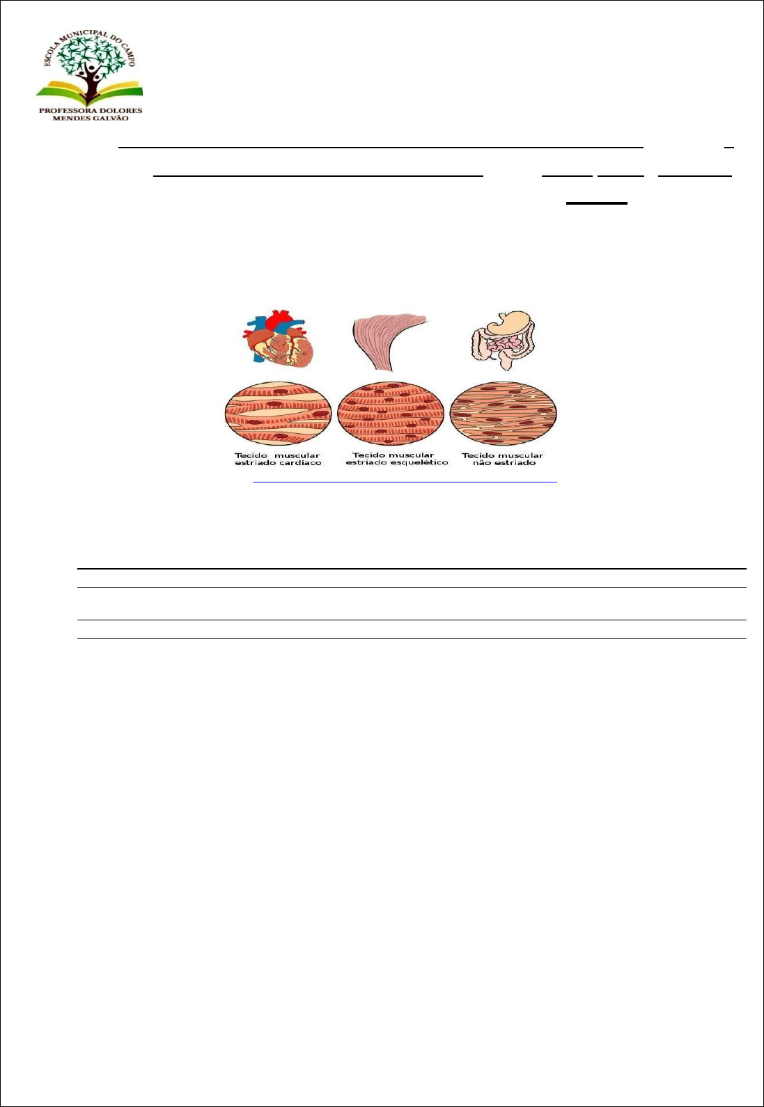 ESCOLA MUNICIPAL DO CAMPO PROFESSORA DOLORES MENDES GALVÃO – EDUCAÇÃO INFANTIL E ENSINO FUNDAMENTAL. 3º TRIMESTRE – 2023 ALUNO (A): _ 5º ano _ _ PROFESSOR (A): _DATA: / /_ _. 2º AVALIAÇÃO DE CIÊNCIAS – VALOR: 5,0 – NOTA: 1- Na maioria dos seres pluricelulares, as células que apresentam estruturas e funções semelhantes estão agrupadas, formando os tecidos. Os tecidos são estruturas formadas por um conjunto constituído por células semelhantes, que atuam para desempenhar uma mesma função, e pela matriz extracelular. (0,8) https://www.mairinque.sp.gov.br/arquivos/atividades-domiciliares/pdf Sobre os tecidos, responda: a) Qual a sua função? b) Onde são encontrados? 2- Vários órgãos interagem no corpo humano, desempenhando determinada função no organismo. Esse conjunto de órgãos associados forma um sistema. O corpo humano apresenta vários sistemas, que garantem, por exemplo, a captação de oxigênio, o aproveitamento de nutrientes e a locomoão. Identifique e relacione cada sistema do organismo de acordo com a função que desempenha no corpo humano: (0,6) (A) CARDIOVASCULAR, (B) DIGESTÓRIO, (C) ESQUELÉTICO, (D) MUSCULAR, (E) NERVOSO e (F) RESPIRATÓRIO. ( ) Constituído pelo coração e vasos sanguíneos, garante a circulação do sangue pelo organismo e, consequentemente, o transporte de oxigênio e nutrientes para todas as células. ( ) É responsável por garantir a quebra dos alimentos, transformando-os em partículas menores que possam ser aproveitadas. ( ) Constituído principalmente pelos ossos, está relacionado com funções como a proteção deórgãos internos, locomoção, sustentação, armazenamento de cálcio e produção de células sanguíneas. ( ) Formado pelo nariz, faringe, laringe, traqueia, brônquios, bronquíolos e alvéolos, é responsável por garantir a realização das trocas gasosas. ( ) É responsável por garantir a percepção de estímulos internos e externos e gerar respostas a esses estímulos. Graças a esse sistema, somos capazes de memorizar, ter coordenação, falar, sentir, ver e aprender. http://www.mairinque.sp.gov.br/arquivos/atividades-domiciliares/pdf ( ) É formado pelos músculos e está relacionado com a movimentação do nosso corpo e contração de órgãos. 3- Os órgãos do nosso corpo fazem parte de diferentes sistemas. O coração, o estômago e os pulmões fazem parte, respectivamente, dos sistemas: (0,8) a) nervoso, respiratório e muscular. b) digestório, respiratório e muscular. c) cardiovascular, esquelético e nervoso. d) muscular, cardiovascular e nervoso. e) cardiovascular, digestório e respiratório. 4- Todos os órgãos têm a mesma função? Justifique sua resposta.(0,5) Os tecidos compõem os órgãos, estruturas específicas nos seres vivos. O tipo de tecido que compõe cada órgão está relacionado à sua função. Um órgão humano pode apresentar vários tecidos, como é possível perceber no esquema a seguir:Todos os órgãos do nosso corpo apresentam grande importância. Identifique e relacione cada orgão do corpo humano com sua determinada função: (1,0) (A) CORAÇÃO, (B) PULMÕES, (C) INTESTINO GROSSO, (D) ESTÔMAGO e (E) BEXIGA. ( ) Local de armazenamento da urina após a formação desse produto pelos rins. ( ) Órgão do sistema digestório em que parte da digestão acontece. Ele é responsável por produzir o suco gástrico e transformar o bolo alimentar em quimo. ( ) Onde acontece a absorção da água e a formação das fezes. ( ) Órgãos esponjosos do sistema respiratório ricos em alvéolos, que são os locais onde ocorrem as trocas gasosas. ( ) Órgão responsável por impulsionar o sangue para o corpo. Graças a esse bombeamento, as células conseguem adquirir oxigênio e outros nutrientes necessários. https://www.mairinque.sp.gov.br/arquivos/atividades-domiciliares.pdf 5- O coração é o órgão responsável por bombear sangue para todo o corpo. Para isso, os movimentos de sístole e diástole, dois momentos primordiais no ciclo cardíaco, realizam, respectivamente:(0,8) a) contração, enchendo-se de sangue, e relaxamento, liberando sangue para o corpo. b) relaxamento, recebendo sangue, e contração, liberando sangue para o corpo. c) contração, bombeando sangue para o corpo, e relaxamento, enchendo-se de sangue. d) contração, transformando sangue arterial em venoso, e relaxamento, liberando sangue para o corpo. https://www.todamateria.com.br/sistema-cardiovascular-exercicios/ 6- Qual a importância da água para o corpo humano?(0,5) http://www.mairinque.sp.gov.br/arquivos/atividades-domiciliares.pdf https://www.todamateria.com.br/sistema-cardiovascular-exercicios/