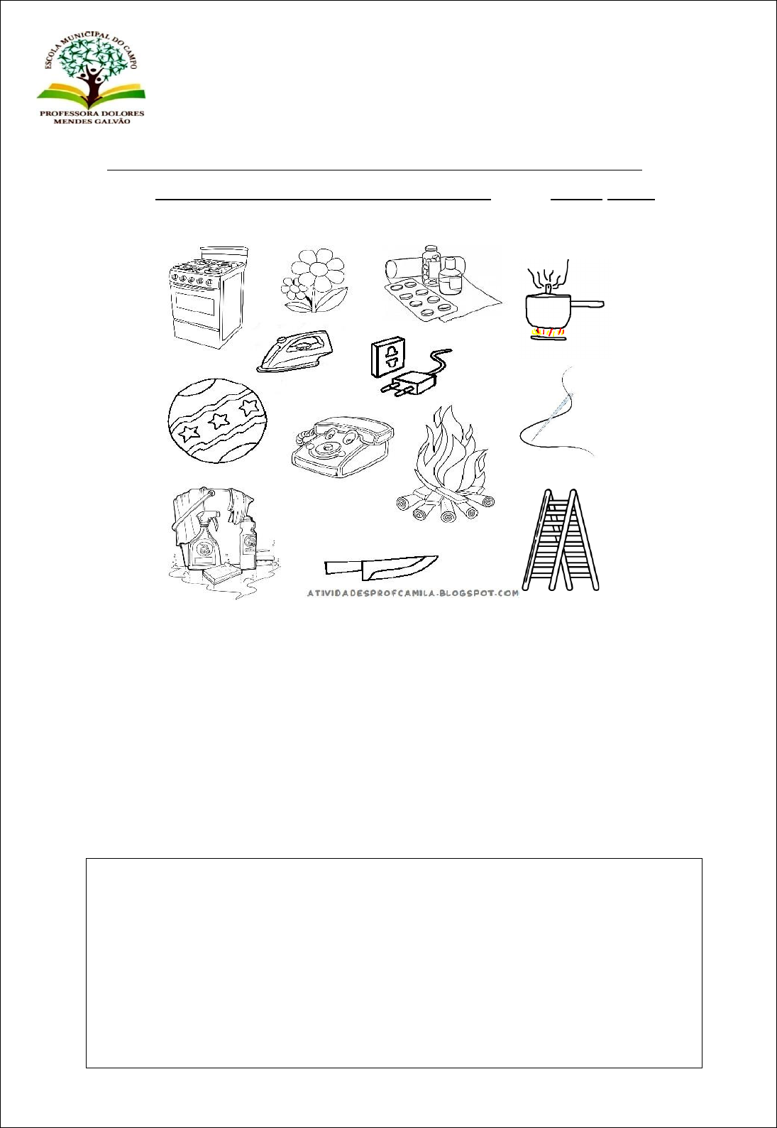 ESCOLA MUNICIPAL DO CAMPO PROFESSORA DOLORES MENDES GALVÃO – EDUCAÇÃO INFANTIL E ENSINO FUNDAMENTAL. 3º TRIMESTRE – 2023 2º AVALIAÇÃO DE CIÊNCIAS – VALOR: 5,0 – NOTA:___ ALUNO (A): __ 2º ano ___ PROFESSOR (A): _DATA: / /________. 1- Circule os objetos que podem causar acidentes. (1,0) https://www.artofit.org/image-gallery/333688653648304688/acidentes-dom%C3%A9sticos/ 2- Sobre os acidentes domésticos marque, a alternativa correta abaixo: (1,0) a) São acidentes que acontecem somente com empregadas domésticas. b) São acidentes que ocorrem no trânsito. c) O acidente doméstico é aquele que ocorre no local onde habitamos ou em seu entorno. d) Acidente doméstico só ocorre fora das residências. 3- Dê exemplo de um acidente doméstico: (0,6) __________________________________________________________________________ 4- Em relação à prevenção de acidentes, encontre as palavras relacionadas: (1,0) K G R T O M A D A P R H R E M É D I O G G S B S V A D M O F O G O I O P L J M F E R R O K G A X L Ç O L G Q U E W O U R A L U Q W D N K G D S U F O C A Ç Ã O J F S C F O N F S D W Q F Q A E T U F V H A F O G A M E N T O H J T M L P F D S Q U E I M A D U R A E Q G S V P M N D C Z A Q B N O U Q U E D A F E Q N M L P Ç A Z V N H G D E Q I P L M Ç G F D S G J K L P Q F O G Ã O M O F T E S O U R A G H J J K P O REMÉDIO-TOMADA-FERRO-FOGO-FOGÃO-QUEDA-QUEIMADURA-AFOGAMENTO-SUFOCAÇÃO-TESOURA https://www.liveworksheets.com/w/pt/ciencias/32579 5- Complete a cruzadinha relacionando o que cada acidente doméstico pode causar:(0,6) https://paolitamimos.blogspot.com/2016/11/atividades-sobre-acidentes-domesticos.html 6- Pinte os sinais de trânsito com as cores corretas e, posteriormente, círcule aquele que é para os pedestres:(0,5) https://br.pinterest.com/pin/459156124511116882/ 7- Pinte o semáforo com as cores que representa cada palavra: (0,3) https://br.pinterest.com/pin/459156124511116882/ https://br.pinterest.com/pin/459156124511116882/