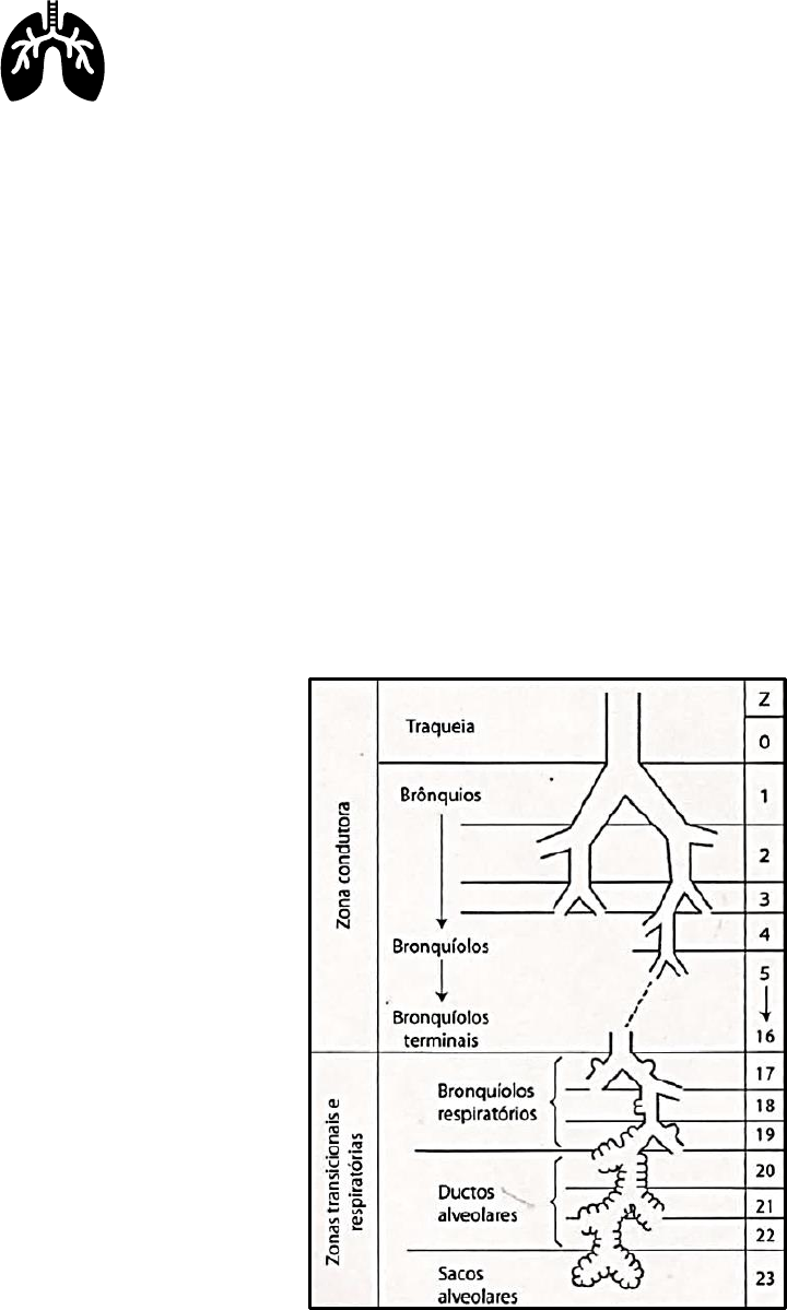 1 Fisiologia do sistema respiratório Bruna Stephanini – 87 Estrutura e função A respiração pode ser definida como sendo os mecanismos necessários para suprir os tecidos com oxigênio e remover o gás carbônico gerado pelo metabolismo. A troca gasosa ocorre na membrana alvéolo-capilar. Essa é atingida, por um lado, pelas vias aéreas (que se dividem em zonas condutoras e respiratórias) e por outro, pelos vasos sanguíneos. As vias aéreas consistem em uma série de tubos que, conforme adentram o parênquima pulmonar, se ramificam, tornam-se estreitos, curtos e numerosos. Assim, a traqueia origina um brônquio principal, que se ramifica em brônquios esquerdo e direito, os quais, por sua vez, dividem-se em brônquios lobares, segmentares e bronquíolos terminais, os quais não possuem alvéolos e são a última porção condutora das vias aéreas, que continua como porções respiratórias. As zonas condutoras têm o papel de levar o ar inspirado até as zonas de trocas gasosas. Elas constituem, assim, o chamado espaço morto anatômico, já que não realizam trocas, e possuem volume aproximado de 150ml. Os bronquíolos terminais, por sua vez, se dividem em bronquíolos respiratórios, que contêm alvéolos, e, em seguida, se dividem em ductos alveolares, que são porções completamente recobertas por alvéolos. As áreas nas quais são encontrados alvéolos são denominadas zonas respiratórias, já que conseguem realizar trocas gasosas. Com a contração do diafragma durante a inspiração, cria-se uma pressão negativa nos pulmões, o que faz com que o ar entre e a cavidade torácica seja expandida. Essa expansão é devido à contração diafragmática e à ação dos músculos intercostais, que elevam as costelas. Desde a traqueia até os bronquíolos terminais, o ar possui grande velocidade, contudo, ao alcançar as zonas 2 respiratórias, a velocidade reduz drasticamente. Isso porque as zonas respiratórias possuem grande área de secção transversal. Nessas zonas, o movimento do ar se dá por difusão. Assim como as vias aéreas, os vasos sanguíneos também se ramificam em porções cada vez menores, até que se atinjam os capilares, que formam uma rede densa nas paredes dos alvéolos, o que permite as trocas gasosas através da membrana alvéolo-capilar. Essa é tão delgada que grandes aumentos na pressão alveolar podem ser prejudiciais. Os alvéolos são formados por uma única camada de células, chamadas pneumócitos, os quais podem ser do tipo I ou II. Além dessas células, há uma camada de água, que gera tensão superficial. Essa tensão superficial faz com que exista uma tendência de colabamento dos alvéolos. A fim de se evitar isso, os pneumócitos do tipo II produzem surfactante, que atua reduzindo essa tensão e aumentando a estabilidade alveolar. As vias aéreas atuam, ainda, removendo partículas do ar inspirado, o que evita que essas cheguem ao pulmão. As partículas maiores são filtradas no nariz, enquanto as menores ficam depositadas nas zonas de condução, que possuem muco. Esquema: Alvéolo sem surfactante Alvéolo com surfactante 3 Ventilação A ventilação diz respeito à forma em que o ar atinge os alvéolos. O volume de ar que entra nos pulmões em cada respiração é chamado de volume de ar corrente (VC) e vale cerca de 500ml. Após uma expiração, sobra certo volume de ar nos pulmões, chamado capacidade residual funcional (CRF). A CRF é um dos fatores responsáveis por manter os alvéolos sempre abertos. Em condições em que se inspira forçadamente e se expira também de forma forçada, o volume expirado é chamado de capacidade vital (CV). Após essa expiração, sobra no pulmão um volume residual (VR). Resumo: ▪ VC – Volume corrente ▪ VER – Volume expiratório residual/de reserva ▪ VR – Volume residual ▪ CRF – Capacidade residual funcional ▪ CV – Capacidade vital ▪ CI – Capacidade inspiratória ▪ CPT - Capacidade pulmonar total ▪ VIR – Volume inspiratório de reserva 4 Existem inúmeras técnicas que possibilitam medir os volumes pulmonares, como a espirometria, diluição de gás hélio e pletismografia de corpo inteiro. O primeiro permite quantificar o volume de ar corrente e a capacidade vital. Os dois últimos possibilitam a identificação da capacidade pulmonar total (CPT), CRF e volume residual (VR). Dos 500ml de ar inspirados, cerca de 150ml não chegam aos alvéolos, permanecendo no espaço morto anatômico (zonas de condução). Assim, os 350ml de ar que chegam aos alvéolos e possibilitam a troca gasosa são referentes à ventilação alveolar que, evidentemente, difere da ventilação pulmonar. A ventilação alveolar pode ser aumentada quando se aumenta o volume de ar corrente e/ou a frequência respiratória. Como ocorrem trocas gasosas apenas com o ar alveolar, é possível estimar a ventilação alveolar a partir do volume de CO2 expirado, já que esse será, inteiramente, proveniente da ventilação alveolar. Além disso, pelo mesmo motivo, a pressão parcial de CO2 arterial e alveolar é praticamente a mesma. Enquanto o espaço morto anatômico corresponde ao ar “parado” nas vias de condução, o espaço morto fisiológico diz respeito ao ar remanescente nos pulmões após a expiração. A ventilação total (pulmonar) corresponde ao volume de ar corrente multiplicado pela frequência respiratória. As diferentes regiões do pulmão – base, região média e ápice – possuem diferentes graus de ventilação e perfusão. A base dos pulmões apresenta maior ventilação por unidade de volume e maior perfusão do que as outras duas regiões. As diferenças na ventilação são decorrentes do efeito gravitacional sobre os pulmões, o que favorece a ventilação na base. O fluxo sanguíneo também é alterado em condições de exercício físico e mudanças de postura. Quando uma pessoa se deita, o fluxo sanguíneo no ápice do pulmão aumenta, embora o fluxo da base sofra p