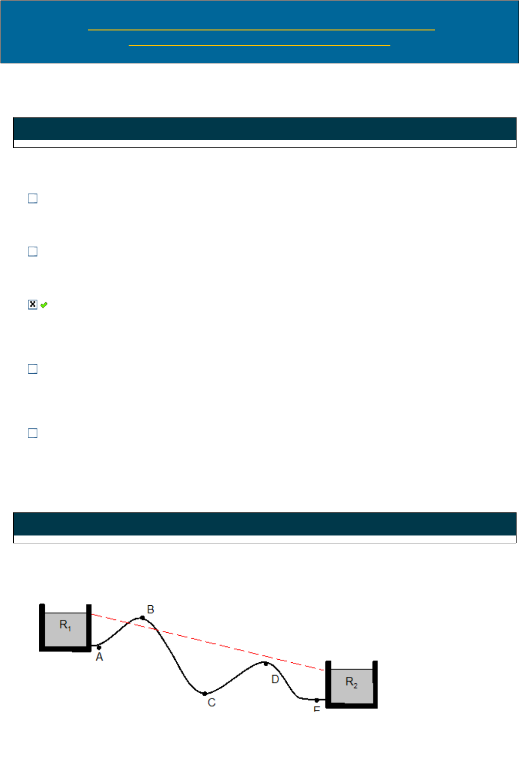 2º AVALIANDO APRENDIZADO – AVA2 (SIMULADO) ESTÁCIO - ENGENHARIA HIDRÁULICA 1a Questão Acerto: 0,2 / 0,2 A respeito dos projetos de canais, pode se dizer: Não é necessário deixar uma folga acima do nível máximo de projeto, a altura máxima de projeto já atende possíveis sobrelevações em curvas e ao fator de segurança. As obras são executadas de montante para jusante, assim, quando chove, um volume maior de água consegue escoar mais rapidamente. Para canais de seção compostas, as equações de resistência não dão bons resultados se aplicados à seção completa − as mesmas devem ser subdividas por linhas imaginárias, e, para cada seção, deve-se utilizar a fórmula de Manning para o cálculo da vazão parcial. A adoção de uma velocidade média máxima compatível com o revestimento pode ser utilizada como critérios de um projeto para que a seção seja estável. Esse critério é chamado de mínima tensão de cisalhamento. Considerações estéticas não são relevantes em projetos de canais. Utilizando as equações corretas e ponderando os coeficientes de segurança, obtém-se um projeto de alto nível. 2a Questão Acerto: 0,2 / 0,2 Para a situação em que L.C.E. entre dois reservatórios é a representada pela linha vermelha tracejada (figura a seguir), qual é o ponto de menor pressão? Ponto C Ponto A Ponto E Ponto D Ponto B 3a Questão Acerto: 0,2 / 0,2 [Itaipu - Técnico em Hidrologia, 2015] Sobre a medição de vazões líquidas em hidrometria, é INCORRETO afirmar: Existem diversos perfis de velocidade, em função das características do escoamento, da geometria e do material do fundo. Em rios de montanha, extremamente turbulentos, o método químico é o mais utilizado para medição de vazões. Os principais métodos de medição de vazão são: medição e integração da distribuição de velocidade; método acústico; método volumétrico; método químico; uso de dispositivos de geometria regular; e medição com flutuadores. Quando há necessidade de medição na superfície, ela deve ser realizada a 10 centímetros de profundidade, para que a hélice do molinete fique submersa. Na medição convencional com molinete hidrométrico, determina-se a velocidade média na vertical, por meio de métodos analíticos com base numa única medição, previamente definida em função do perfil. 4a Questão Acerto: 0,2 / 0,2 [ENADE - ENGENHARIA GRUPO IV, 2011] Em sistemas de escoamento de fluidos (gases ou líquidos), é muito comum ser necessário adicionar-se energia para manter o escoamento. Bombas e compressores são exemplos de equipamentos que fornecem energia aos fluidos. Suponha que, em uma estação de tratamento de efluentes que opera em uma indústria, uma das bombas centrífugas usadas para garantir o escoamento do efluente está apresentando cavitação. O fabricante da bomba forneceu a curva da bomba e o NPSH característico para a operação dessa bomba. Tendo em vista essa situação, analise as afirmações a seguir. I. Se há cavitação, significa que o NPSH do sistema nas condições de operação é superior ao NPSH indicado pelo fabricante. II. Pode-se solucionar o problema de cavitação aumentando-se a rotação da bomba ou a vazão. III. O NPSH pode ser definido como a diferença entre a carga estática na entrada da sucção e a carga correspondente à pressão de vapor do líquido na entrada da bomba. IV. Cavitação é a formação de regiões de baixa pressão, que ocorre quando a pressão fica abaixo da pressão de vapor do líquido e ocorre a vaporização nesses pontos. As bolhas deslocam-se para regiões de maior pressão e colapsam. É correto apenas o que se afirma em: II e IV III e IV II I e III I 5a Questão Acerto: 0,2 / 0,2 As marés são formadas por um forças que perturbam a superfície fluida da Terra. Qual das seguintes opções não é uma delas? Força de atrito com o fundo do mar. Força gravitacional entre a Terra e a Lua. Força gravitacional entre o Sol e a Terra. Combinação das forças gravitacionais do Sol e Lua na Terra. Força centrífuga do sistema Terra-Lua. 6a Questão Acerto: 0,2 / 0,2 De acordo com as frases a seguir, pode-se dizer: I - Em canais de concreto devem ser previstos drenos nas paredes e fundo, para evitar subpressão quando o nível do lençol freático estiver alto, já os taludes de pedras argamassadas e o uso de drenos são dispensáveis, pois a alvenaria de pedra permite certa permeabilidade. II - O aumento da velocidade média e da declividade da linha d¿água podem aumentar a erosão com aumento de transporte de sólidos e prejudicar eventuais sistemas de captação de água a jusante, respectivamente. III - Para que o talude seja geotecnicamente estável, a sua máxima inclinação deve ser menor que o ângulo de repouso do material de revestimento. II e III estão corretas. Todas as afirmativas estão corretas. Todas as afirmativas estão incorretas. I e III estão corretas. I e II estão corretas. 7a Questão Acerto: 0,2 / 0,2 (CEDAE - Engenheiro Civil - 2009) Considere as seguintes atividades, associadas ao projeto e operação de sistemas de abastecimento de água. I. Desenho do traçado de um sistema de distribuição. II. Edição das propriedades dos componentes do sistema. III. Simulações estáticas. IV. Simulações dinâmicas. V. Simulação dos parâmetros de qualidade da água. Dentre as atividades acima, aquelas possíveis de serem executadas com o programa EPANET são: III, IV e V, apenas. I, II e III, apenas. I, II, III, IV e V. II, III, IV e V, apenas. I, II, III e IV, apenas. 8a Questão Acerto: 0,2 / 0,2 Sabendo que um vertedouro tem seção quadrada e que a distância entre o nível de água e o bordo inferior é de 3,0 metros enquanto para o bordo superior é de 1,0 m, qual a área do orifício? 5 m² 2 m² 3 m² 1 m² 4 m² 9a Questão Acerto: 0,2 / 0,2 [Itaipu - Engenheiro pleno, 2008] Quando uma bomba centrífuga não afogada, em um sistema de recalq
