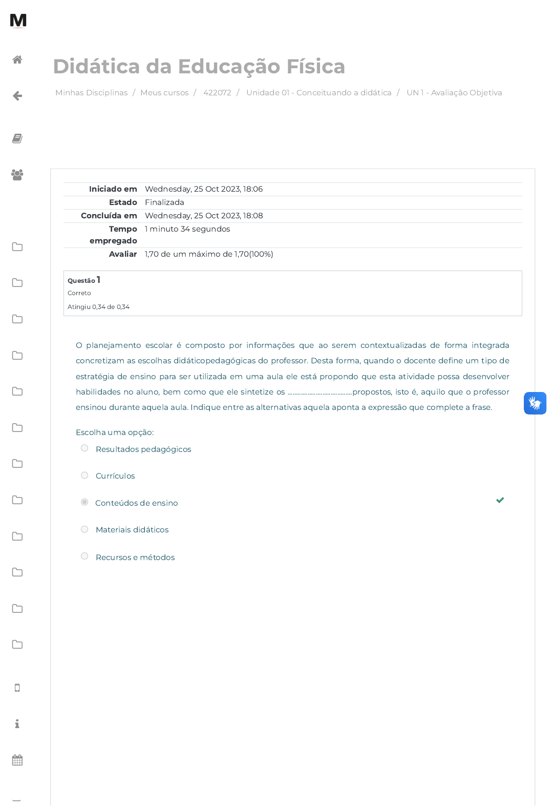 25/10/23, 18:04 UN 1 - Avaliação Objetiva: Revisão da tentativa https://avap.multivix.edu.br/mod/quiz/review.php?attempt=4168987&cmid=1536508 1/3 Minhas Disciplinas / Meus cursos / 422072 / Unidade 01 - Conceituando a didática / UN 1 - Avaliação Objetiva Didática da Educação Física Iniciado em Wednesday, 25 Oct 2023, 18:06 Estado Finalizada Concluída em Wednesday, 25 Oct 2023, 18:08 Tempo empregado 1 minuto 34 segundos Avaliar 1,70 de um máximo de 1,70(100%) Questão 1 Correto Atingiu 0,34 de 0,34 O planejamento escolar é composto por informações que ao serem contextualizadas de forma integrada concretizam as escolhas didáticopedagógicas do professor. Desta forma, quando o docente de�ne um tipo de estratégia de ensino para ser utilizada em uma aula ele está propondo que esta atividade possa desenvolver habilidades no aluno, bem como que ele sintetize os .......................................propostos, isto é, aquilo que o professor ensinou durante aquela aula. Indique entre as alternativas aquela aponta a expressão que complete a frase. Escolha uma opção: Resultados pedagógicos Currículos Conteúdos de ensino Materiais didáticos Recursos e métodos https://avap.multivix.edu.br/my/ https://avap.multivix.edu.br/course/view.php?id=23682 https://avap.multivix.edu.br/course/view.php?id=23682§ion=2 https://avap.multivix.edu.br/mod/quiz/view.php?id=1536508 https://avap.multivix.edu.br/my/ https://avap.multivix.edu.br/course/view.php?id=23682 https://avap.multivix.edu.br/user/index.php?id=23682 https://avap.multivix.edu.br/course/view.php?id=23682§ion=1 https://avap.multivix.edu.br/course/view.php?id=23682§ion=2 https://avap.multivix.edu.br/course/view.php?id=23682§ion=3 https://avap.multivix.edu.br/course/view.php?id=23682§ion=4 https://avap.multivix.edu.br/course/view.php?id=23682§ion=5 https://avap.multivix.edu.br/course/view.php?id=23682§ion=6 https://avap.multivix.edu.br/course/view.php?id=23682§ion=7 https://avap.multivix.edu.br/course/view.php?id=23682§ion=8 https://avap.multivix.edu.br/course/view.php?id=23682§ion=9 https://avap.multivix.edu.br/course/view.php?id=23682§ion=10 https://avap.multivix.edu.br/course/view.php?id=23682§ion=11 https://avap.multivix.edu.br/course/view.php?id=23682§ion=12 https://avap.multivix.edu.br/hooks/portal/ https://avap.multivix.edu.br/mod/page/view.php?id=1252%2F%22%20target%3D%22_blank https://avap.multivix.edu.br/calendar/view.php/ https://avap.multivix.edu.br/local/staticpage/view.php?page=biblioteca https://avap.multivix.edu.br/ https://avap.multivix.edu.br/ https://avap.multivix.edu.br/ https://avap.multivix.edu.br/ 25/10/23, 18:04 UN 1 - Avaliação Objetiva: Revisão da tentativa https://avap.multivix.edu.br/mod/quiz/review.php?attempt=4168987&cmid=1536508 2/3 Questão 2 Correto Atingiu 0,34 de 0,34 Questão 3 Correto Atingiu 0,34 de 0,34 As estratégias de ensino também são pensadas para dar conta dos diferentes tipos de conteúdo de ensino e das habilidades propostas nos objetivos de aprendizagem. Na área da educação física as aulas práticas são potencializadas principalmente no trabalho com o movimento humano. Assim, indique entre as alternativas abaixo aquela de corresponda s características do uso das aulas prática como estratégia de ensino. Escolha uma opção: Os conteúdos de caráter conceitual não podem ser ensinados com estratégias de cunho prático. As aulas práticas são estratégias de ensino utilizadas somente para as aulas de Educação Física. As aulas práticas são utilizadas somente para o ensino dos conteúdos procedimentais. As aulas práticas compreender o saber fazer, e possibilitam a incorporação dos conteúdos de forma signi�cativa. Em aulas práticas o professor deve apontar o que o aluno vai reproduzir para que aprendizagem seja efetiva. Os objetivos de aprendizagem são metas a serem atingidas pelo aluno, isto é, aquilo que o aluno deve conquistar ao �nal do tempo estabelecido pelo planejamento para as aprendizagens, sendo um bimestre, semestre ou ano. O objetivo geral de aprendizagem compreende uma meta mais ampliada que contempla de forma complexa todos os conteúdos de ensino trabalhados. Indique entre as a�rmativas aquela que descreve as características dos objetivos de aprendizagem Escolha uma opção: Responde s ações que o professor deve atingir no decurso do planejamento seja ela micro ou macro. Por serem metas menores tm por foco o trabalho de habilidades e de conteúdos procedimentais. São descritos somente para o planejamentos micro como os planos de aula. São claros e realistas e que ao serem acrescidas uma a outra irão contemplar o somatório de habilidades propostos de forma ampliada para a formação dos alunos. Contextualiza as habilidades propostas e se concretizam em ações desenvolvidas pelo professor. https://avap.multivix.edu.br/my/ https://avap.multivix.edu.br/course/view.php?id=23682 https://avap.multivix.edu.br/user/index.php?id=23682 https://avap.multivix.edu.br/course/view.php?id=23682§ion=1 https://avap.multivix.edu.br/course/view.php?id=23682§ion=2 https://avap.multivix.edu.br/course/view.php?id=23682§ion=3 https://avap.multivix.edu.br/course/view.php?id=23682§ion=4 https://avap.multivix.edu.br/course/view.php?id=23682§ion=5 https://avap.multivix.edu.br/course/view.php?id=23682§ion=6 https://avap.multivix.edu.br/course/view.php?id=23682§ion=7 https://avap.multivix.edu.br/course/view.php?id=23682§ion=8 https://avap.multivix.edu.br/course/view.php?id=23682§ion=9 https://avap.multivix.edu.br/course/view.php?id=23682§ion=10 https://avap.multivix.edu.br/course/view.php?id=23682§ion=11 https://avap.multivix.edu.br/course/view.php?id=23682§ion=12 https://avap.multivix.edu.br/hooks/portal/ https://avap.multivix.edu.br/mod/page/view.php?id=1252%2F%22%20target%3D%22_blank https://avap.multivix.edu.br/calendar/view.php/ https://avap.multivix.edu.br/local/staticpage/view.php?page=biblioteca https://avap.multivix.edu.br/ h