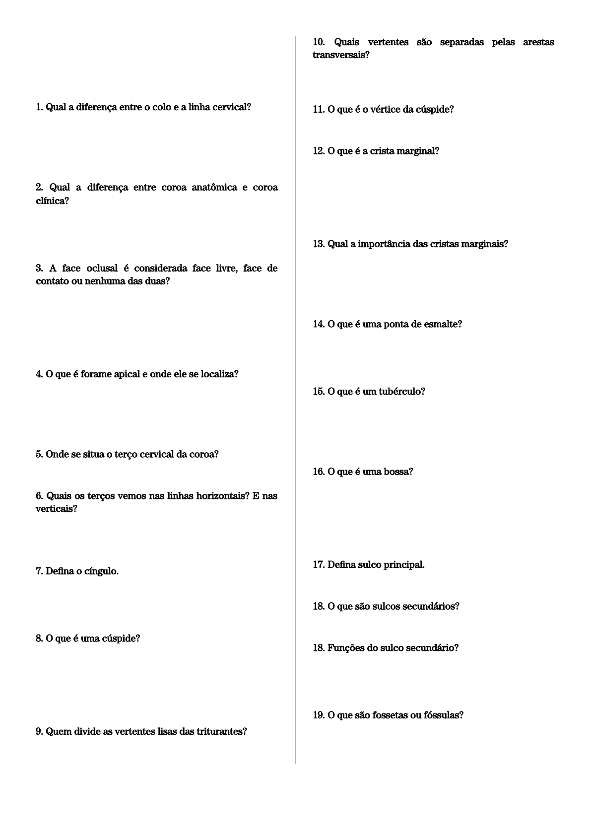 Questões de escultura 1. Qual a diferença entre o colo e a linha cervical? O colo é a porção intermediária que une a coroa e raiz do dente, já a linha cervical é a linha do colo formada pela junção do esmalte com o cemento (junção cemento-esmalte) é uma linha sinuosa bem nítida. 2. Qual a diferença entre coroa anatômica e coroa clínica? A coroa anatômica é a parte do dente revestida por esmalte, e coroa clínica é parte do dente exposta na cavidade bucal. 3. A face oclusal é considerada face livre, face de contato ou nenhuma das duas? Nenhuma das duas. A face oclusal é a superfície da coroa que entra em contato com as homônimas dos dentes antagonistas durante a oclusão. Nos incisivos e caninos as faces V e L se encontram na borda incisal que corresponde a face oclusal dos dentes. 4. O que é forame apical e onde ele se localiza? É uma abertura localizada no ápice radicular do dente que permite a vascularização e inervação da polpa pela passagem de vasos e nervos. Pode haver um ou mais na mesma raiz. 5. Onde se situa o terço cervical da coroa? Próximo ao colo do dente. 6. Quais os terços vemos nas linhas horizontais? E nas verticais? Horizontais – cervical, médio e ocluso/incisal; Verticais – mesial, médio e distal. 7. Defina o cíngulo. Saliência arredondada no terço cervical da face lingual de incisivos e caninos. É a porção mais saliente do lobo lingual. 8. O que é uma cúspide? É um saliência em forma de pirâmide quadrangular, típica de pré-molares e molares, que são divididas em vertentes lisas e triturantes. Nos quais as lisas são voltadas para as faces livres e as triturantes para a face oclusal. 9. Quem divide as vertentes lisas das triturantes? As arestas longitudinais. 10. Quais vertentes são separadas pelas arestas transversais? Vertente lisas e triturantes mesiais das vertentes lisas e triturantes distais. 11. O que é o vértice da cúspide? É o ponto de encontro das vertentes e arestas. 12. O que é a crista marginal? Eminência linear romba situada nas bordas mesial e distal da face lingual de incisivos e caninos (vai do cíngulo aos ângulos incisais) e nas bordas mesial e distal dos pré-molares e molares (estende-se das cúspides vestibulares às linguais). 13. Qual a importância das cristas marginais? Evitar que partículas de alimento que devem ser trituradas escapem da zona mastigatória e também protejam a área de contato, evitando impactação alimentar nela. 14. O que é uma ponta de esmalte? Eminência linear que une cúspides, interrompendo um sulco principal. São encontradas principalmente nos 1° pré-molar inferior e no 1° molar superior. 15. O que é um tubérculo? É uma saliência menor que a cúspide, sem forma definida. Principalmente, o tubérculo de Carabelli no 1° molar superior, o tubérculo molar do primeiro molar inferior decíduo. 16. O que é uma bossa? Uma elevação arredondada situada no terço cervical da face vestibular de todos os dentes permanentes e decíduos, entre os terços cervical e médio da face lingual de pré-molares e molares ou nas faces de contato de alguns dentes. 17. Defina sulco principal. Depressão linear e estreita que divide as cúspides. 18. O que são sulcos secundários? Linhas que dividem as vertentes das cúspides. 18. Funções do sulco secundário? Tornar a superfície mastigatória menos lisa, aumentando a eficiência da trituração, e serve para escoamento dos alimentos triturados. 19. O que são fossetas ou fóssulas? Encontro de dois sulcos, principal e secundário. Autoria: Lorena Souza 1 20. No sentido vertical, para onde convergem as faces livres? E no sentido horizontal? Vertical - para incisal ou oclusal. Horizontal – para a distal. 21. No sentido vertical, para onde convergem as faces de contato? E no sentido vertical? Vertical – cervical; o maior diâmetro mesiodistal está no terço incisal/oclusal e o menor no terço cervical. Horizontal – lingual; 22. Onde situam as áreas de contato? Estão próximas as bordas incisais ou face oclusal, mais deslocadas para o vestibular. 23. As áreas de contato, formam espaços em torno dela. Quais as duas áreas formadas no sentido vertical? Sulco interdental e espaço interdental. 24. Qual a diferença entre sulco interdental e espaço interdental? O sulco interdental é um pequeno espaço localizado no lado oclusal da área de contato, e o espaço interdental é um grande espaço prismático do lado oposto e é ocupado pela papila dental da gengiva. 25. Qual a importância da área de contato? Ele protege a papila interdental contra agressões mecânicas durante a mastigação, assim a ausência de contato deixa a papila desprotegida, podendo causar lesões ao periodonto. 26. Quais as duas áreas formadas no sentido horizontal? Ameia vestibular e ameia lingual. 27. O que é ameia lingual e ameia vestibular? Espaços em forma de V aberto para lingual, ameia lingual, e aberto para vestibular, ameia vestibular. A ameia lingual é maior que a ameia vestibular. 28. Quais os dentes que as faces de contato não convergem para a lingual em sentido horizontal? 1° molar superior, 2° molar superior decíduo e 2° pré-molar inferior. 29. O que é a linha equatorial? É a maior circunferência do dente, que passa pelos pontos mais proeminentes das faces livres e das faces de contato. 30. Qual a diferença entre vertente e aresta de uma cúspide? A vertente é o lado ou plano inclinado da cúspide, já a aresta é a margem que separa as vertentes das cúspides. 31. A face vestibular é sempre maior que a face lingual, qual a exceção? O primeiro molar superior, onde a face lingual é maior que a vestibular. 32. A fase mesial geralmente é maior e mais reta que a distal, com exceção de quais dentes? Incisivo central inferior, que possui coroa simétrica e no primeiro pré-molar inferior, onde a fase mesial é ligeiramente menos alta que a distal. 33. A fase mesial, geralmente, é plana e reta e a face dis