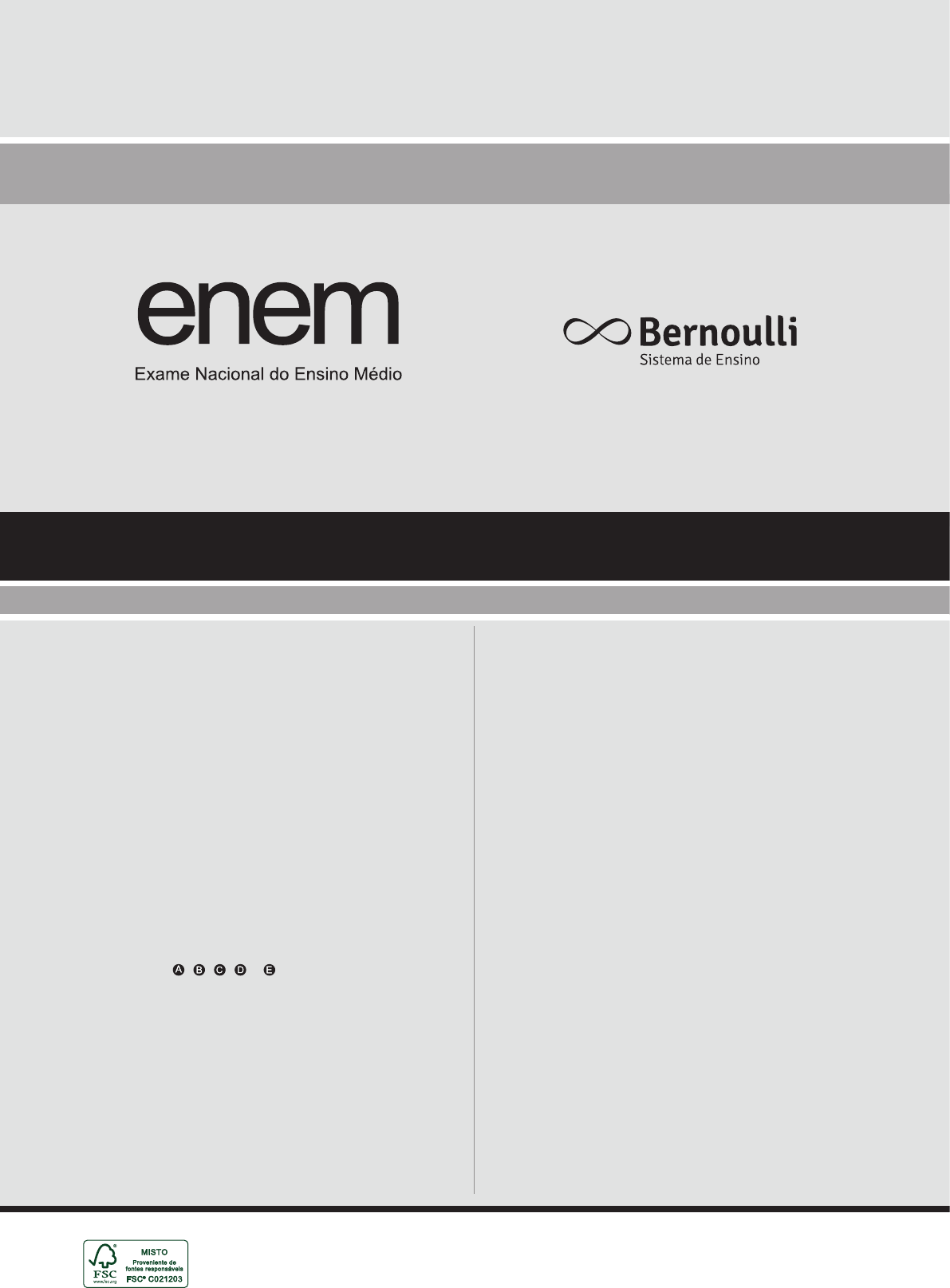 PROVA DE CIÊNCIAS DA NATUREZA E SUAS TECNOLOGIAS PROVA DE MATEMÁTICA E SUAS TECNOLOGIAS 1 Este CADERNO DE QUESTÕES contém 90 questões numeradas de 91 a 180, dispostas da seguinte maneira: a. as questões de número 91 a 135 são relativas à área de Ciências da Natureza e suas Tecnologias; b. as questões de número 136 a 180 são relativas à área de Matemática e suas Tecnologias. 2 Confira se o seu CADERNO DE QUESTÕES contém a quantidade de questões e se essas questões estão na ordem mencionada na instrução anterior. Caso o caderno esteja incompleto, tenha qualquer defeito ou apresente divergência, comunique ao aplicador da sala para que ele tome as providências cabíveis. 3 Escreva e assine seu nome nos espaços próprios do CARTÃO-RESPOSTA com caneta esferográfica de tinta preta. 4 Não dobre, não amasse nem rasure o CARTÃO-RESPOSTA, pois ele não poderá ser substituído. 5 Para cada uma das questões objetivas, são apresentadas 5 opções identificadas com as letras , , , e . Apenas uma responde corretamente à questão. 6 Use o código presente nesta capa para preencher o campo correspondente no CARTÃO-RESPOSTA. 7 Com seu RA (Registro Acadêmico), preencha o campo correspondente ao código do aluno. Se o seu RA não apresentar 7 dígitos, preencha os primeiros espaços e deixe os demais em branco. 8 No CARTÃO-RESPOSTA, preencha todo o espaço destinado à opção escolhida para a resposta. A marcação em mais de uma opção anula a questão, mesmo que uma das respostas esteja correta. 9 O tempo disponível para estas provas é de cinco horas. 10 Reserve os 30 minutos finais para marcar seu CARTÃO-RESPOSTA. Os rascunhos e as marcações assinaladas no CADERNO DE QUESTÕES não serão considerados na avaliação. 11 Quando terminar as provas, acene para chamar o aplicador e entregue este CADERNO DE QUESTÕES e o CARTÃO-RESPOSTA. 12 Você poderá deixar o local de prova somente após decorridas duas horas do início da aplicação e poderá levar seu CADERNO DE QUESTÕES ao deixar em definitivo a sala de provas nos últimos 30 minutos que antecedem o término das provas. 13 Você será excluído do Exame, a qualquer tempo, no caso de: a. prestar, em qualquer documento, declaração falsa ou inexata; b. agir com incorreção ou descortesia para com qualquer participante ou pessoa envolvida no processo de aplicação das provas; c. perturbar, de qualquer modo, a ordem no local de aplicação das provas, incorrendo em comportamento indevido durante a realização do Exame; d. se comunicar, durante as provas, com outro participante verbalmente, por escrito ou por qualquer outra forma; e. portar qualquer tipo de equipamento eletrônico e de comunicação durante a realização do Exame; f. utilizar ou tentar utilizar meio fraudulento, em benefício próprio ou de terceiros, em qualquer etapa do Exame; g. utilizar livros, notas ou impressos durante a realização do Exame; h. se ausentar da sala de provas levando consigo o CADERNO DE QUESTÕES antes do prazo estabelecido e / ou o CARTÃO-RESPOSTA a qualquer tempo. LEIA ATENTAMENTE AS INSTRUÇÕES SEGUINTES *de acordo com o horário de Brasília 2023 ESTA PROVA SOMENTE PODERÁ SER APLICADA A PARTIR DO DIA 19/08/2023, ÀS 13H00*. Código da Prova: 85 Simulado 5 – Prova II EXAME NACIONAL DO ENSINO MÉDIO CIÊNCIAS DA NATUREZA E SUAS TECNOLOGIAS Questões de 91 a 135 QUESTÃO 91 O principal papel dos rins é filtrar o sangue. Tudo o que for tóxico, inútil ou que esteja em excesso na corrente sanguínea costuma ser eliminado na urina. As proteínas são substâncias essenciais para o nosso organismo e, portanto, não se encaixam neste grupo, não devendo ser encontradas em quantidade relevante na urina de pessoas saudáveis. Disponível em: <www.mdsaude.com>. Acesso em: 8 maio 2023. Pessoas com quantidade relevante desse nutriente na urina podem apresentar: A. Diabetes, pelo metabolismo incompleto da glicose. B. Fadiga, pela deficiência na formação da musculatura. C. Baixa imunidade, pela diminuição das taxas de hemoglobina. D. Enfraquecimento de unhas, pela redução da produção de anticorpos. E. Hemorragia, pela baixa produção de queratina para coagulação sanguínea. QUESTÃO 92 Uma residência possui um ventilador conectado à rede elétrica de 127 V. O equipamento pode ser ajustado em até três níveis de velocidades de rotação por vez: mínima, média e máxima. Para alterar a velocidade que suas pás rotacionam, basta conectar o contato L nos pontos A, B ou C do potenciômetro, como exibido na figura. O ventilador possui resistência interna de 100 Ω. L B 127 V 100 Ω 200 Ω A C Em qual ponto do potenciômetro deve-se ligar a chave L para que as pás do ventilador rotacionem com velocidade mínima e qual será o valor aproximado da intensidade da corrente elétrica estabelecida no circuito? A. A; 1,3 A. B. A; 0,8 A. C. B; 0,6 A. D. C; 0,4 A. E. C; 0,3 A. QUESTÃO 93 Os nanotubos de carbono são constituídos de um enorme arranjo de átomos desse elemento químico que forma uma espécie de cilindro vazio. Um dos tipos de nanotubos de carbono é o de parede dupla, representado a seguir: Esses materiais apresentam excelentes propriedades mecânicas para tração e ainda melhores para a compressão, além de serem resistentes a altas temperaturas e serem bons condutores de eletricidade. Disponível em: <https://periodicos.set.edu.br>. Acesso em: 16 maio 2023 (Adaptação). A ligação química realizada entre os átomos constituintes desse material é denominada A. iônica. B. metálica. C. covalente. D. íon-dipolo. E. dipolo permanente. QUESTÃO 94 O registro de três surtos de meningite meningocócica tipo C em 2022 na capital paulista e o crescimento recente de casos e óbitos pela doença em outras localidades do país acendem um alerta sobre a necessidade de redobrar os esforços de prevenção. A queda da cobertura vacinal contra a doença nos últimos anos foi drástica: a aplicação da 