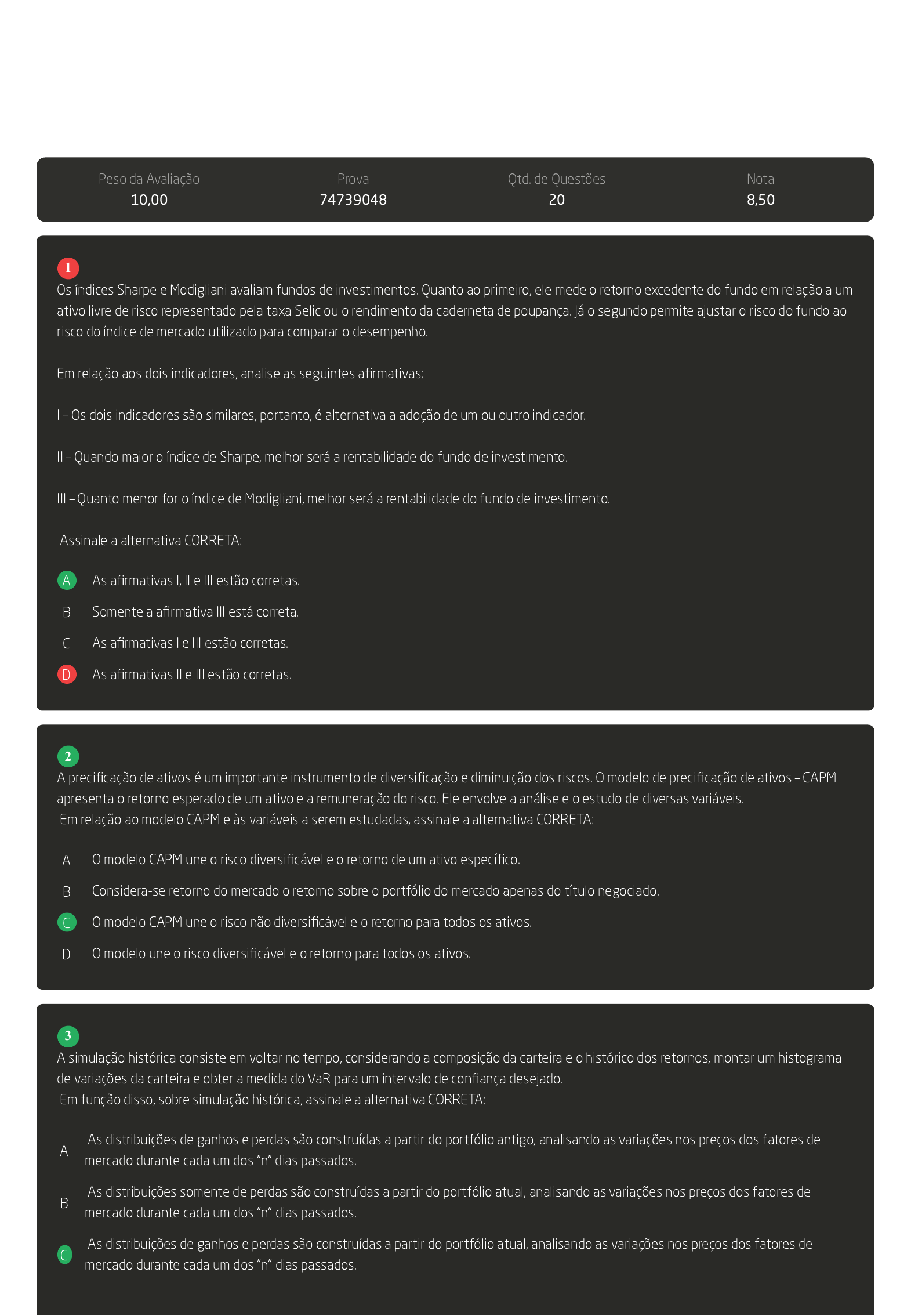 Peso da Avaliação 10,00 Prova 74739048 Qtd. de Questões 20 Nota 8,50 Os índices Sharpe e Modigliani avaliam fundos de investimentos. Quanto ao primeiro, ele mede o retorno excedente do fundo em relação a um ativo livre de risco representado pela taxa Selic ou o rendimento da caderneta de poupança. Já o segundo permite ajustar o risco do fundo ao risco do índice de mercado utilizado para comparar o desempenho. Em relação aos dois indicadores, analise as seguintes afirmativas: I – Os dois indicadores são similares, portanto, é alternativa a adoção de um ou outro indicador. II – Quando maior o índice de Sharpe, melhor será a rentabilidade do fundo de investimento. III – Quanto menor for o índice de Modigliani, melhor será a rentabilidade do fundo de investimento. Assinale a alternativa CORRETA: A As afirmativas I, II e III estão corretas. B Somente a afirmativa III está correta. C As afirmativas I e III estão corretas. D As afirmativas II e III estão corretas. A precificação de ativos é um importante instrumento de diversificação e diminuição dos riscos. O modelo de precificação de ativos – CAPM apresenta o retorno esperado de um ativo e a remuneração do risco. Ele envolve a análise e o estudo de diversas variáveis. Em relação ao modelo CAPM e às variáveis a serem estudadas, assinale a alternativa CORRETA: A O modelo CAPM une o risco diversificável e o retorno de um ativo específico. B Considera-se retorno do mercado o retorno sobre o portfólio do mercado apenas do título negociado. C O modelo CAPM une o risco não diversificável e o retorno para todos os ativos. D O modelo une o risco diversificável e o retorno para todos os ativos. A simulação histórica consiste em voltar no tempo, considerando a composição da carteira e o histórico dos retornos, montar um histograma de variações da carteira e obter a medida do VaR para um intervalo de confiança desejado. Em função disso, sobre simulação histórica, assinale a alternativa CORRETA: A As distribuições de ganhos e perdas são construídas a partir do portfólio antigo, analisando as variações nos preços dos fatores de mercado durante cada um dos “n” dias passados. B As distribuições somente de perdas são construídas a partir do portfólio atual, analisando as variações nos preços dos fatores de mercado durante cada um dos “n” dias passados. C As distribuições de ganhos e perdas são construídas a partir do portfólio atual, analisando as variações nos preços dos fatores de mercado durante cada um dos “n” dias passados. 1 2 3 D As distribuições de ganhos e perdas são construídas a partir do portfólio atual, analisando as variações nos preços dos fatores de mercado durante cada um dos “n” anos passados. Alocação de ativos é uma estratégia de investimentos que busca melhorar a relação entre risco X retorno por meio do tamanho da posição, ou seja, o quanto o investidor investe em cada ativo de acordo com a sua tolerância ao risco, metas e horizonte de tempo. Sobre a alocação de ativos, assinale a alternativa CORRETA: A Alocação de ativos é uma estratégia praticada por diversos fundos de investimentos, porém sem sucesso. B Alocação de ativos é uma estratégia praticada por diversos fundos de investimentos de sucesso. C Alocação de ativos é uma estratégia praticada por diversos traders de sucesso. D Alocação de ativos é uma estratégia não praticada por diversos fundos de investimentos de sucesso. Segundo Fortuna (2008), a Taxa de Longo Prazo (TLP) é uma nova taxa de juros básica que foi criada pelo Governo em janeiro de 2018. Sua finalidade principal é adequar os juros do crédito do BNDES aos juros normais, que são os comumente praticados no mercado. O prazo de vigência da TLP é de três meses, divulgado pelo Banco Central como taxa nominal anual no primeiro dia útil do período de aplicação. Fonte: FORTUNA, Eduardo. Mercado financeiro: produtos e serviços.17ª edição. Rio de Janeiro (RJ): Qualitymark, 2008. Sobre como é denominado o poder com base no exercício da liderança em relação a quem é liderado, assinale a alternativa CORRETA: A A divulgação do valor ocorre via resolução do BC até o último dia de cada bimestre civil, valendo a partir do primeiro dia do próximo. B A divulgação do valor ocorre via resolução do BC até o penúltimo dia de cada trimestre civil, valendo a partir do primeiro dia do próximo. C A divulgação do valor ocorre via resolução do BC até o último dia de cada semestre civil, valendo a partir do primeiro dia do próximo. D A divulgação do valor ocorre via resolução do BC até o último dia de cada trimestre civil, valendo a partir do primeiro dia do próximo. O mercado financeiro é um mercado de risco. Por outro lado, proporciona chances de grandes ganhos. Esse mercado oferece diversas possibilidades de negócios, sendo uma delas os instrumentos derivativos. Sobre as possibilidades de negócios, classifique V para as sentenças verdadeiras e F para as falsas: ( ) Possibilitam a realização de negócios de maior porte, com investimentos relativamente menores e nível conhecido de risco. ( ) Os derivativos incorrem em altos riscos, por isso seus preços são mais elevados. ( ) Os ativos negociados no mercado de derivativos possuem preços estabelecidos por seus vendedores. ( ) As negociações com derivativos ocorrem no mercado à vista da B3. Assinale a alternativa que apresenta a sequência CORRETA: A V – F – V – V. B V – V – F – F. C V – F – F – F. D V – F – V – F. Segundo Fortuna (2008), os títulos de capitalização são investimentos com características de um jogo, gerando renda no final do período e possibilitando ao investidor participar de sorteios, podendo ser mensais, semestrais etc. Foram criados pelo Decreto-lei 261 de 28/02/1967 e só podem ser negociados por Sociedades de Capitalização (SC). Fonte: FORTUNA