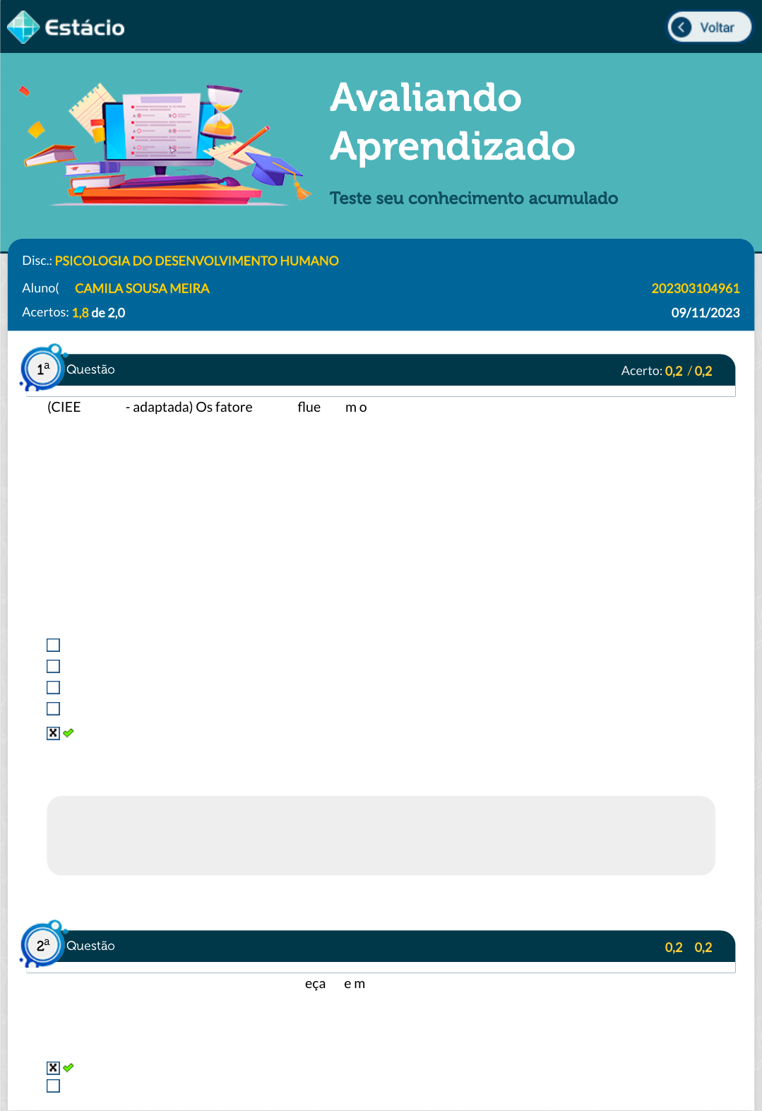 09/11/2023, 16:13 Estácio: Alunos https://simulado.estacio.br/alunos/ 1/7 Avaliando Aprendizado Teste seu conhecimento acumulado Disc.: PSICOLOGIA DO DESENVOLVIMENTO HUMANO Aluno(a): CAMILA SOUSA MEIRA 202303104961 Acertos: 1,8 de 2,0 09/11/2023 Acerto: 0,2 / 0,2 (CIEE - 2017 - adaptada) Os fatores que in�uenciam o desenvolvimento humano são os temas a hereditariedade, crescimento orgânico e o meio. Sobre esse tema, analise as a�rmativas abaixo. I. Hereditariedade: a carga genética estabelece o potencial do indivíduo, que pode ou não se desenvolver. A inteligência pode desenvolver-se de acordo com as condições do meio em que se encontra. II. Crescimento orgânico: refere-se ao desenvolvimento físico e neuro�siológico. III. Meio: o conjunto de in�uência e estimulações ambientais que pode alterar os padrões de comportamento do indivíduo. Marque a alternativa que apresenta a(s) a�rmativa(s) correta(s). I I e II II e III I e III I, II, III Respondido em 09/11/2023 16:00:44 Explicação: A resposta correta é I, II, III. Hereditariedade se refere a aquilo que foi herdado do casal parental. O meio pode alterar o comportamento. E o crescimento orgânico se refere ao desenvolvimento físico e neuro�siológico. Acerto: 0,2 / 0,2 Ao �nal do período gestacional, o bebê começa a se movimentar dentro do útero com a �nalidade de se colocar na posição adequada que permitirá o parto. Marque a alternativa que descreve esse posicionamento. Nádegas voltadas para parte de cima do útero e cabeça encaixada próxima ao canal vaginal da mulher. Cabeça encaixada no canal vaginal e barriga próxima a parte interna da placenta. Questão1 a Questão2 a https://simulado.estacio.br/alunos/inicio.asp https://simulado.estacio.br/alunos/inicio.asp javascript:voltar(); javascript:voltar(); 09/11/2023, 16:13 Estácio: Alunos https://simulado.estacio.br/alunos/ 2/7 Barriga voltada para a parte de dentro do útero e mãos e pés unidos. Mãos e pés unidos e cabeça próxima ao canal vaginal. Nádegas posicionadas próximo ao canal vaginal e cabeça localizada na parte interna do útero. Respondido em 09/11/2023 16:01:41 Explicação: Para o parto o bebê precisa estar encaixado, em uma posição em que suas nádegas se voltam para parte de cima do útero e sua cabeça �ca bem próxima do canal vaginal. Dessa maneira, no parto normal é esperado que a primeira parte do corpo a ser visualizada é a cabeça. Acerto: 0,2 / 0,2 Sobre o desenvolvimento cognitivo na infância, a aquisição da linguagem é um processo gradual e contínuo que liga a primeira e a segunda infância. Sobre o ato de falar e adquirir linguagem, analise as a�rmativas abaixo. A fala inicial começa entre 1 ano e 1 ano e meio, variando nas crianças. A comunicação aos poucos vai ganhando um potencial de personalidade própria, qualquer que seja o idioma que a criança esteja falando. I. Crianças simpli�cam e se utilizam de falas muito curtas para poder se comunicar e dizer apenas o su�ciente e para enviar sua mensagem. II. As crianças pequenas compreendem relações gramaticais complexas e conseguem expressar e sequenciar palavras su�cientes para expressar a ação completa. III. Aos dois anos de idade as crianças são capazes de produzir mais de 500 palavras, e aos dois anos e seis meses, mais de 1000 palavras. Marque a alternativa que apresenta a as a�rmativas corretas. Apenas II e IV estão corretas Apenas I e III estão corretas Apenas I e II estão corretas Apenas I e IV estão corretas Apenas I, II e III estão corretas Respondido em 09/11/2023 16:02:43 Explicação: As crianças podem generalizar muito os signi�cados das palavras. Assim, um bebê já crescido com um ano e meio pode chamar um homem grisalho na televisão de ''Vovô!''. E assim, à medida que as crianças se comunicando com mais palavras e ampliando o vocabulário, elas passam a se relacionar mais com os adultos e sinais de adequação do que falam, farão menos generalizações desse tipo. As crianças regularizam as regras em demasia: elas as aplicam rigidamente, sem saber que algumas regras possuem exceções. No aprendizado da linguagem, depois que aprendem as regras para plurais e conjugação elas as aplicam universalmente. O passo seguinte será aprender as exceções das regras Acerto: 0,2 / 0,2 De acordo com Griffa e Moreno (2001), a escolha de uma carreira ou pro�ssão é muito importante, chegando a ser vital para o adolescente. Sobre esse tema da questão vocacional, analise as asserções abaixo. Questão3 a Questão4 a 09/11/2023, 16:13 Estácio: Alunos https://simulado.estacio.br/alunos/ 3/7 GRIFFA, M. C., MORENO, J. E. Chaves para a psicologia do desenvolvimento - Tomo 2: Adolescência - Vida adulta - Velhice. Edição padrão, 2001. I. Esse momento de escolha é uma etapa que exige o conhecimento das próprias atitudes, dos seus interesses e dos seus valores, além do autoconhecimento das características da sua personalidade, suas possibilidades e seu limites. PORQUE II. A in�uência de pais amigos é positiva quando orientam e oferecem modelos pro�ssionais ou ocupacionais sem exercer pressões. A respeito dessas asserções, assinale a alternativa que apresenta a relação correta entre elas. as asserções I e II são proposições falsas as asserções I e II são proposições verdadeiras, e a II é uma justi�cativa da I. a asserção I é uma proposição falsa, e a II é uma proposição verdadeira. a asserção I é uma proposição verdadeira, e a II é uma proposição falsa. as asserções I e II são proposições verdadeiras, mas a II não é uma justi�cativa da I. Respondido em 09/11/2023 16:04:52 Explicação: Gabarito: as asserções I e II são proposições verdadeiras, mas a II não é uma justi�cativa da I. Justi�cativa: As duas frases são verdadeiras. A escola é a "experiência organizadora central" na vida acadêmica e social da maioria dos adolescentes. Ela oferece op