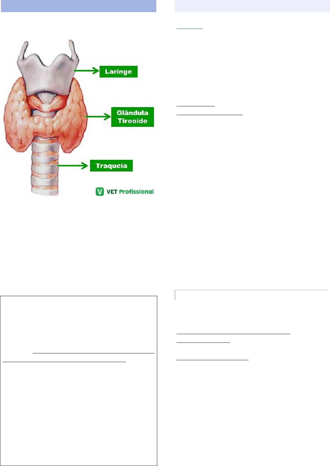 tireóide → Hipotireoidismo; → Hipertireoidismo; Eixo hipotálamo-hipófise-tireóide: O hipotálamo vai liberar TRH (hormônio liberador de tiroxina), que estimula a hipófise anterior a liberar (TSH) e estimula a tireoide a liberar e produzir T3 e T4. Conforme os valores de T3 e T4 vão subindo na corrente sanguínea, ocorre o feedback negativo na hipófise e hipotálamo. Efeitos metabólicos dos hormônios tireoidianos: Hormônios da tireoide: atuam no metabolismo energético das células, fazendo um aumento da utilização da glicose pelos tecidos promovem: Catabolismo lipídico, proteico e de carboidratos, fazendo a liberação de glicose Para conseguir entregar a glicose e o oxigênio para todas as células aumenta a frequencia respiratória, o débito cardíaco e a força do bombeamento sanguíneo energia (ATP e calor – termogênese) aumento da temperatura, aumento da eritropoese aumento do crescimento. - Catabolismo lipídico; - Anabolismo Proteico X Catabolismo Muscular; - Síntese Vitaminais e Minerais; - Termogênese; - Crescimento (Formação e Reabsorção Óssea); - Síntese e degradação de outros hormônios; - Eritropoiese; - Efeitos cronotrópicos e inotrópicos do coração; - Centro da respiração; hipotireoidismo Definição: → Deficiência nos hormônios da tireoide; → Diminuição do metabolismo: aumento de peso, diminuição da FR, apatia, sente mais frio, diminui crescimento; → Hipercolesterolemia: catabolismo lipídico fica prejudicado; HIPOTIREOIDISMO PRIMÁRIO: - Mais comum; - Doença está na tireoide; - Deficiência de T4 pois a tireoide não consegue produzir; HIPOTIREOIDISMO SECUNDÁRIO: - Doença na hipófise; - Deficiência de T4 pois a hipófise não produz TSH suficiente; HIPOTIREOIDISMO TERCIÁRIO: - Doença do hipotálamo; - Deficiência de T4 pois hipotálamo não produz TRH suficiente; - Apenas em humanos, não confirmado em animais. EPIDEMIOLOGIA: → 0,2% dos cães: · Veterinários não costumam dosar hormônios; · Doença rara em gatos. → Adultos; → Raças: Doberman, labrador, Spitz, Cocker; → Animais castrados. etiologia HIPOTIREOIDISMO PRIMÁRIO: → Hipotireoidismo primário é o mais comum; → Tireoidite linfocítica ou atrofia idiopática; → IMUNOMEDIADA. Tireoidite linfocítica (>50%): → Inflamação da tireoide por infiltrados de linfócitos: destroem a glândula por meio da produção de anticorpos > doença autoimune > parte da glândula que morre é substituída por fibrose; - Genética, hereditária, com predisposição racial; - Comum em Pointer, Setter, Maltês, Boxer; Atrofia idiopática: - Folículos degeneram e são substituídos por gordura; - Sem causa definida; Causas menos comuns: - Neoplasia bilateral (carcinoma); - Hipotireoidismo congênito; - Hipotireoidismo iatrogênico → consequência do tratamento do hipertireoidismo; → Tireoidectomia; → Iodo radioativo; → Fármacos: Furosemida, carprofeno, fenobarbital, metimazol, glicocorticoides, bactrin (sulfas). Fármacos que interferem nos hormônios da tireoide: - Não levam ao hipotireoidismo em si, mas confunde na dosagem hormonal → não cancelam o efeito da levotiroxina. - Perguntar ao tutor se o animal toma algum medicamento para ter discernimento na hora de dosar hormônio. HIPOTIREOIDISMO SECUNDÁRIO (HIPOFISÁRIO): - Rara: <5% dos casos; - Falha hipofisária: → Neoplasia, fármacos, cistos, radioterapia; → Alterações congênitas na hipófise (hipoplasia > nanismo); → Não estimula a tireoide > atrofia. Sinais clínicos: Dermatológicos (85%): - Hipotricose/Alopecia bilateral simétrica; - Cauda de rato; - Repilação lenta; - Pelame seco e sem brilho; - Hiperqueratose; - Hiperpigmentação; - Dermatite grave/crônica/recorrente, a pele estimula melanócitos para se defender, engrossando a pele > estimula melanina > hiperpigmentação. - Piodermites recorrentes - Malassezia ou Staphylococcus; - Seborreia e dermatite; - Otite recorrente; - Mixedema - No hipotireoidismo, a degradação de ácido hialurônico é mais lenta, tende a se depositar e levar a água junto – edema em pele da face e pálpebras, por isso a face trágica. - Pálpebra, testa, lábio. - Face trágica. Sinais Metabólicos: - Letargia; - Intolerância ao frio; - Termofilia; - Obesidade (40%). Sinais neuromusculares: - Acúmulo de Ac. Hialurônico e água – MIXEDEMA. - Depressão mental/coma; - Fraqueza; - Ataxia; - Crises epilépticas; - Andar em círculo; - Síndrome vestibular; - Paralisia nervo facial; - Atrofia muscular; - Paralisia de laringe; - Megaesôfago; Sinais reprodutivos: - Infertilidade; - Atrofia testicular; - Anestro prolongado; - Sangramento prolongado; - Sem cio; - Ginecomastia; - Galactorreia Inapropriada; - Sem cio; - Baixa libido; - Cio silencioso. Sinais oculares: - Depósito Lipídico Corneal; - Ulceração corneal; - Uveíte; - Lipemia retinal. Outros sinais: - Cardiovasculares: - Pulso fraco; - Bradicardia; - Arritmias cardíacas; - Gastrointestinal: - Megaesôfago; - Diarreia crônica; - Constipação. CRETINISMO: - Nanismo desproporcional; - Crânio curto e largo; - Mandíbula encurtada; - Crânio aumentado; - Membros encurtados; - Sifose; - Déficit mental; ➜ NANISMO HIPOFISÁRIO: Proporcional – alteração da hipófise – diminuição da secreção do GH (hormônio do crescimento). ➜ NANISMO/CRETINISMO DESPROPORCIONAL: Hipotireoidismo na fase de crescimento causa retardo no desenvolvimento mental e crescimento de ossos longos (acondroplastia) – membros curtos porém tronco e cabeça são normais. SINAIS CLÍNICOS MAIS COMUNS: Alopecia bilateral simétrica, seborréia, piodermite, mixedema, cauda de rato, cão preguiçoso, obesidade, intolerância ao frio, degeneração da córnea, anestro persistente, cio silencioso, fraqueza/ataxia. DIAGNÓSTICO: Exames de rotina: Dosagens hormonais: - Triagem - Dificil! HEMOGRAMA: - Anemia Normocítica Normocrômica Arregenerativa Discreta a Moderada (30%). BIOQUÍMICO: - Hipercolestero