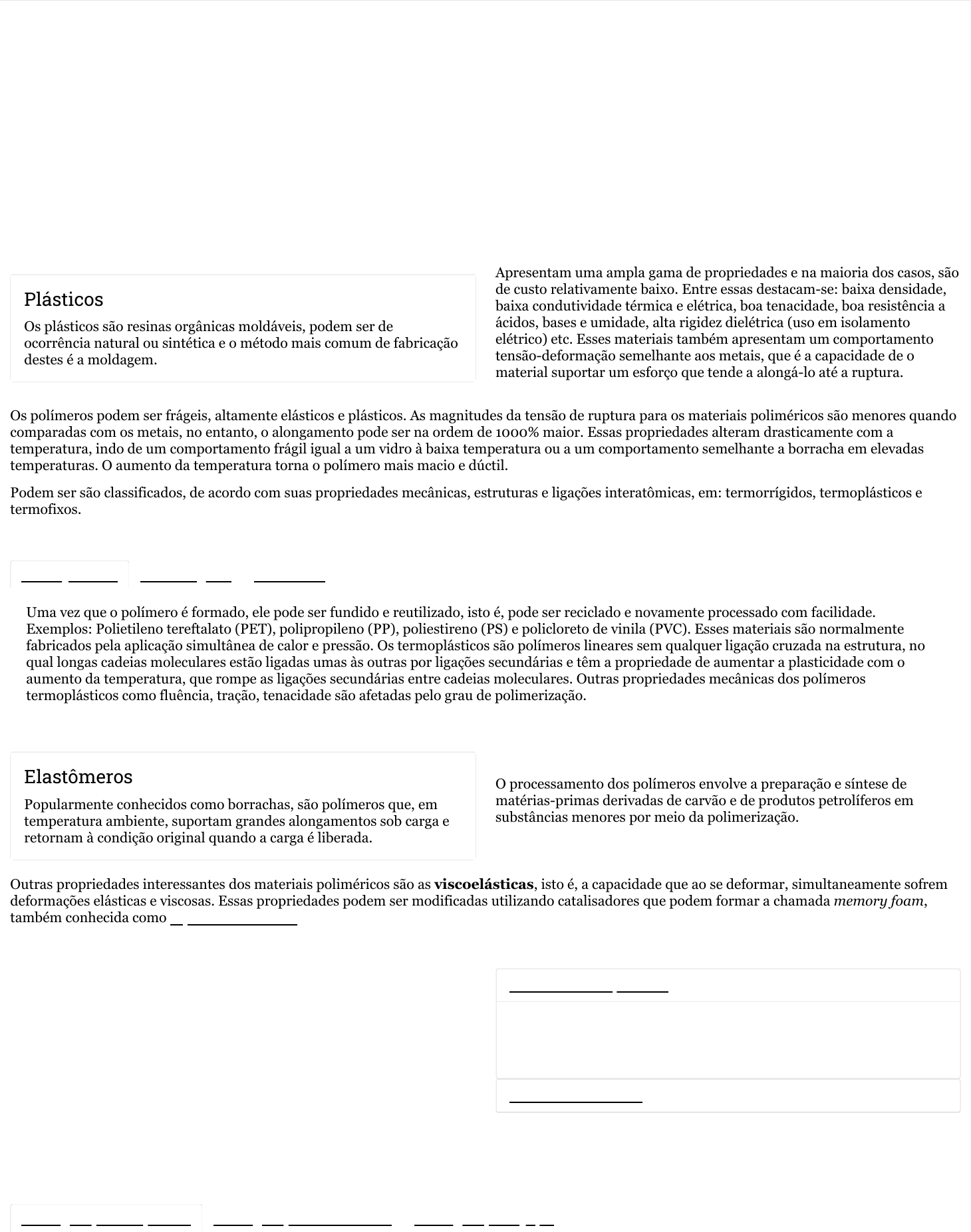 29/10/2023, 17:11 qui_cie_mat_u4_s3_wa https://www.colaboraread.com.br/integracaoAlgetec/index?usuarioEmail=romulob.aguilar%40gmail.com&usuarioNome=RÔMULO+BERNARDINO+DE+AGUILAR&disciplinaDescricao=&atividadeId=3662538&ativida… 1/2 Você sabia que seu material didático é interativo e multimídia? Ele possibilita diversas formas de interação com o conteúdo, a qualquer hora e de qualquer lugar. Mas na versão impressa, alguns conteúdos interativos são perdidos, por isso, fique atento! Sempre que possível, opte pela versão digital. Bons estudos! Materiais poliméricos Podem ser definidos como materiais que possuem várias partes quimicamente ligadas. Os polímeros são compostos orgânicos de elevada massa molecular formados por unidades que se repetem, denominadas monômeros, formando cadeias de longa extensão (CANEVAROLO, 2006). Os materiais poliméricos podem ser de ocorrência natural, como as proteínas, a celulose e a borracha, ou sintética, como o polietileno (PE). Industrialmente, os polímeros são classificados em duas classes principais: plásticos e elastômeros. Plásticos Os plásticos são resinas orgânicas moldáveis, podem ser de ocorrência natural ou sintética e o método mais comum de fabricação destes é a moldagem. Apresentam uma ampla gama de propriedades e na maioria dos casos, são de custo relativamente baixo. Entre essas destacam-se: baixa densidade, baixa condutividade térmica e elétrica, boa tenacidade, boa resistência a ácidos, bases e umidade, alta rigidez dielétrica (uso em isolamento elétrico) etc. Esses materiais também apresentam um comportamento tensão-deformação semelhante aos metais, que é a capacidade de o material suportar um esforço que tende a alongá-lo até a ruptura. Os polímeros podem ser frágeis, altamente elásticos e plásticos. As magnitudes da tensão de ruptura para os materiais poliméricos são menores quando comparadas com os metais, no entanto, o alongamento pode ser na ordem de 1000% maior. Essas propriedades alteram drasticamente com a temperatura, indo de um comportamento frágil igual a um vidro à baixa temperatura ou a um comportamento semelhante a borracha em elevadas temperaturas. O aumento da temperatura torna o polímero mais macio e dúctil. Podem ser são classificados, de acordo com suas propriedades mecânicas, estruturas e ligações interatômicas, em: termorrígidos, termoplásticos e termofixos. Uma vez que o polímero é formado, ele pode ser fundido e reutilizado, isto é, pode ser reciclado e novamente processado com facilidade. Exemplos: Polietileno tereftalato (PET), polipropileno (PP), poliestireno (PS) e policloreto de vinila (PVC). Esses materiais são normalmente fabricados pela aplicação simultânea de calor e pressão. Os termoplásticos são polímeros lineares sem qualquer ligação cruzada na estrutura, no qual longas cadeias moleculares estão ligadas umas às outras por ligações secundárias e têm a propriedade de aumentar a plasticidade com o aumento da temperatura, que rompe as ligações secundárias entre cadeias moleculares. Outras propriedades mecânicas dos polímeros termoplásticos como fluência, tração, tenacidade são afetadas pelo grau de polimerização. Termoplásticos Termorrígidos Termofixos Elastômeros Popularmente conhecidos como borrachas, são polímeros que, em temperatura ambiente, suportam grandes alongamentos sob carga e retornam à condição original quando a carga é liberada. O processamento dos polímeros envolve a preparação e síntese de matérias-primas derivadas de carvão e de produtos petrolíferos em substâncias menores por meio da polimerização. Outras propriedades interessantes dos materiais poliméricos são as viscoelásticas, isto é, a capacidade que ao se deformar, simultaneamente sofrem deformações elásticas e viscosas. Essas propriedades podem ser modificadas utilizando catalisadores que podem formar a chamada memory foam, também conhecida como espuma de memória. Existem diversas técnicas para a fabricação de polímeros e a escolha do processamento correto dependerá de alguns fatores, como: se o material é termoplástico ou termoendurecível, temperatura de fusão/degradação, estabilidade atmosférica quando está sendo conformado e as dimensões, forma e complexidade do produto acabado. Polímeros termoplásticos Os polímeros termoplásticos são conformados acima da temperatura de transição vítrea, quando amorfos, ou acima da temperatura de fusão, quando semicristalinos. Polímeros termo�xos Processos de fabricação dos materiais poliméricos: Envolve uma quantidade apropriada com um pequeno excesso do polímero e de aditivos que são colocados entre as partes “macho” e “fêmea” do molde já aquecidas. O molde é fechado e o calor e a pressão são aplicados, tornando o polímero viscoso e, consequentemente, preenchendo o molde. O produto final é obtido com uma possível pequena rebarba de material. Moldagem por compressão Moldagem por transferência Moldagem por injeção Química e Ciência dos Materiais Propriedades, processamento e desempenho dos materiais poliméricos e compósitos Unidade 4 – Seção 3 https://conteudo.colaboraread.com.br/201901/INTERATIVAS_2_0/QUIMICA_E_CIENCIA_DOS_MATERIAIS/U4/S3/div#accordion%20.item-1 https://conteudo.colaboraread.com.br/201901/INTERATIVAS_2_0/QUIMICA_E_CIENCIA_DOS_MATERIAIS/U4/S3/div#accordion%20.item-2 29/10/2023, 17:11 qui_cie_mat_u4_s3_wa https://www.colaboraread.com.br/integracaoAlgetec/index?usuarioEmail=romulob.aguilar%40gmail.com&usuarioNome=RÔMULO+BERNARDINO+DE+AGUILAR&disciplinaDescricao=&atividadeId=3662538&ativida… 2/2 Materiais Compósitos Um compósito geralmente é definido como a combinação de dois ou mais materiais distintos, cada um com suas propriedades específicas que, juntas, criam um novo material com combinações de propriedades não observadas nos materiais isolados. Assim, esses materiais são possíveis 