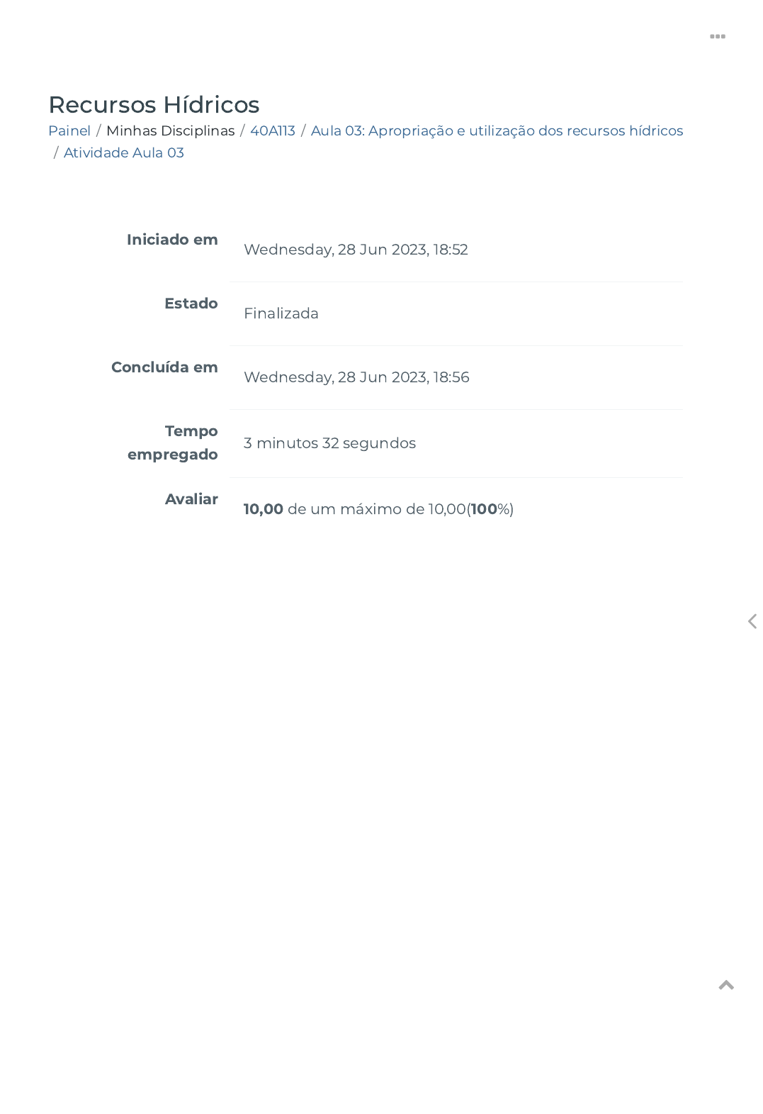 Painel / Minhas Disciplinas / 40A113 / Aula 03: Apropriação e utilização dos recursos hídricos / Atividade Aula 03 Recursos Hídricos Iniciado em Wednesday, 28 Jun 2023, 18:52 Estado Finalizada Concluída em Wednesday, 28 Jun 2023, 18:56 Tempo empregado 3 minutos 32 segundos Avaliar 10,00 de um máximo de 10,00(100%) https://ava.politecnicabr.com.br/my/ https://ava.politecnicabr.com.br/course/view.php?id=1055 https://ava.politecnicabr.com.br/course/view.php?id=1055#section-4 https://ava.politecnicabr.com.br/mod/quiz/view.php?id=33937 https://ava.politecnicabr.com.br/ https://ava.politecnicabr.com.br/ Questão 1 Correto Atingiu 2,00 de 2,00 Assinale Verdadeiro ou Falso referente aos mananciais urbanos: De acordo com o Ministério do Meio Ambiente, um manancial de abastecimento refere-se à fonte de água doce que pode ter sua origem super�cial ou subterrânea, a qual visa ao consumo humano ou à realização de atividades econômicas (BRASIL, 2017). Dessa forma, um manancial de abastecimento está associado à demanda de água nos diferentes centros populacionais, sendo o aumento do consumo desse recurso diretamente proporcional ao crescimento da população. De fato, quanto maior o número de habitantes em uma região, maior será a necessidade de água para atividades domésticas, dessedentação de animais e atividades comerciais e industriais. Essa demanda crescente, entretanto, vem aumentando a pressão sobre os mananciais de abastecimento, que são impactados pela ocupação inadequada do solo, pela escassez de chuvas para abastecimento, além da poluição hídrica e da falta de saneamento básico. Com efeito, o desenvolvimento urbano está vinculado à contaminação super�cial, o que compromete diretamente o ciclo hidrológico e os corpos hídricos associados. Em relação à classi�cação das fontes de suprimento de água, os mananciais urbanos dividem-se em águas super�ciais e águas subterrâneas. As águas super�ciais são constituídas, em sua maior parte, pelos rios presentes na bacia hidrográ�ca de determinada região. Entretanto, lagos, lagoas e, até mesmo, o oceano podem fazer parte desse grupo. A água super�cial é abastecida constantemente pela precipitação, que repõe o volume perdido durante os processos de evaporação e de in�ltração para abastecimento dos reservatórios subterrâneos. Os principais usos das águas super�ciais abrangem: distribuição de água potável e outros usos públicos; sistemas de irrigação; processos industriais; e refrigeração de equipamentos geradores de eletricidade, como na indústria termoelétrica. De toda a água de superfície utilizada, a maior parte (cerca de 90%) é constituída por águas doces, reiterando a importância da preservação de rios, lagos e reservatórios (BRAGA et al., 2015). A água salgada pode ser utilizada, por exemplo, na indústria termoelétrica e, em menor escala, para �ns industriais e de mineração. https://ava.politecnicabr.com.br/ https://ava.politecnicabr.com.br/ Escolha uma opção: Verdadeiro Falso https://ava.politecnicabr.com.br/ https://ava.politecnicabr.com.br/ Questão 2 Correto Atingiu 2,00 de 2,00 Com relação ao abastecimento humano, com o crescimento das cidades veio também a necessidade de fornecer um suprimento constante e seguro de água potável. Entende-se por água potável aquela que apresenta características de potabilidade, isto é, que apresenta sanidade adequada para ingestão humana ou preparo de alimentos, sem riscos à saúde. Nesse sentido, marque Verdadeiro ou Falso para as alternativas. ( ) Entre os parâmetros físicos que devem ser monitorados, estão: cor, turbidez e pH. Esses parâmetros devem ser veri�cados a cada dez horas, coletando amostras na saída do sistema de tratamento de água, no caso de um sistema convencional de abastecimento. No caso do sistema de distribuição, formado por reservatórios e pela rede de distribuição, o monitoramento deverá ser trimestral. ( ) No Brasil, a Portaria do Ministério da Saúde (MS) n. 1.469, de 29 de dezembro de 2000, estabelece os procedimentos necessários ao controle da qualidade da água destinada ao consumo humano. Esse texto apresenta, em seu anexo, uma Norma de Qualidade da Água para Consumo Humano, em que são de�nidas características físicas, químicas e biológicas de potabilidade da água. ( ) As águas avaliadas deverão apresentar um valor máximo permitido (VMP) de cor igual a 15 uH (unidade Hazen1), além de odor e sabor não objetáveis, em relação a critérios de referência. Para que ocorra o processo de desinfecção com cloro, etapa �nal da maior parte dos sistemas de tratamento de água, é necessário que o pH seja inferior a 8. Considerando-se sistemas de distribuição, como reservatórios e tubulações, o valor do pH deve estar entre 6 e 9,5. ( ) De acordo com a Norma estabelecida pelo Ministério da Saúde (BRASIL, 2000), o VMP para cianotoxinas (na forma de microcistina) é igual a 1 μg/L. Para outros parâmetros químicos importantes de monitoramento, como cloro livre e trihalometanos totais, este valor é de 5 mg/L e 0,1 mg/L, respectivamente. https://ava.politecnicabr.com.br/ https://ava.politecnicabr.com.br/ Escolha uma opção: a. F, V, F, V. b. F, V, V, V. c. V, V, V, V. d. F, F, F, V. e. F, F, V, V. https://ava.politecnicabr.com.br/ https://ava.politecnicabr.com.br/ Questão 3 Correto Atingiu 2,00 de 2,00 Marque Verdadeiro ou Falso: Nos últimos anos temos observado uma preocupação ambiental especi�camente com o reuso, ou a recuperação da água nas indústrias. Até mesmo o “fechamento de circuito” virou assunto predileto em congressos e em artigos técnicos. A reutilização da água dos circuitos de processo industrial é bem aceita e varia de acordo com os processos aplicados na indústria. A água utilizada nas indústrias tem uma peculiaridade que é ser, ao mesmo tempo, insumo e produto. Entretanto, o maior problema, s