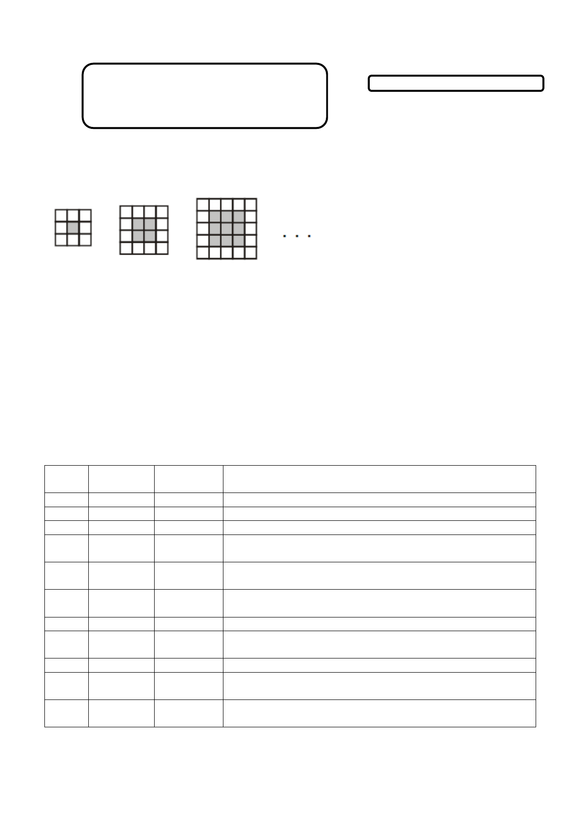 Disciplina: Matemática II Conteúdo: Sequências Alunos: Data: Cada figura desenhada apresenta uma moldura em torno dos quadrinhos pintados de cinza. Observe a sequência das figuras abaixo e responda: a) Desenhe a próxima figura dessa sequência. b) Preencha a tabela a seguir e observe o padrão de crescimento da quantidade total de quadrados da moldura em relação a posição da figura. Por fim, escreva uma expressão matemática que calcule o total de quadrados da moldura da figura de posição X. Figura Total de quadrados Quadrados escuros Quadradinhos da moldura 1ª 9 1 8 2ª 16 4 12 3ª 25 9 16 4ª 5ª 6ª ... ... ... ... 10ª ... ... ... ... 100ª xª Observe a sequência das figuras abaixo e responda: a) Desenhe a próxima figura dessa sequência. b) Preencha a tabela a seguir e observe o padrão de crescimento da quantidade total de quadrados da figura em relação a sua posição. Por fim, escreva uma expressão matemática que calcule o total de quadrados da figura de posição X. Figura Total de quadrados 1ª 3 2ª 8 3ª 24 4ª 5ª 6ª ... ... 10ª ... ... 100ª xª Observe a sequência das figuras abaixo e responda: a) Desenhe a próxima figura dessa sequência. b) Preencha a tabela a seguir e observe o padrão de crescimento da quantidade total de bolinhas da figura em relação a sua posição. Por fim, escreva uma expressão matemática que calcule o total de bolinhas da figura de posição X. Figura Total de bolinhas 1ª 1 2ª 3 3ª 6 4ª 10 5ª 6ª ... ... 10ª ... ... 100ª xª Disciplina: Matemática II Conteúdo: Sequências Alunos: Data: Observe a sequência das figuras abaixo e responda: a) Desenhe a próxima figura dessa sequência. b) Preencha a tabela a seguir e observe o padrão de crescimento da quantidade total de palitos da figura em relação a quantidade de quadrados. Por fim, escreva uma expressão matemática que calcule o total de palitos da figura com X quadrados. Quantidade de quadrados Total de palitos 1 5 2 9 3 13 4 5 6 ... ... 10 ... ... 100 X (FCC - Tribunal de Contas – 2006 – adaptada): Usando palitos de fósforos inteiros é possível construir a seguinte sucessão de figuras compostas por triângulos: a) Desenhe a próxima figura dessa sequência. b) Preencha a tabela a seguir e observe o padrão de crescimento da quantidade total de palitos da figura em relação a quantidade de triângulos. Por fim, escreva uma expressão matemática que calcule o total de palitos da figura com X triângulos. Quantidade de triângulos Total de palitos 1 3 2 5 3 7 4 9 5 6 ... ... 10 ... ... 100 X (Concurso CFS 2010 adaptada): Observe quatro figuras formadas com palitos de fósforo da seguinte sequência: a) Desenhe a próxima figura dessa sequência. b) Preencha a tabela a seguir e observe o padrão de crescimento da quantidade total de palitos da figura em relação a sua posição. Por fim, escreva uma expressão matemática que calcule o total de palitos da figura de posição X. Figura Total de palitos 1ª 5 2ª 12 3ª 19 4ª 26 5ª 6ª ... ... 10ª ... ... 100ª xª Observe as figuras formadas com quadradinhos escuros da seguinte sequência: a) Desenhe a próxima figura dessa sequência. b) Preencha a tabela a seguir e observe o padrão de crescimento da quantidade total de quadrados escuros da figura em relação a sua posição. Por fim, escreva uma expressão matemática que calcule o total de quadrados escuros da figura de posição X. Figura Total de quadrados Quadrados brancos Quadrados escuros 1ª 9 0 9 2ª 25 4 21 3ª 49 16 33 4ª 5ª 6ª ... ... 10ª ... ... 100ª xª Observe as figuras formadas com quadradinhos da seguinte sequência: a) Desenhe a próxima figura dessa sequência. b) Preencha a tabela a seguir e observe o padrão de crescimento da quantidade total de quadrados da figura em relação a sua posição. Por fim, escreva uma expressão matemática que calcule o total de quadrados da figura de posição X. Figura Total de quadrados 1ª 1 2ª 3 3ª 6 4ª 10 5ª 6ª ... ... 10ª ... ... 100ª xª Página 1 Página 2 Página 3 Página 4 Página 5 Página 6 Página 7 Página 8