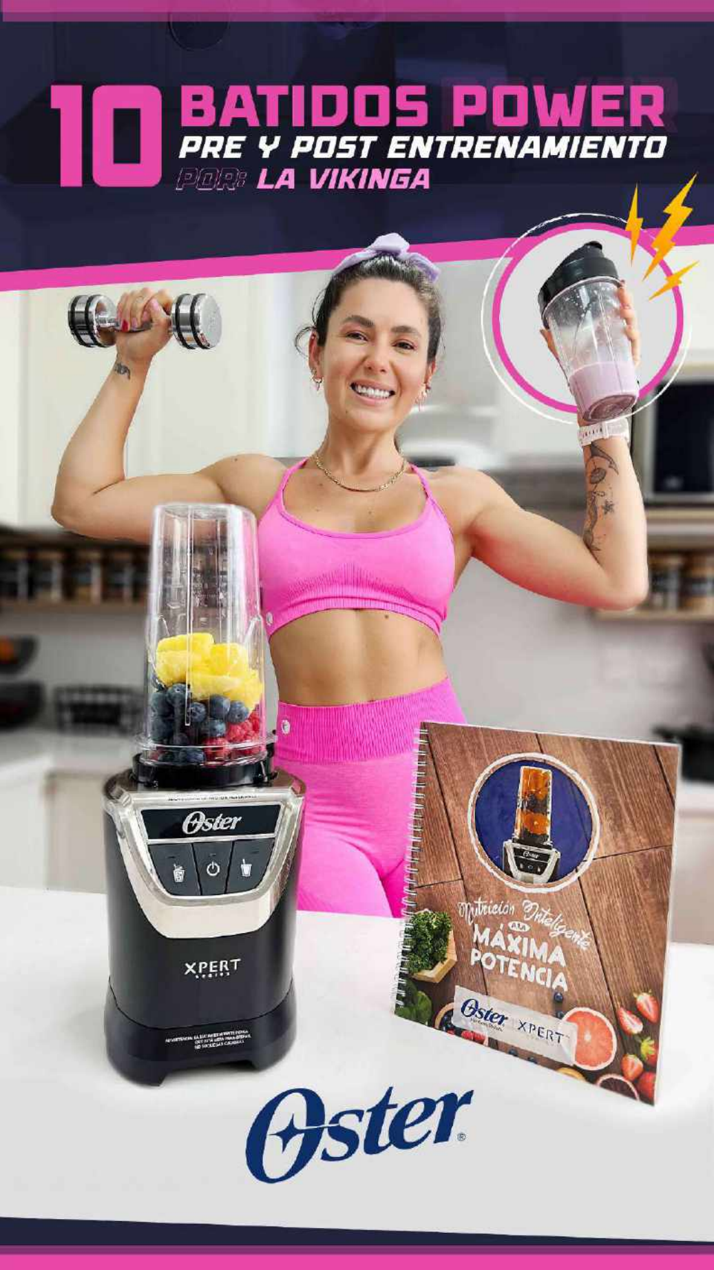 Hola, soy Solange Barslund ‘La Vikinga’, licenciada en Alto Rendimiento Deportivo, con más de 10 años de experiencia en el mundo fitness y especialista en entrenamiento de fuerza. La pregunta más recurrente que recibo de quienes entrenan en el gym o desean empezar a entrenar desde casa casi siempre es ¿Por dónde empiezo? Y eso en realidad depende del objetivo que tengas, ya sea bajar de peso, aumentar tu masa muscular o simplemente lograr hábitos saludables que te permitan mantener el peso y cuerpo que te guste. Pero indistintamente del objetivo que persigas hoy, tiene que estar acompañado de un entrenamiento que te agrade, y que disfrutes, para que lo puedas mantener en el tiempo. ¡Allí verás los mejores resultados! Recuerda que en este proceso es importante priorizar los descansos y tus horas de sueño, y, sobre todo, llevar una nutrición balanceada. Y para ayudarte a lograr mejores resultados, junto a Oster® pensamos en ‘10 recetas saludables pre y post entrenamiento para una nutrición inteligente a la máxima potencia’. En este camino tendremos un súper aliado: El Sistema de Nutrición de Oster®, que fue creado para personas que aman la vida saludable. Este increíble producto, transforma los ingredientes en jugos y batidos con la textura hasta 2 veces más cremosa, ideal para que todos esos nutrientes te llenen de vitalidad. Puedes incluso ponerle frutas congeladas, granos como la linaza, alimentos fibrosos como la espinaca y mucho más… Lo mejor es que cierras, aprietas el botón y tienes un batido personal, que además te lo puedes llevar donde quieras, ¡porque le pones la tapa y listo! Si te animas a tener tu propio Sistema de Nutrición en casa, te cuento que viene con un súper recetario, que me inspiró a compartir con ustedes preparaciones ricas y prácticas que favorecerán su pre y post entrenamiento. Ahora solo nos queda empezar y no parar hasta conseguir nuestros objetivos, porque una ‘vikinga’ ¡no abandona! Estos batidos pre-entrenamiento se recomiendan especialmente para aquellas personas que realizan un deporte intenso, que quieran ganar masa muscular o que entrenan en un horario muy alejado de la siguiente comida. Los batidos pre-entreno debes consumirlos 1 o 2 horas antes de tu entrenamiento, y deben incluir alimentos que te den energía rápida pero que no te generen tanta saciedad ni te sientas incómodo a la hora de entrenar. Coloca todos los ingredientes en el recipiente de la licuadora, selecciona la función ‘Frappés/Smoothies’,y mezcla hasta obtener la consistencia deseada. Si tu objetivo es bajar grasa o ganar masa, prioriza los entrenamientos de FUERZA. Cuando hablamos de fuerza, la mayoría de veces pensamos en miles de kilos o nos imaginamos a esos atletas de levantamientos olímpicos, pero para nosotros fuerza puede ser con tu propio peso e ir aumentando carga progresiva. • 1/2 plátano • 1 taza de bebida de almendra • 1 shot de café • 1/2 taza de hielo Ingredientes: Preparación: BENEFICIOS: TE DEJO UN TIP: El café es el mejor pre-entreno natural, está demostrado científicamente que la cafeína ayuda a mejorar la fuerza y la resistencia, será tu aliado perfecto para mejorar tu rendimiento deportivo en la sesión de entrenamiento. Coloca todos los ingredientes en el recipiente de la licuadora, selecciona la función ‘Jugos’, y mezcla hasta obtener la consistencia deseada. La avena es rica es carbohidratos y proteína, te mantiene saciado y evita picos de glucosa. ¿Sabías que la grasa ocupa más espacio que el músculo? Es por eso que debemos entrenar ejercicios de fuerza como sentadillas, flexiones, empujes, zancadas para evitar flacidez durante un plan de pérdida de peso. • 2 cucharadas de avena • 1 puñado de frutos rojos • 1 vaso de leche de coco Ingredientes: Preparación: Beneficios: TE DEJO UN TIP: Coloca todos los ingredientes en el recipiente de la licuadora, selecciona la función ‘Frappés/Smoothies’ y mezcla hasta obtener la consistencia deseada. El color verde oscuro de la espinaca indica que contiene altos niveles de carotenoides. ¿Qué quiere decir? Que tienen propiedades antiinflamatorias y anticancerosas, además es importante para la salud visual. Si eres de las personas que les cuesta incorporar la espinaca en sus comidas diarias, o simplemente no te gusta el sabor, este smoothie es la solución, porque combinado con la piña y la manzana sabe delicioso. Estoy segura que siempre te dijeron que debes hacer cardio para bajar de peso, pero si solo haces cardio es muy probable que también pierdas músculo, eso puede traer como consecuencia una piel flácida, y será mucho más difícil ganar masa nuevamente. Mi consejo es, que, si te gusta el cardio, ¡hazlo! Pero máximo entre 20 a 30 minutos suaves, y alejado de tu entrenamiento de fuerza. Por ejemplo, si corres o trotas por la mañana, entrena fuerza en la noche o viceversa. • 1/2 manzana verde • 1 taza de espinaca • 1 cucharadita de kion • 1 taza de piña en cubos • 1 vaso de agua • 1/2 taza de hielo Ingredientes: Preparación: Beneficios: TE DEJO UN TIP: Coloca todos los ingredientes en el recipiente de la licuadora, selecciona la función ‘Jugos’, y mezcla hasta obtener la consistencia deseada. La maca peruana es muy utilizada por deportistas como suplemento para mejorar el rendimiento al momento de entrenar, por esto es muy recomendable combinarla con una base de grasa vegetal, como la mantequilla de maní que contiene una grasa saludable. Si entrenas 3 veces por semana, prioriza ejercicios full body, es decir aquellos que incorporen todos los músculos del cuerpo. Si entrenas más de tres veces por semana, que sean por grupos musculares, es decir, lunes miércoles y viernes solo piernas y martes, jueves y sábado solo brazos. • 1 cucharada de mantequilla de maní • 1 plátano • 1 cucharada de maca • 1 taza de leche de almendra Ingredientes: Preparación: Beneficios: TE DEJO UN TIP: Coloca todo