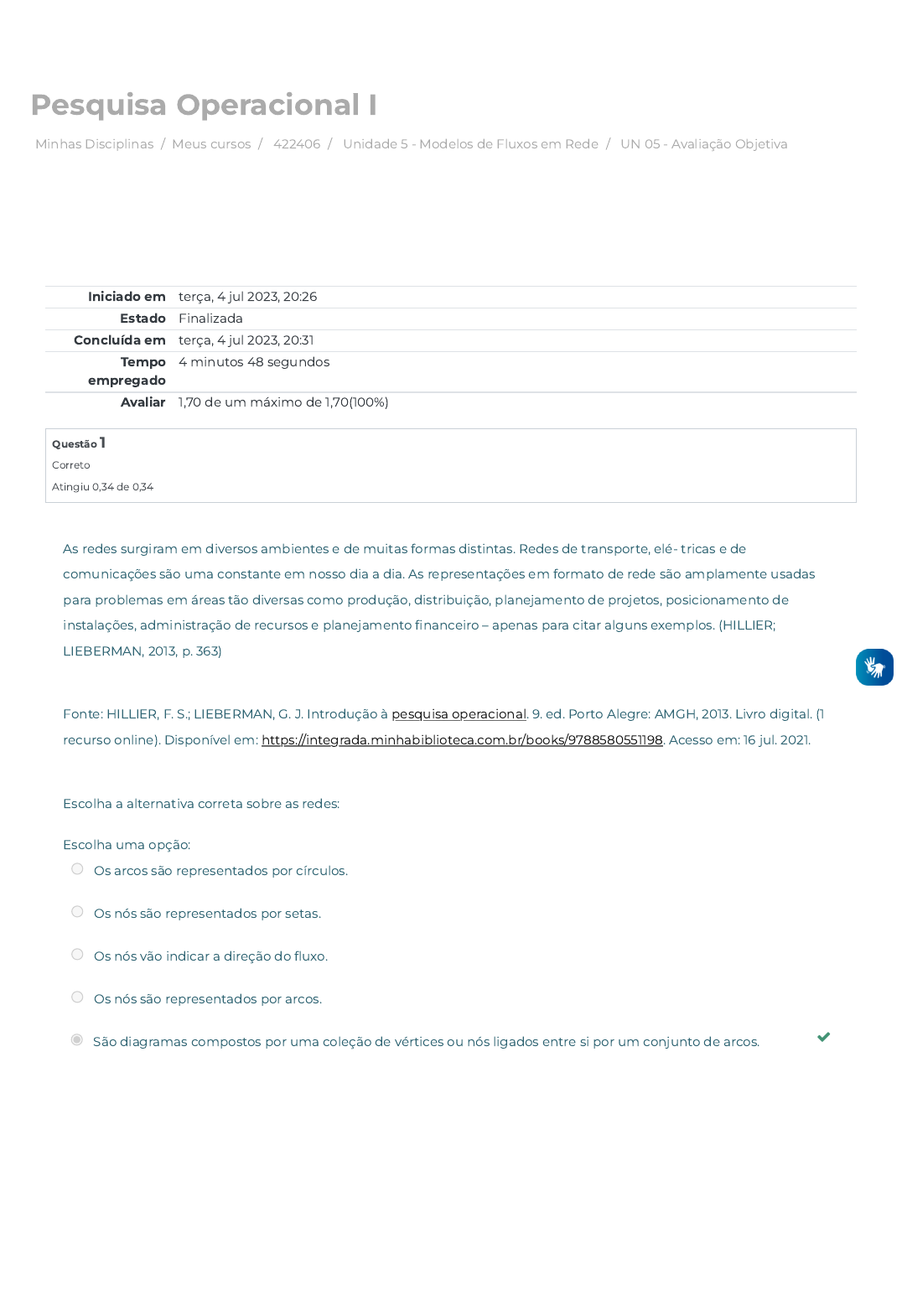 Minhas Disciplinas / Meus cursos / 422406 / Unidade 5 - Modelos de Fluxos em Rede / UN 05 - Avaliação Objetiva Pesquisa Operacional I Iniciado em terça, 4 jul 2023, 20:26 Estado Finalizada Concluída em terça, 4 jul 2023, 20:31 Tempo empregado 4 minutos 48 segundos Avaliar 1,70 de um máximo de 1,70(100%) Questão 1 Correto Atingiu 0,34 de 0,34 As redes surgiram em diversos ambientes e de muitas formas distintas. Redes de transporte, elé- tricas e de comunicações são uma constante em nosso dia a dia. As representações em formato de rede são amplamente usadas para problemas em áreas tão diversas como produção, distribuição, planejamento de projetos, posicionamento de instalações, administração de recursos e planejamento �nanceiro – apenas para citar alguns exemplos. (HILLIER; LIEBERMAN, 2013, p. 363) Fonte: HILLIER, F. S.; LIEBERMAN, G. J. Introdução à pesquisa operacional. 9. ed. Porto Alegre: AMGH, 2013. Livro digital. (1 recurso online). Disponível em: https://integrada.minhabiblioteca.com.br/books/9788580551198. Acesso em: 16 jul. 2021. Escolha a alternativa correta sobre as redes: Escolha uma opção: Os arcos são representados por círculos. Os nós são representados por setas. Os nós vão indicar a direção do �uxo. Os nós são representados por arcos. São diagramas compostos por uma coleção de vértices ou nós ligados entre si por um conjunto de arcos. https://avap.multivix.edu.br/my/ https://avap.multivix.edu.br/course/view.php?id=20352 https://avap.multivix.edu.br/course/view.php?id=20352§ion=6 https://avap.multivix.edu.br/mod/quiz/view.php?id=1312964 https://avap.multivix.edu.br/mod/lti/view.php?id=1312980 https://integrada.minhabiblioteca.com.br/books/9788580551198 Questão 2 Correto Atingiu 0,34 de 0,34 Questão 3 Correto Atingiu 0,34 de 0,34 (...) o �uxo pela rede pode se originar em mais de um nó e também pode terminar em mais de um nó, embora seja permitido a um problema do �uxo máximo ter somente uma única origem e um único escoadouro. Por exemplo, a rede de distribuição de uma empresa tem, comumente, diversas fábricas e vários clientes. Uma reformulação mais inteligente é usada para fazer que tal situação adapte-se ao problema do �uxo máximo. (HILLIER; LIEBERMAN, 2013, p. 378) Fonte: HILLIER, F. S.; LIEBERMAN, G. J. Introdução à pesquisa operacional. 9. ed. Porto Alegre: AMGH, 2013. Livro digital. (1 recurso online). Disponível em: https://integrada.minhabiblioteca.com.br/books/9788580551198. Acesso em: 17 jul. 2021. Escolha a alternativa correta sobre o algoritmo de �uxo máximo: Escolha uma opção: Maximizar o �uxo pela rede de distribuição de uma empresa, partindo de suas fábricas para chegar a seus clientes. Minimizar o �uxo de água por um sistema de aquedutos. Minimizar o �uxo de suprimentos de uma empresa, partindo de seus fornecedores para chegar até as suas fábricas. Minimizar o �uxo de veículos por uma rede de transportes. Minimizar o �uxo de petróleo por um sistema de tubulações. (...) um caminho aumentado é um caminho direcionado da origem para o escoadouro na rede residual, de modo que nele todo arco tenha capacidade residual estritamente positiva. Capacidade residual de caminho aumentado é a denominação para o mínimo dessas capacidades residuais, pois ele representa a quantidade de �uxo que pode ser adicionada de maneira viável ao caminho todo. (RODRIGUES, 2017, p. 76) Fonte: RODRIGUES, R. Pesquisa operacional. Porto Alegre: SER - SAGAH, 2017. Livro digital. (1 recurso online). Disponível em: https://integrada.minhabiblioteca.com.br/books/9788595020054. Acesso em: 17 jul. 2021. Escolha a alternativa correta sobre algoritmos: Escolha uma opção: Caso o algoritmo repita os passos várias vezes, os resultados serão viesados. Os algoritmos são usados somente para identi�car os componentes do modelo. Os algoritmos são usados para se encontrar uma solução única que não pode ser reproduzida. Os algoritmos são um padrão de passos que são seguidos iterativamente para se chegar ao resultado do modelo. O algoritmo não vai atender sempre ao propósito de orientar o passo a passo do modelo. https://avap.multivix.edu.br/mod/lti/view.php?id=1312980 https://integrada.minhabiblioteca.com.br/books/9788580551198 https://avap.multivix.edu.br/mod/lti/view.php?id=1312980 https://integrada.minhabiblioteca.com.br/books/9788595020054 Questão 4 Correto Atingiu 0,34 de 0,34 Questão 5 Correto Atingiu 0,34 de 0,34 Considere uma rede conectada e não direcionada com dois nós especiais chamados origem e destino. Associada a cada uma das ligações (arcos não direcionados) está uma distância não negativa. O objetivo é encontrar o caminho mais curto (o caminho com a distância total mínima) da origem ao destino. (HILLIER; LIEBERMAN, 2013, p. 363) Fonte: HILLIER, F. S.; LIEBERMAN, G. J. Introdução à pesquisa operacional. 9. ed. Porto Alegre: AMGH, 2013. Livro digital. (1 recurso online). Disponível em: https://integrada.minhabiblioteca.com.br/books/9788580551198. Acesso em: 17 jul. 2021. Escolha a alternativa correta sobre os algoritmos dos modelos de �uxo em rede: Escolha uma opção: O algoritmo do caminho mais curto tem por objetivo encontrar o n-ésimo nó mais próximo da origem. O algoritmo do caminho mais curto indica que os empates não conseguem solucionar os nós. O algoritmo do caminho mais curto não quer encontrar o menor caminho, mas sim o caminho de maior �uxo. O algoritmo do caminho mais curto indica que os empates fornecem os candidatos a serem excluídos. O algoritmo do caminho mais curto não incorpora as distâncias. Fluxo em rede é um método de análise da programação linear que se destaca pela minimização de uma função que depende do �uxo (custo/ lucro) em uma rede. Há vários modelos de �uxos em rede indicados para diversas aplicações. Isso permite o desenvolvimento de algoritmos especializados com grandes vantagens computacio