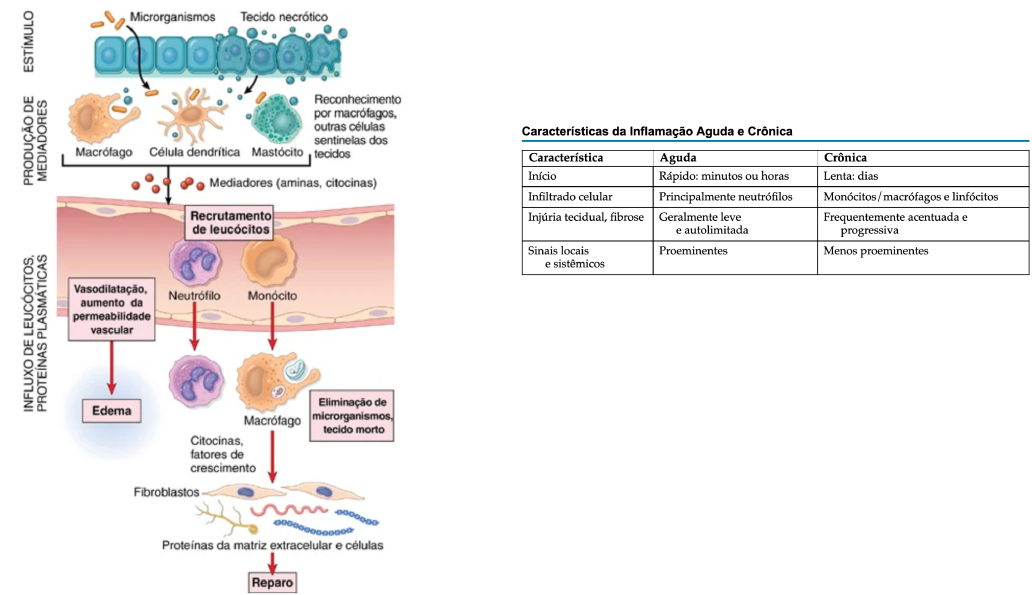 APG 14 POLLIANY FOLLMANN VISÃO GERAL DA INFLAMAÇÃO: DEFINIÇÕES E CARACTERÍSTICAS GERAIS Þ A inflamação é uma resposta dos tecidos vascularizados às infecções e aos danos teciduais que recruta células e moléculas do sistema de defesa do hospedeiro da circulação para os locais onde são necessários, a fim de eliminar os agentes agressores. Þ Ela é uma resposta protetora essencial para a sobrevivência. Þ A sua função é livrar o hospedeiro tanto da causa inicial da lesão celular (p. ex., microrganismos, toxinas) como das consequências dessa lesão (p. ex., células e tecidos necrosados). Þ Os mediadores dessa defesa incluem os leucócitos, fagocíticos, anticorpos e proteínas do complemento. Þ A maioria deles, circula no sangue, de onde são sequestrados para que não haja danos aos tecidos normais, mas podem ser rapidamente recrutados para qualquer local do corpo. Þ Algumas células envolvidas na resposta inflamatória também residem nos tecidos como sentinelas procurando constantemente as ameaças. Þ O processo inflamatório libera leucócitos e proteínas que são direcionados contra os agentes estranhos, como microrganismos e tecidos lesados ou necróticos, e ativam as células e moléculas recrutadas que, em seguida, exercem suas funções com a finalidade de eliminar as substâncias prejudiciais ou indesejadas. Þ Sem a inflamação, infecções não seriam reconhecidas, feridas nunca cicatrizariam e tecidos lesados permaneceriam constantemente purulentos. FIGURA: Sequência de eventos em uma reação inflamatória. Os macrófagos e outras células dos tecidos reconhecem os microrganismos e as células danificadas e liberam mediadores, que desencadeiam as reações vasculares e celulares da inflamação. Þ A reação inflamatória típica desenvolve-se por meio de etapas sequenciais: • O agente agressor, localizado nos tecidos extravasculares, é reconhecido pelas células e moléculas do hospedeiro. • Leucócitos e proteínas plasmáticas são recrutados da circulação para o local onde o agente agressor está localizado. • Leucócitos e proteínas são ativados e trabalham em conjunto para destruir e eliminar o agente lesivo. • A reação é controlada e encerrada. • O tecido danificado é reparado. Þ Existem dois tipos de inflamação: aguda e crônica. Þ A resposta inicial rápida às infecções e aos danos teciduais é denominada inflamação aguda, se desenvolve dentro de minutos ou horas e é de curta duração, entre algumas horas ou alguns dias. As suas características principais são a exsudação de líquido e proteínas plasmáticas (edema) e emigração de leucócitos, predominantemente neutrófilos (também chamados leucócitos polimorfonucleares). Quando a inflamação aguda atinge o objetivo de eliminar os agentes agressores, a reação diminui e a lesão residual é reparada. No entanto, se a resposta inicial não conseguir eliminar o estímulo desencadeador, a reação progride para um tipo de inflamação mais prolongada denominada inflamação crônica. Þ A inflamação crônica pode seguir a inflamação aguda ou surgir de novo. É uma reação de maior duração e está associada à maior destruição tecidual, presença de linfócitos e macrófagos, bem como proliferação de vasos e fibrose. Þ A inflamação é induzida por mediadores químicos que são produzidos por células hospedeiras em resposta aos estímulos nocivos. Quando um microrganismo penetra um tecido ou o tecido é lesado, a presença da infecção ou do dano é detectada pelas células residentes, incluindo macrófagos, células dendríticas, mastócitos e outros tipos celulares. Essas células secretam moléculas (citocinas e outros mediadores) que induzem e regulam a resposta inflamatória subsequente. Alguns desses mediadores promovem o efluxo de plasma e o recrutamento de leucócitos circulantes para o local onde o agente agressor está localizado. Os mediadores também ativam os leucócitos recrutados, aumentando sua capacidade de destruir e remover o agente agressor. Þ As manifestações externas da inflamação, muitas vezes chamados sinais cardinais, são: calor, rubor (vermelhidão), tumor (tumefação), dor e perda de função, essas manifestações da inflamação ocorrem como consequências das alterações vasculares, recrutamento e ativação de leucócitos. Þ Embora normalmente protetora, em algumas situações, a reação inflamatória torna-se a causa da doença, e os danos produzidos constituem a sua característica predominante. Por exemplo, reações inflamatórias relacionadas com infecções frequentemente são acompanhadas por lesão tecidual local e sinais e sintomas associados (p. ex., dor e dano funcional). No entanto, essas consequências prejudiciais são autolimitadas e se resolvem quando a inflamação diminui, deixando pouco ou nenhum dano permanente. Em contraste, existem muitas doenças para as quais a reação inflamatória é mal direcionada (p. ex., contra os próprios tecidos nas doenças autoimunes) ou a reação inflamatória ocorre contra substâncias ambientais normalmente inofensivas que provocam uma resposta imune (p. ex., nas alergias) ou é excessivamente prolongada (p. ex., nas infecções por microrganismos resistentes à erradicação). Þ Além da inflamação excessiva, a inflamação defeituosa também é responsável por doenças graves. Muita pouca inflamação, que normalmente se manifesta pelo aumento da suscetibilidade às infecções, é frequentemente causada pela redução no número de leucócitos, resultante da substituição da medula óssea pelo câncer, e supressão da medula óssea por terapias para o câncer e rejeição do enxerto. Devemos recordar que os leucócitos, as células da resposta inflamatória, são provenientes de células progenitoras da medula óssea; portanto, qualquer comprometimento da função da medula reduzirá a geração de leucócitos maduros. Þ A inflam