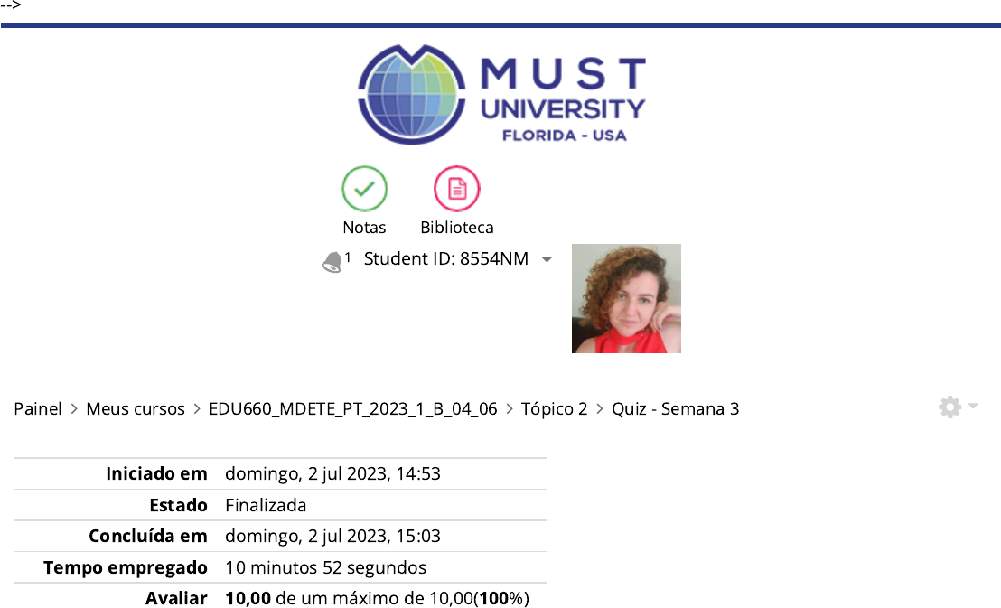 Painel Meus cursos EDU660_MDETE_PT_2023_1_B_04_06 Tópico 2 Quiz - Semana 3 --> Student ID: 8554NM Notas Biblioteca Iniciado em domingo, 2 jul 2023, 14:53 Estado Finalizada Concluída em domingo, 2 jul 2023, 15:03 Tempo empregado 10 minutos 52 segundos Avaliar 10,00 de um máximo de 10,00(100%) 1 https://my.mustedu.com/my/ https://my.mustedu.com/course/view.php?id=832 https://my.mustedu.com/course/view.php?id=832#section-2 https://my.mustedu.com/mod/quiz/view.php?id=67725 https://my.mustedu.com/ https://my.mustedu.com/ https://my.mustedu.com/user/view.php?id=8338&course=832 https://my.mustedu.com/custom/minhas_notas.php Questão 1 Correto Atingiu 1,00 de 1,00 Sobre a inteligência arti�cial observe as lacunas e em seguida encontre a alternativa que contém as informações corretas que as preenche: “O estudo e desenvolvimento das pesquisas em IA tiveram início na _______________________, quando se reuniram cientistas de diversas áreas, incluindo ______________, engenharia, matemática e computação para tratar sobre a criação de um cérebro arti�cial.” Acerca dessas asserções, assinale a alternativa correta: Escolha uma opção: a. Segunda Guerra Mundial, neurociência b. Primeira Guerra Mundial. física c. Segunda Guerra Mundial, contabilidade d. Primeira Guerra Mundial, química Sua resposta está correta. A resposta correta é: Segunda Guerra Mundial, neurociência Questão 2 Correto Atingiu 1,00 de 1,00 Podemos coletar variados tipos de dados educacionais. Pensando nisso, encontre a alternativa que não contém um desse tipos de dados pedagógicos: Escolha uma opção: a. hábitos de consumo b. censo educacional c. cálculos de frequência. d. atribuição de notas. Sua resposta está correta. A resposta correta é: hábitos de consumo Questão 3 Correto Atingiu 1,00 de 1,00 Big Data é o termo em Tecnologia da Informação (TI) que trata sobre grandes conjuntos de dados que precisam ser processados e armazenados, o conceito do Big Data se iniciou com 3 Vs: Velocidade, Volume e Variedade. Acerca do Big data avalie as a�rmativas: I- O big data serve tão somente aos negócios e ao mercado empresarial pois trabalha com a obtenção de informações sobre clientes e consumidores em potencial. II- O big data é um ferramenta tecnológica de exclusividade educacional, sendo aplicada tão somente em escolas, faculdades e universidades. III- As técnicas de big data estão conquistando espaço na educação, em que suas possibilidades de uso podem ser variadas. Elas podem ser aplicadas tanto para tornar a gestão de uma escola mais e�caz como para melhorar o desempenho dos alunos. É correto o que se a�rma: Escolha uma opção: a. apenas no item II. b. nos itens I, II e III. c. apenas nos itens II e III. d. apenas no item III. Sua resposta está correta. A resposta correta é: apenas no item III. Questão 4 Correto Atingiu 1,00 de 1,00 A educação alinhada às demandas da 4ª Revolução Industrial fez-se necessária, em momento oportuno. Pensando, são características da educação 4.0, EXCETO: Escolha uma opção: a. as máquinas inteligentes, automações e sistemas robotizados. b. as novas mídias e Big Data. c. a conectividade global e a facilidade de acesso ao conhecimento. d. a utilização de mídias como rádio e projetores de slides. Sua resposta está correta. A resposta correta é: a utilização de mídias como rádio e projetores de slides. Questão 5 Correto Atingiu 1,00 de 1,00 Sobre inteligência arti�cial, são apresentadas a seguir duas a�rmativas: A- O signi�cado de IA está relacionado à capacidade de as máquinas aprenderem a pensar e agir como humanos. B- A inteligência arti�cial ganhou força muito antes da revolução computacional, quando a máquina era à vapor. Com base na análise das proposições anteriores, pode-se a�rmar que: Escolha uma opção: a. a a�rmativa A é verdadeira e a B é falsa. b. ambas as a�rmativas são verdadeiras e a B complementa o que se a�rma em A. c. a a�rmativa A é falsa e a B é verdadeira. d. ambas as a�rmativas são falsas. Sua resposta está correta. A resposta correta é: a a�rmativa A é verdadeira e a B é falsa. Questão 6 Correto Atingiu 1,00 de 1,00 Sobre a Educação 5.0, avalie as duas proposições seguintes: A. É uma educação alinhada às demandas da 3ª Revolução Industrial e Digital. B. Surgiu da necessidade de atender às demandas educacionais das antigas gerações a partir da exclusividade do ensino híbrido. Com base na análise das proposições, pode-se a�rmar que: Escolha uma opção: a. A a�rmativa A é falsa e a B é verdadeira. b. ambas as a�rmativas são falsas. c. a a�rmativa A é verdadeira e a B é falsa. d. ambas as a�rmativas são verdadeiras. Sua resposta está correta. A resposta correta é: ambas as a�rmativas são falsas. Questão 7 Correto Atingiu 1,00 de 1,00 Ferramentas de tutoria inteligente incorporada à ciência da inteligência arti�cial têm sido desenvolvidas com o objetivo principal de: Escolha uma opção: a. melhorar o desempenho dos estudantes. b. proporcionar um aprendizado tradicional, porém inovador. c. aprimorar as ferramentas das plataformas o� line e on line. d. facilitar o trabalho desenvolvido pelo professor. Sua resposta está correta. A resposta correta é: melhorar o desempenho dos estudantes. Questão 8 Correto Atingiu 1,00 de 1,00 Avalie as a�rmações a seguir sobre computação cognitiva e aprendizado de máquina: I. Machine learning surgiu do reconhecimento de padrões e da teoria de que máquinas podem aprender sem serem programadas para realizar tarefas especí�cas. II. Aprendizado de máquina (em inglês, machine learning) é a ciência de fazer os computadores agirem sem comandos e é um método de análise de dados que automatiza a construção de modelos analíticos. Com base na análise das a�rmativas, pode-se a�rmar que: Escolha uma opção: a. A a�rmativa A é falsa e a B é verdade