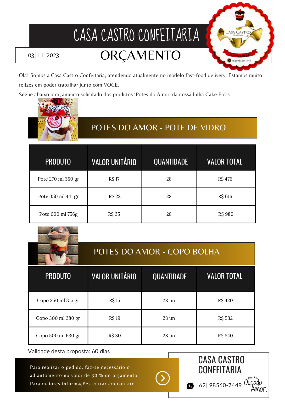 POTES DO AMOR - POTE DE VIDRO Pote 270 ml 350 gr R$ 17 28 R$ 476 Pote 350 ml 441 gr R$ 22 28 R$ 616 Pote 600 ml 756g R$ 35 28 R$ 980 Copo 250 ml 315 gr R$ 15 28 un R$ 420 Copo 300 ml 380 gr R$ 19 28 un R$ 532 Copo 500 ml 630 gr R$ 30 28 un R$ 840 POTES DO AMOR - COPO BOLHA Validade desta proposta: 60 dias ORÇAMENTO03| 11 |2023 Olá! Somos a Casa Castro Confeitaria, atendendo atualmente no modelo fast-food delivery. Estamos muito felizes em poder trabalhar junto com VOCÊ. Segue abaixo o orçamento solicitado dos produtos ‘Potes do Amor’ da nossa linha Cake Pot’s. Para maiores informações entrar em contato. CASA CASTRO CONFEITARIA [62] 98560-7449 PRODUTO VALOR UNITÁRIO QUANTIDADE VALOR TOTAL PRODUTO VALOR UNITÁRIO QUANTIDADE VALOR TOTAL CASA CASTRO CONFEITARIA Para realizar o pedido, faz-se necessário o adiantamento no valor de 30 % do orçamento.