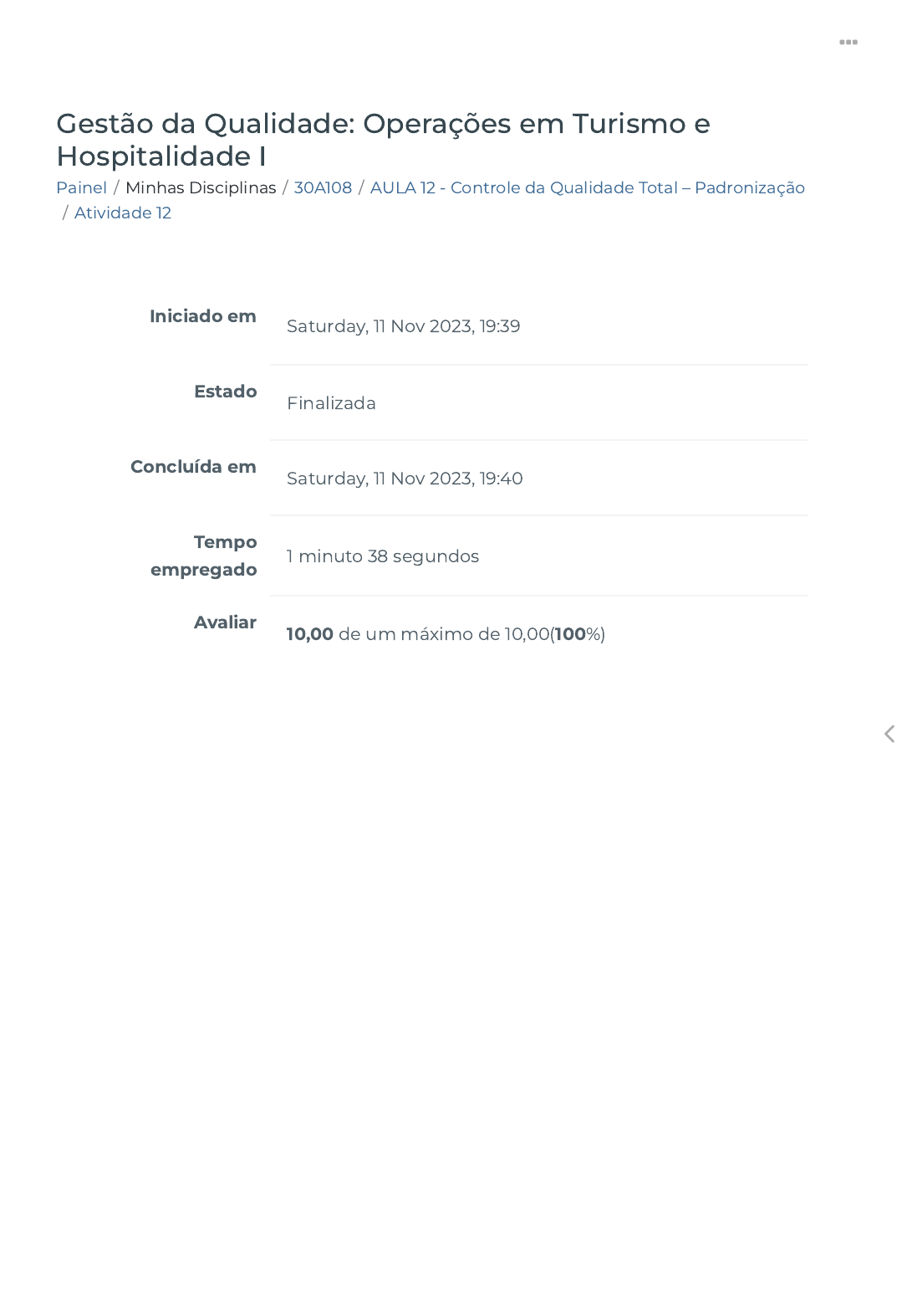11/11/2023, 19:40 Atividade 12 https://ava.politecnicabr.com.br/mod/quiz/review.php?attempt=5891514 1/6 Painel / Minhas Disciplinas / 30A108 / AULA 12 - Controle da Qualidade Total – Padronização / Atividade 12 Gestão da Qualidade: Operações em Turismo e Hospitalidade I Iniciado em Saturday, 11 Nov 2023, 19:39 Estado Finalizada Concluída em Saturday, 11 Nov 2023, 19:40 Tempo empregado 1 minuto 38 segundos Avaliar 10,00 de um máximo de 10,00(100%) https://ava.politecnicabr.com.br/my/ https://ava.politecnicabr.com.br/my/ https://ava.politecnicabr.com.br/course/view.php?id=1009 https://ava.politecnicabr.com.br/course/view.php?id=1009#section-13 https://ava.politecnicabr.com.br/mod/quiz/view.php?id=28493 https://ava.politecnicabr.com.br/ 11/11/2023, 19:40 Atividade 12 https://ava.politecnicabr.com.br/mod/quiz/review.php?attempt=5891514 2/6 Questão 1 Correto Atingiu 2,50 de 2,50 Faça a associação do ciclo PDCA com sua respectiva representação. C (check) A (act) D (do) P (plan) veri�car os resultados dos processos operacionais. agir para melhorar os processos operacionais. educar, treinar e acompanhar a realização dos processos opera estabelecer as metas e os métodos dos processos operacionais https://ava.politecnicabr.com.br/ 11/11/2023, 19:40 Atividade 12 https://ava.politecnicabr.com.br/mod/quiz/review.php?attempt=5891514 3/6 Questão 2 Correto Atingiu 2,50 de 2,50 A padronização é uma metodologia que tem por objetivo reduzir a variação dos processos produtivos por meio da uni�cação dos procedimentos, ou seja, os produtos devem atender aos requisitos dos clientes de forma a manter um padrão que varia dentro de limites que são preestabelecidos. Escolha uma opção: Verdadeiro Falso https://ava.politecnicabr.com.br/ 11/11/2023, 19:40 Atividade 12 https://ava.politecnicabr.com.br/mod/quiz/review.php?attempt=5891514 4/6 Questão 3 Correto Atingiu 2,50 de 2,50 A frase em destaque refere-se a qual etapa o processo de padronização. Essa etapa está relacionada com o desenvolvimento de competências para que os pro�ssionais possam estruturar os padrões, tanto da operação, quanto do gerenciamento dos processos. Escolha uma opção: a. Publicação e distribuição dos padrões. b. Preparação das pessoas. c. Elaboração de procedimentos d. Elaboração dos padrões. https://ava.politecnicabr.com.br/ 11/11/2023, 19:40 Atividade 12 https://ava.politecnicabr.com.br/mod/quiz/review.php?attempt=5891514 5/6 Questão 4 Correto Atingiu 2,50 de 2,50 É possível padronizar um processo isolado, uma área ou setor da empresa, e até a empresa como um todo. A aplicação da padronização por toda a empresa proporciona maiores ganhos e benefícios, pois cria uma “cultura da padronização”. O fator cultural pode contribuir para a padronização, quando se faz a opção de padronizar um processo isolado dentro de uma empresa. Escolha uma opção: Verdadeiro Falso Entre em Contato https://www.politecnicabr.com.br 0800 084 2627 0800 084 2627 Links Úteis Dicas da nossa Diretora Acadêmica Planner de Estudos Declaração de Matrícula Orientações do AVA Abertura de Ticket Fale com o Tutor Cronograma de Estudos Manual de Estágio Manual de Competência Siga-nos nas redes sociais https://www.politecnicabr.com.br/ https://soundcloud.com/user-501638417/sets/escola-politecnica-brasileira https://soundcloud.com/user-501638417/sets/escola-politecnica-brasileira https://storage.googleapis.com/sirius-pubstore/semestre_plannerdeestudo%20poli.pdf https://storage.googleapis.com/sirius-pubstore/semestre_plannerdeestudo%20poli.pdf https://storage.googleapis.com/sirius-pubstore/declaracao_matricula.pdf https://storage.googleapis.com/sirius-pubstore/declaracao_matricula.pdf https://storage.googleapis.com/sirius-pubstore/orientacoes_ava.pdf https://storage.googleapis.com/sirius-pubstore/orientacoes_ava.pdf https://storage.googleapis.com/sirius-pubstore/abertura_ticket.pdf https://storage.googleapis.com/sirius-pubstore/abertura_ticket.pdf https://storage.googleapis.com/sirius-pubstore/fale_com_tutor.pdf https://storage.googleapis.com/sirius-pubstore/fale_com_tutor.pdf https://storage.googleapis.com/sirius-pubstore/cronograma_estudos.pdf https://storage.googleapis.com/sirius-pubstore/cronograma_estudos.pdf https://storage.googleapis.com/sirius-pubstore/manual_estagio.pdf https://storage.googleapis.com/sirius-pubstore/manual_estagio.pdf https://storage.googleapis.com/sirius-pubstore/manual_competencia.pdf https://storage.googleapis.com/sirius-pubstore/manual_competencia.pdf https://ava.politecnicabr.com.br/ 11/11/2023, 19:40 Atividade 12 https://ava.politecnicabr.com.br/mod/quiz/review.php?attempt=5891514 6/6 © 2022 - Escola Politécnica Brasileira https://ava.politecnicabr.com.br/mod/quiz/0 https://ava.politecnicabr.com.br/mod/quiz/0 https://www.facebook.com/politecnicabr https://www.instagram.com/politecnicabr_oficial https://ava.politecnicabr.com.br/