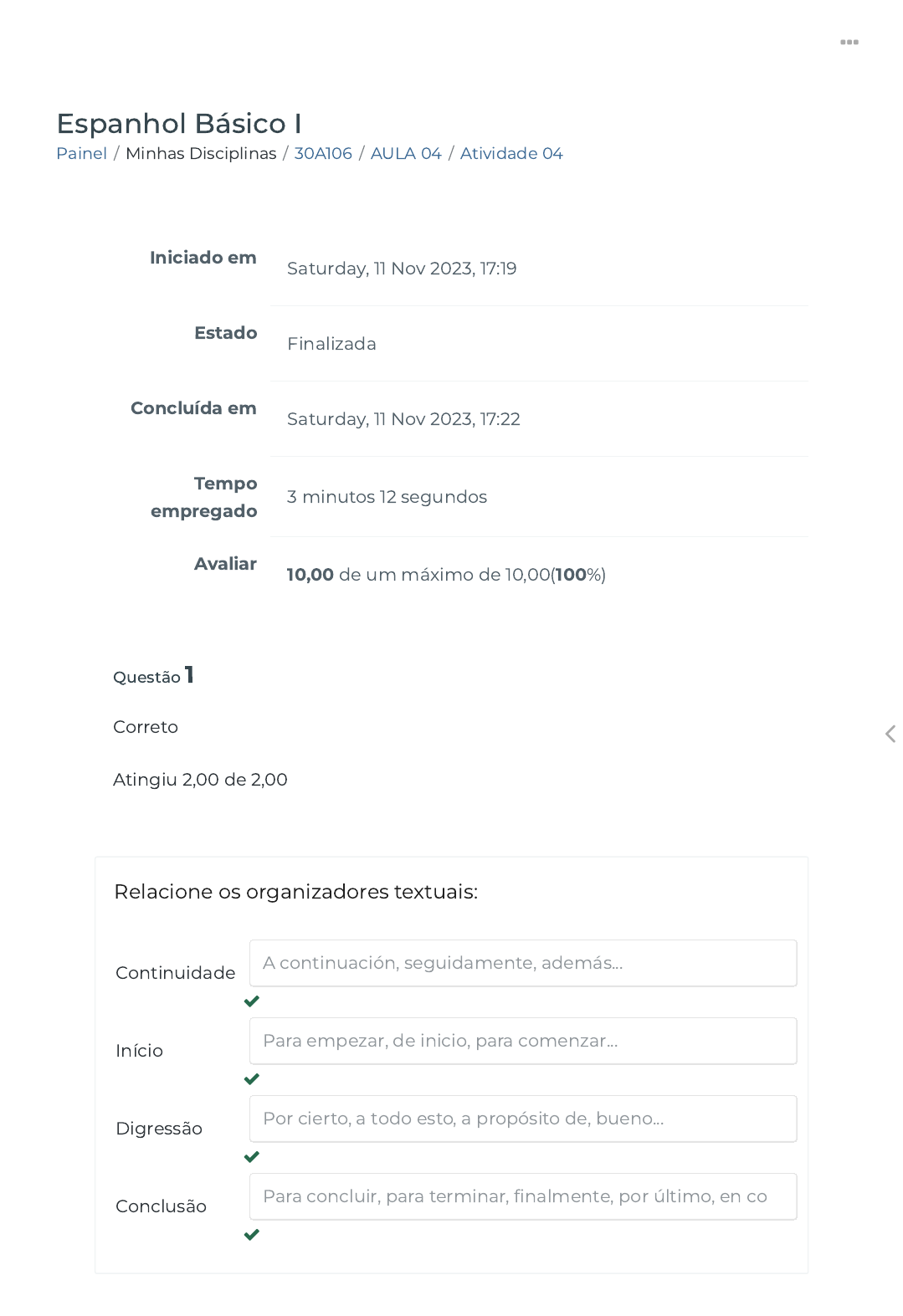 11/11/2023, 17:22 Atividade 04 https://ava.politecnicabr.com.br/mod/quiz/review.php?attempt=5891132 1/4 Painel / Minhas Disciplinas / 30A106 / AULA 04 / Atividade 04 Espanhol Básico I Iniciado em Saturday, 11 Nov 2023, 17:19 Estado Finalizada Concluída em Saturday, 11 Nov 2023, 17:22 Tempo empregado 3 minutos 12 segundos Avaliar 10,00 de um máximo de 10,00(100%) Questão 1 Correto Atingiu 2,00 de 2,00 Relacione os organizadores textuais: Continuidade Início Digressão Conclusão A continuación, seguidamente, además... Para empezar, de inicio, para comenzar... Por cierto, a todo esto, a propósito de, bueno... Para concluir, para terminar, �nalmente, por último, en co https://ava.politecnicabr.com.br/my/ https://ava.politecnicabr.com.br/my/ https://ava.politecnicabr.com.br/course/view.php?id=1006 https://ava.politecnicabr.com.br/course/view.php?id=1006#section-5 https://ava.politecnicabr.com.br/mod/quiz/view.php?id=28510 https://ava.politecnicabr.com.br/ 11/11/2023, 17:22 Atividade 04 https://ava.politecnicabr.com.br/mod/quiz/review.php?attempt=5891132 2/4 Questão 2 Correto Atingiu 2,00 de 2,00 Assinale a alternativa correta. É uma exceção em que os pronomes aparecem depois dos verbos: Escolha uma opção: Questão 3 Correto Atingiu 2,00 de 2,00 Em espanhol, precisamos prestar bastante atenção nas regras de colocação dos pronomes pessoais átonos, levando em consideração a alta incidência dessa classe de palavras no uso da língua. Escolha uma opção: a. Quando o verbo está no particípio. b. Quando o verbo está no imperativo a�rmativo. c. Quando o verbo está no imperativo negativo. d. Quando o verbo está no presente do indicativo. Verdadeiro Falso https://ava.politecnicabr.com.br/ 11/11/2023, 17:22 Atividade 04 https://ava.politecnicabr.com.br/mod/quiz/review.php?attempt=5891132 3/4 Questão 4 Correto Atingiu 2,00 de 2,00 Relacione os pronomes átomos com a pessoa gramatical: 2ª 3ª 1ª Questão 5 Correto Atingiu 2,00 de 2,00 No imperativo negativo ocorre uma modi�cação na 1ª pessoa (tú/vosotros), cujas terminações seguem a mesma desinência do modo subjuntivo. Escolha uma opção: te lo, la, le, se me Verdadeiro Falso https://ava.politecnicabr.com.br/ 11/11/2023, 17:22 Atividade 04 https://ava.politecnicabr.com.br/mod/quiz/review.php?attempt=5891132 4/4 © 2022 - Escola Politécnica Brasileira Entre em Contato https://www.politecnicabr.com.br 0800 084 2627 0800 084 2627 Links Úteis Dicas da nossa Diretora Acadêmica Planner de Estudos Declaração de Matrícula Orientações do AVA Abertura de Ticket Fale com o Tutor Cronograma de Estudos Manual de Estágio Manual de Competência Siga-nos nas redes sociais https://ava.politecnicabr.com.br/mod/quiz/0 https://ava.politecnicabr.com.br/mod/quiz/0 https://www.politecnicabr.com.br/ https://soundcloud.com/user-501638417/sets/escola-politecnica-brasileira https://soundcloud.com/user-501638417/sets/escola-politecnica-brasileira https://storage.googleapis.com/sirius-pubstore/semestre_plannerdeestudo%20poli.pdf https://storage.googleapis.com/sirius-pubstore/semestre_plannerdeestudo%20poli.pdf https://storage.googleapis.com/sirius-pubstore/declaracao_matricula.pdf https://storage.googleapis.com/sirius-pubstore/declaracao_matricula.pdf https://storage.googleapis.com/sirius-pubstore/orientacoes_ava.pdf https://storage.googleapis.com/sirius-pubstore/orientacoes_ava.pdf https://storage.googleapis.com/sirius-pubstore/abertura_ticket.pdf https://storage.googleapis.com/sirius-pubstore/abertura_ticket.pdf https://storage.googleapis.com/sirius-pubstore/fale_com_tutor.pdf https://storage.googleapis.com/sirius-pubstore/fale_com_tutor.pdf https://storage.googleapis.com/sirius-pubstore/cronograma_estudos.pdf https://storage.googleapis.com/sirius-pubstore/cronograma_estudos.pdf https://storage.googleapis.com/sirius-pubstore/manual_estagio.pdf https://storage.googleapis.com/sirius-pubstore/manual_estagio.pdf https://storage.googleapis.com/sirius-pubstore/manual_competencia.pdf https://storage.googleapis.com/sirius-pubstore/manual_competencia.pdf https://www.facebook.com/politecnicabr https://www.instagram.com/politecnicabr_oficial https://ava.politecnicabr.com.br/