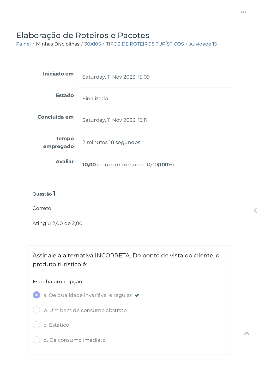 11/11/2023, 15:11 Atividade 15 https://ava.politecnicabr.com.br/mod/quiz/review.php?attempt=5890627 1/5 Painel / Minhas Disciplinas / 30A105 / TIPOS DE ROTEIROS TURÍSTICOS / Atividade 15 Elaboração de Roteiros e Pacotes Iniciado em Saturday, 11 Nov 2023, 15:09 Estado Finalizada Concluída em Saturday, 11 Nov 2023, 15:11 Tempo empregado 2 minutos 18 segundos Avaliar 10,00 de um máximo de 10,00(100%) Questão 1 Correto Atingiu 2,00 de 2,00 Assinale a alternativa INCORRETA. Do ponto de vista do cliente, o produto turístico é: Escolha uma opção: a. De qualidade invariável e regular b. Um bem de consumo abstrato c. Estático d. De consumo imediato https://ava.politecnicabr.com.br/my/ https://ava.politecnicabr.com.br/my/ https://ava.politecnicabr.com.br/course/view.php?id=1005 https://ava.politecnicabr.com.br/course/view.php?id=1005#section-17 https://ava.politecnicabr.com.br/mod/quiz/view.php?id=32106 https://ava.politecnicabr.com.br/ 11/11/2023, 15:11 Atividade 15 https://ava.politecnicabr.com.br/mod/quiz/review.php?attempt=5890627 2/5 Questão 2 Correto Atingiu 2,00 de 2,00 Leia a a�rmativa abaixo e assinale a alternativa correta. Privativos ou regulares são sempre realizados pelo receptivo local no deslocamento dos turistas e suas bagagens dos terminais de passageiros aos meios de hospedagem. Escolha uma opção: a. Translados b. City tour c. Checkin d. Standard https://ava.politecnicabr.com.br/ 11/11/2023, 15:11 Atividade 15 https://ava.politecnicabr.com.br/mod/quiz/review.php?attempt=5890627 3/5 Questão 3 Correto Atingiu 2,00 de 2,00 Os custos indiretos dos pacotes podem ser, EXCETO: Escolha uma opção: Questão 4 Correto Atingiu 2,00 de 2,00 O consumidor está muito mais informado e, por consequência, mais exigente. Uma consulta na internet, um artigo em revista ou guia especializado, ou a opinião de um amigo podem contribuir na decisão de uma viagem. As fontes de referência não estão mais apenas nas agências de turismo, é mais comum que o cliente vá à agência apenas para formalizar a viagem. Escolha uma opção: a. Encargos em geral b. Publicidade c. Passagens aéreas d. Folhetos Verdadeiro Falso https://ava.politecnicabr.com.br/ 11/11/2023, 15:11 Atividade 15 https://ava.politecnicabr.com.br/mod/quiz/review.php?attempt=5890627 4/5 Questão 5 Correto Atingiu 2,00 de 2,00 Faça a associação quanto as características de um roteiro. Elasticidade Sensibilidade Sazonalidade O turismo é dinâmico, marcado por contínuos movimento As pessoas podem deixar de viajar se há algum tipo de inc O produto turístico de maneira geral é concentrado em ce Entre em Contato https://www.politecnicabr.com.br 0800 084 2627 0800 084 2627 Links Úteis Dicas da nossa Diretora Acadêmica Planner de Estudos Declaração de Matrícula Orientações do AVA Abertura de Ticket Fale com o Tutor Cronograma de Estudos Manual de Estágio Manual de Competência Siga-nos nas redes sociais https://www.politecnicabr.com.br/ https://soundcloud.com/user-501638417/sets/escola-politecnica-brasileira https://soundcloud.com/user-501638417/sets/escola-politecnica-brasileira https://storage.googleapis.com/sirius-pubstore/semestre_plannerdeestudo%20poli.pdf https://storage.googleapis.com/sirius-pubstore/semestre_plannerdeestudo%20poli.pdf https://storage.googleapis.com/sirius-pubstore/declaracao_matricula.pdf https://storage.googleapis.com/sirius-pubstore/declaracao_matricula.pdf https://storage.googleapis.com/sirius-pubstore/orientacoes_ava.pdf https://storage.googleapis.com/sirius-pubstore/orientacoes_ava.pdf https://storage.googleapis.com/sirius-pubstore/abertura_ticket.pdf https://storage.googleapis.com/sirius-pubstore/abertura_ticket.pdf https://storage.googleapis.com/sirius-pubstore/fale_com_tutor.pdf https://storage.googleapis.com/sirius-pubstore/fale_com_tutor.pdf https://storage.googleapis.com/sirius-pubstore/cronograma_estudos.pdf https://storage.googleapis.com/sirius-pubstore/cronograma_estudos.pdf https://storage.googleapis.com/sirius-pubstore/manual_estagio.pdf https://storage.googleapis.com/sirius-pubstore/manual_estagio.pdf https://storage.googleapis.com/sirius-pubstore/manual_competencia.pdf https://storage.googleapis.com/sirius-pubstore/manual_competencia.pdf https://ava.politecnicabr.com.br/ 11/11/2023, 15:11 Atividade 15 https://ava.politecnicabr.com.br/mod/quiz/review.php?attempt=5890627 5/5 © 2022 - Escola Politécnica Brasileira https://ava.politecnicabr.com.br/mod/quiz/0 https://ava.politecnicabr.com.br/mod/quiz/0 https://www.facebook.com/politecnicabr https://www.instagram.com/politecnicabr_oficial https://ava.politecnicabr.com.br/