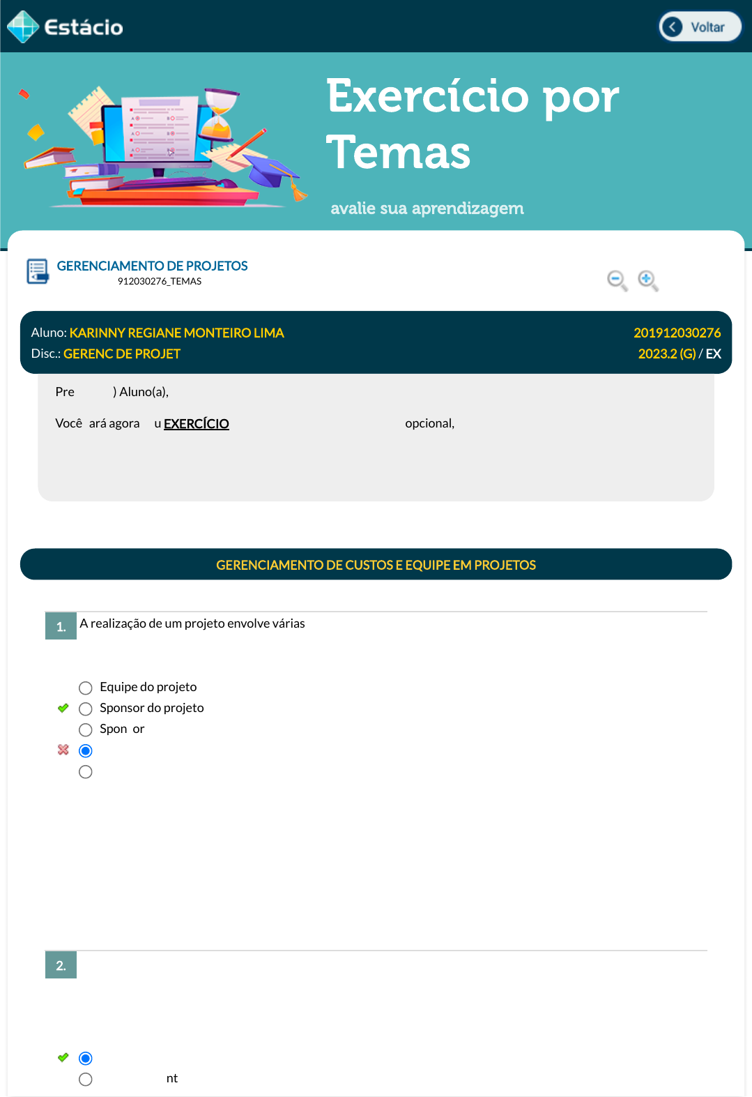 12/11/2023, 14:43 Estácio: Alunos https://simulado.estacio.br/alunos/ 1/5 Exercício por Temas avalie sua aprendizagem A realização de um projeto envolve várias partes interessadas, conhecidas como stakeholders, cada uma destas partes tem um papel importante para a realização do projeto e o seu sucesso. Nesta divisão de atividades e responsabilidades, quem está a cargo de realizar a aprovação formal do produto do projeto? O gerente de projetos precisa ser um pro�ssional multidisciplinar e completo porque ao mesmo tempo que precisa ter um bom nível de conhecimento técnico necessário para liderar as atividades do projeto, precisa também ter a capacidade de transmitir essas informações para todos os stakeholders (partes interessadas). Em qual atividade de gerenciamento de projeto é estimado que um gerente de projetos costuma dedicar cerca de 90% de todo o seu tempo e, por suas características, é chave para o sucesso do projeto? GERENCIAMENTO DE PROJETOS Lupa ARA1358_201912030276_TEMAS Aluno: KARINNY REGIANE MONTEIRO LIMA Matr.: 201912030276 Disc.: GERENC DE PROJET 2023.2 (G) / EX Prezado (a) Aluno(a), Você fará agora seu EXERCÍCIO! Lembre-se que este exercício é opcional, mas não valerá ponto para sua avaliação. O mesmo será composto de questões de múltipla escolha. Após responde cada questão, você terá acesso ao gabarito comentado e/ou à explicação da mesma. Aproveite para se familiarizar com este modelo de questões que será usado na sua AV e AVS. GERENCIAMENTO DE CUSTOS E EQUIPE EM PROJETOS 1. Equipe do projeto Sponsor do projeto Sponsor do produto Gerente do projeto Gerente de produto Data Resp.: 12/11/2023 14:42:26 Explicação: Sponsor do projeto é o patrocinador �nanceiro do projeto que aprova formalmente o produto do projeto, seja nas etapas intermediárias, seja no encerramento do projeto e determina os riscos aceitáveis. 2. Gerenciamento das comunicações Gerenciamento do orçamento javascript:voltar(); javascript:voltar(); javascript:voltar(); javascript:voltar(); javascript:diminui(); javascript:diminui(); javascript:aumenta(); javascript:aumenta(); 12/11/2023, 14:43 Estácio: Alunos https://simulado.estacio.br/alunos/ 2/5 O gerenciamento de custos é uma atividade chave para o sucesso de um projeto, uma vez que um gerenciamento de custos bem feito pode garantir o sucesso �nanceiro da companhia com a correta implementação do projeto. A este respeito considere as a�rmações abaixo. I. Investimentos são gastos que devem trazer benefícios futuros para a empresa. II. Despesas são gastos ligados à compra de máquinas e matérias-primas. III. Custos são gastos realizados com as atividades gerenciais da empresa. IV. Perdas são gastos não planejados , ocasionais ou indesejados. É correto o que se a�rma em : O gerenciamento das comunicações em projetos é uma das atividades que mais consomem o tempo de um gerente de projetos. Acerca da gestão da comunicação avalie as asserções abaixo e a relação entre elas. I. O gerenciamento da comunicação pode ser feito de várias maneiras, mas para o PMBOK ele é realizado em 2 etapas. PORQUE II. A partir da estratégia de comunicação se pode monitorar as comunicações e medir o seu nível de engajamento. Assinale a alternativa correta: Gerenciamento de tempo Planejamento de atividades Gerenciamento de equipes Data Resp.: 12/11/2023 14:42:30 Explicação: Pesquisas apontam que 90% do tempo do gerente de projetos está associado à comunicação, por isso esta é a sua habilidade mais importante. Esforços sobre as comunicações do projeto precisam ser realizados para que não haja mal entendidos e distorções nas informações do projeto. Os 5Cs da comunicação devem ser seguidos para evitar que isso aconteça. A comunicação deve ser: correta, concisa, clara, coerente e controlada. 3. II e III apenas. I e II apenas. I e IV apenas. I, II, III e IV. I, II e IV apenas. Data Resp.: 12/11/2023 14:42:34 Explicação: II. Despesas são gastos ligados às atividades gerenciais da empresa, como despesas de vendas, despesas administrativas e despesas �nanceiras III. Custos são gastos realizados no processo de elaboração de um bem ou serviço. 4. A asserção I é uma proposição falsa, e a II é uma proposição verdadeira. As asserções I e II são proposições falsas. 12/11/2023, 14:43 Estácio: Alunos https://simulado.estacio.br/alunos/ 3/5 A partir dos estudos acerca da teoria da comunicação, sabemos que em uma transmissão de mensagem temos 3 atores, o emissor, o meio e o receptor. Sabendo da importância que a comunicação tem para o sucesso de um projeto e para a adequada realização das atividades de um gerente de projeto, assinale a alternativa que apresenta quais são os tipos de comunicação existentes. As boas práticas de gerenciamento de projetos são organizadas pelo Project Management Institute (PMI). Como chamamos o guia que organiza esses conhecimentos? O PMBOK de�ne quatro processos quando se trata do gerenciamento de custos. Sobre este processo, avalie as asserções abaixo e a relação entre elas. I. A estimativa de custos de um projeto é realizada com base nas informações que se conhecem naquele momento. PORQUE II. Uma vez realizada as estimativas não são necessárias validações e re�nações futuras. A asserção I é uma proposição verdadeira, e a II é uma proposição falsa As asserções I e II são proposições verdadeiras, mas a II não é uma justi�cativa da I. As asserções I e II são proposições verdadeiras, e a II é uma justi�cativa da I. Data Resp.: 12/11/2023 14:42:42 Explicação: A comunicação bem-sucedida é realizada em duas partes. A primeira envolve uma estratégica de comunicação apropriada, com base nas necessidades do projeto e das partes interessadas. A partir da estratégia, é desenvolvido um plano de gerenciamento das comunicações para garantir que as mensagens apropriadas sejam comunicadas 